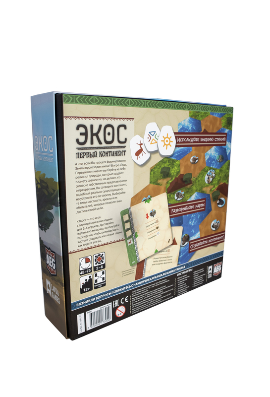 Экос – это игра с одновременными ходами для 2–6 игроков. Доставайте жетоны из мешочка, используйте их энергию, чтобы активировать карты и создавать континент таким, как видите его вы.