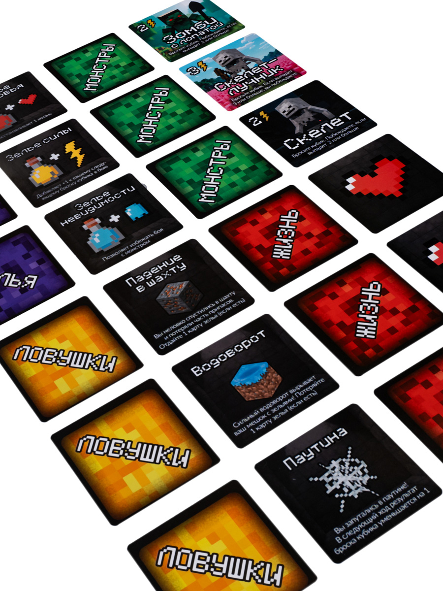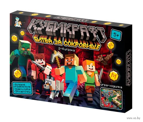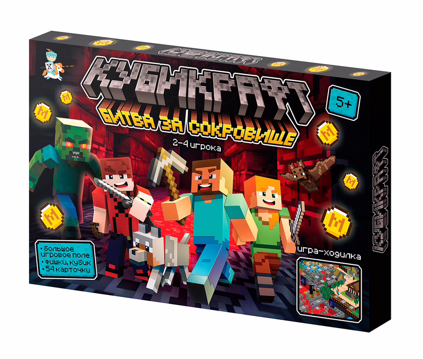 Настольная игра "Кубикрафт". Битва за сокровища – это захватывающая настольная игра, которая объединяет стратегию, удачу и дух приключений! Вам предстоит отправиться в интересное путешествие, преодолевая ловушки, сражаясь с персонажами и собирая зелья, чтобы добраться до финальной битвы с боссом.