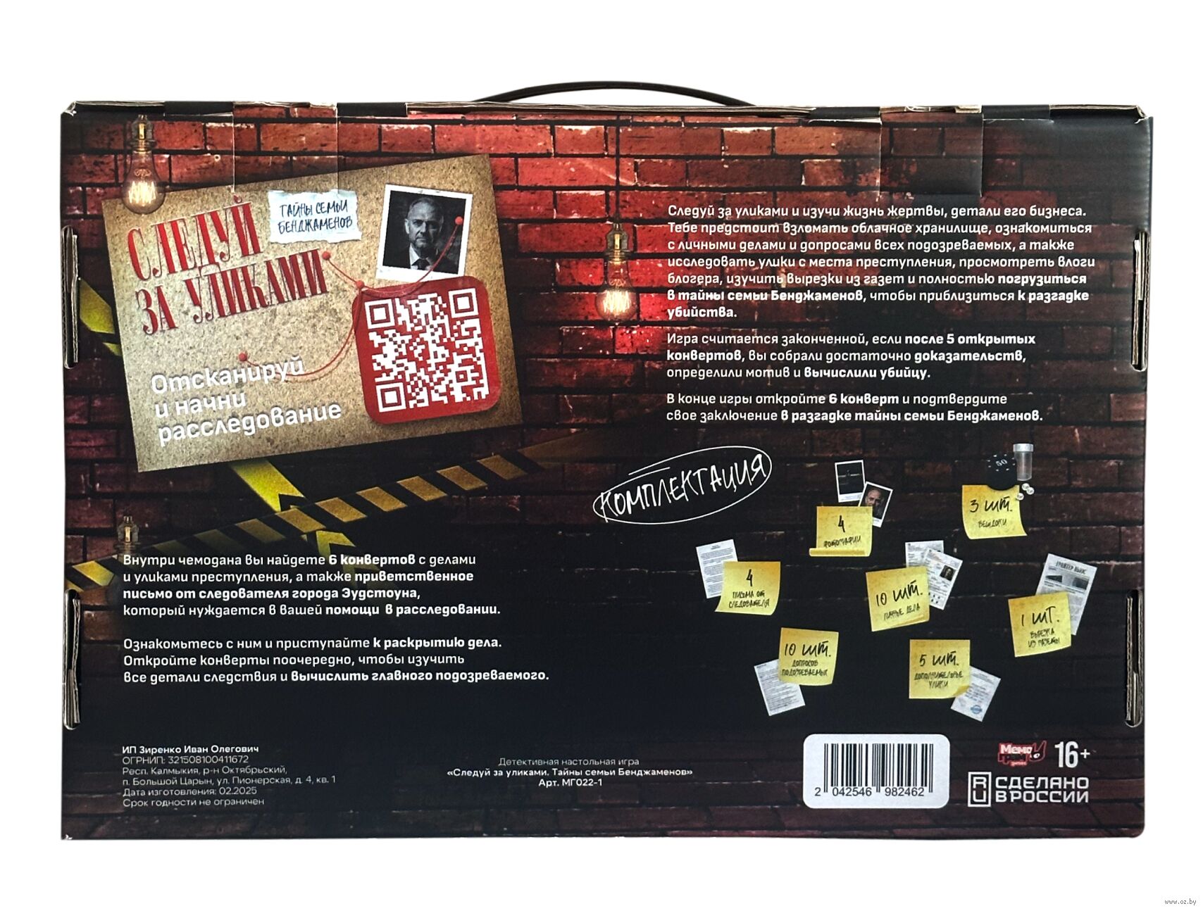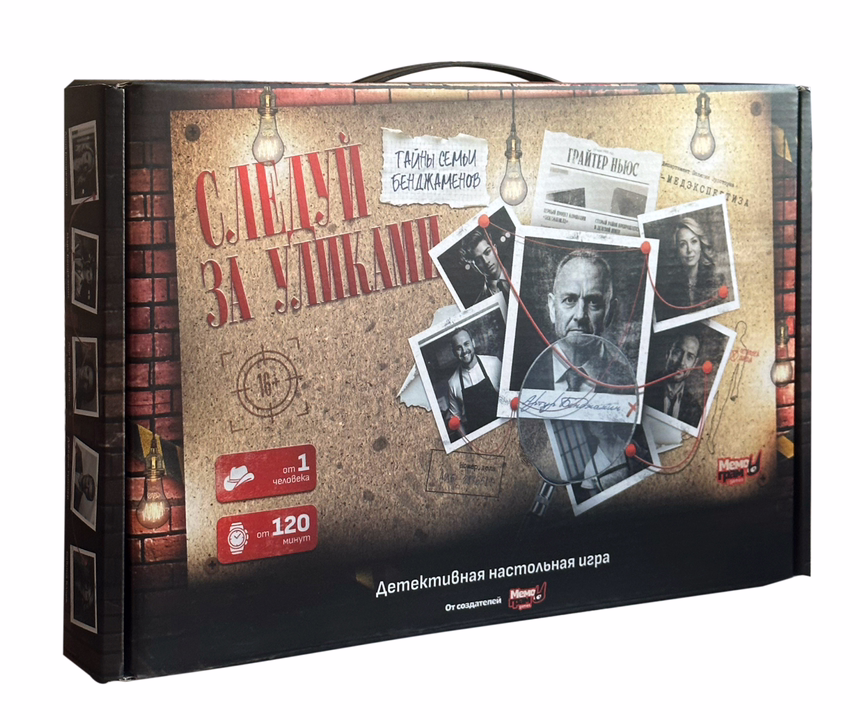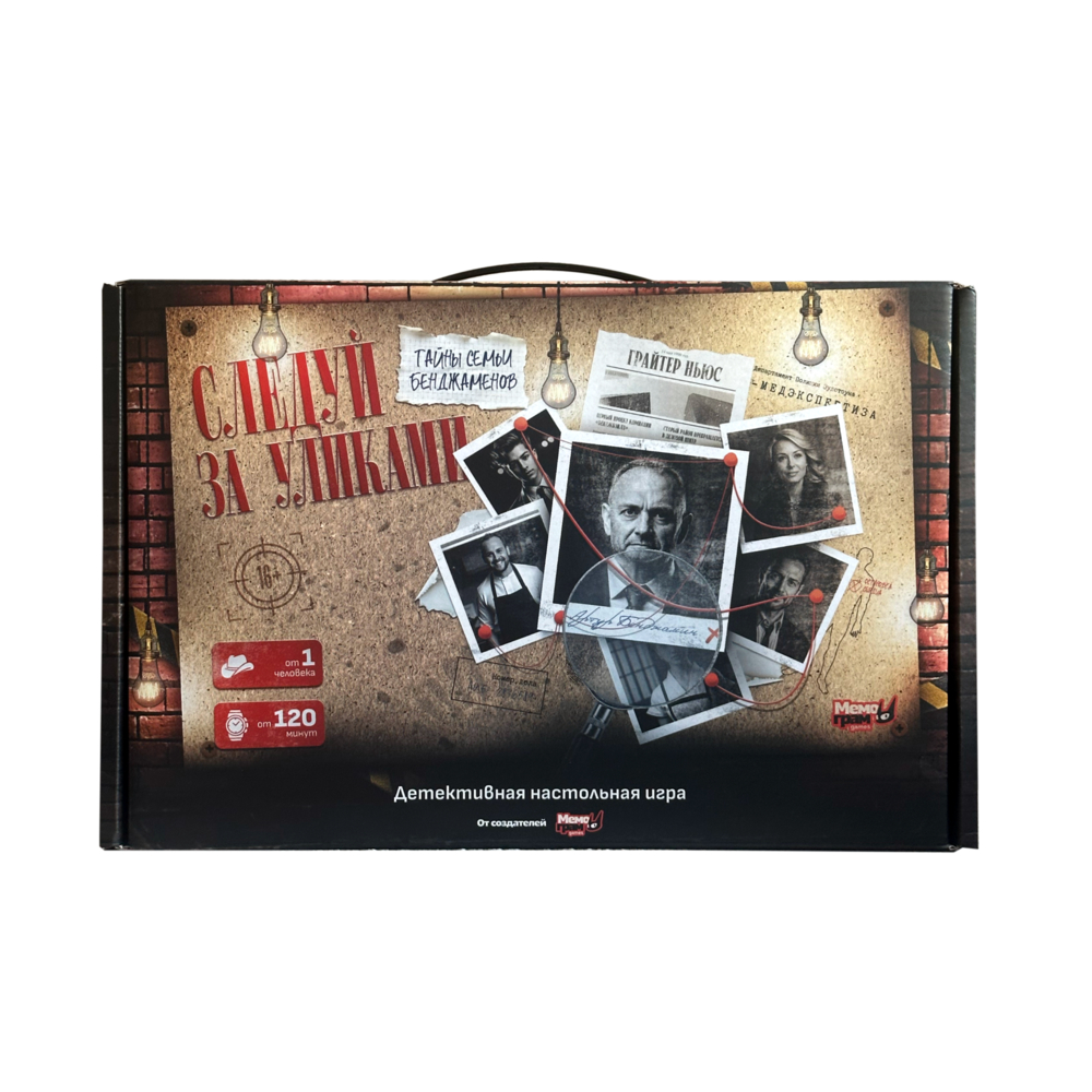 Детективная настольная игра "Следуй за уликами". Тебе предстоит взломать облачное хранилище, ознакомиться с личными делами и допросами всех подозреваемых, а также исследовать улики с места преступления, просмотреть влоги блогера, изучить вырезки из газет и полностью погрузиться в тайны семьи Бенджаменов, чтобы приблизиться к разгадке.