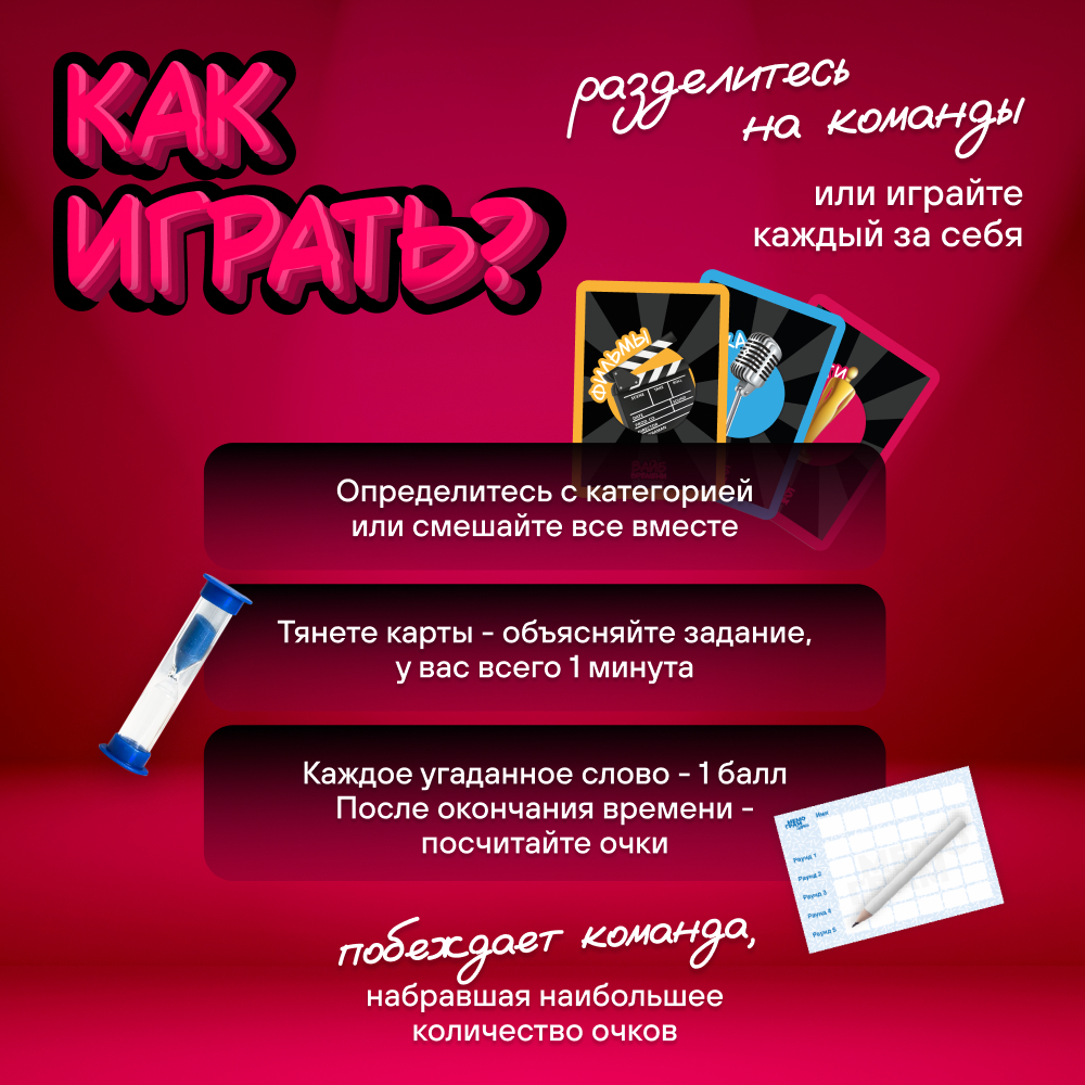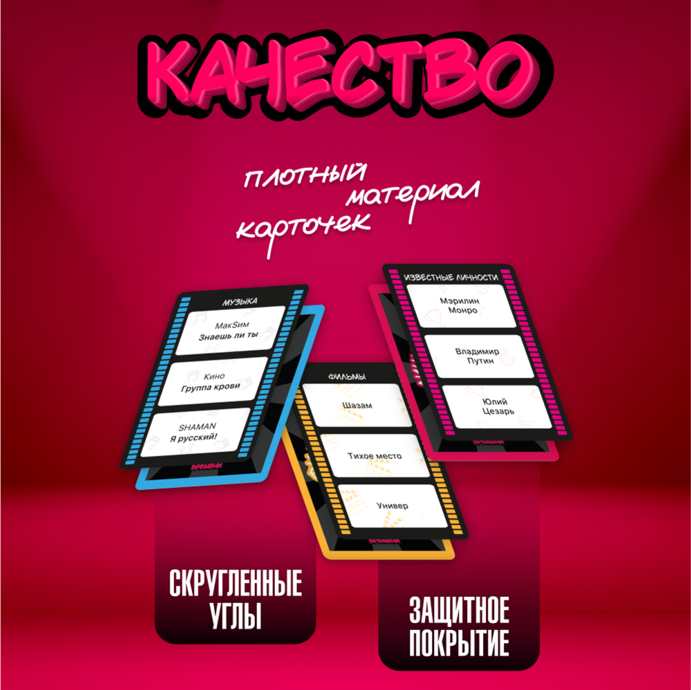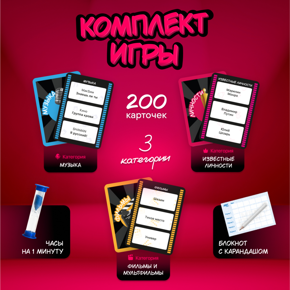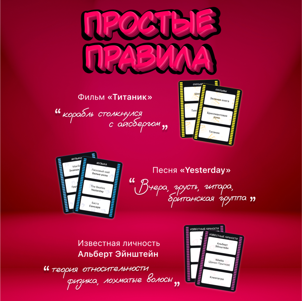 Суть игры – объяснить за 1 минуту наибольшее количество фильмов, музыкальных композиций или известных личностей, используя только ассоциации, жесты и мимику.