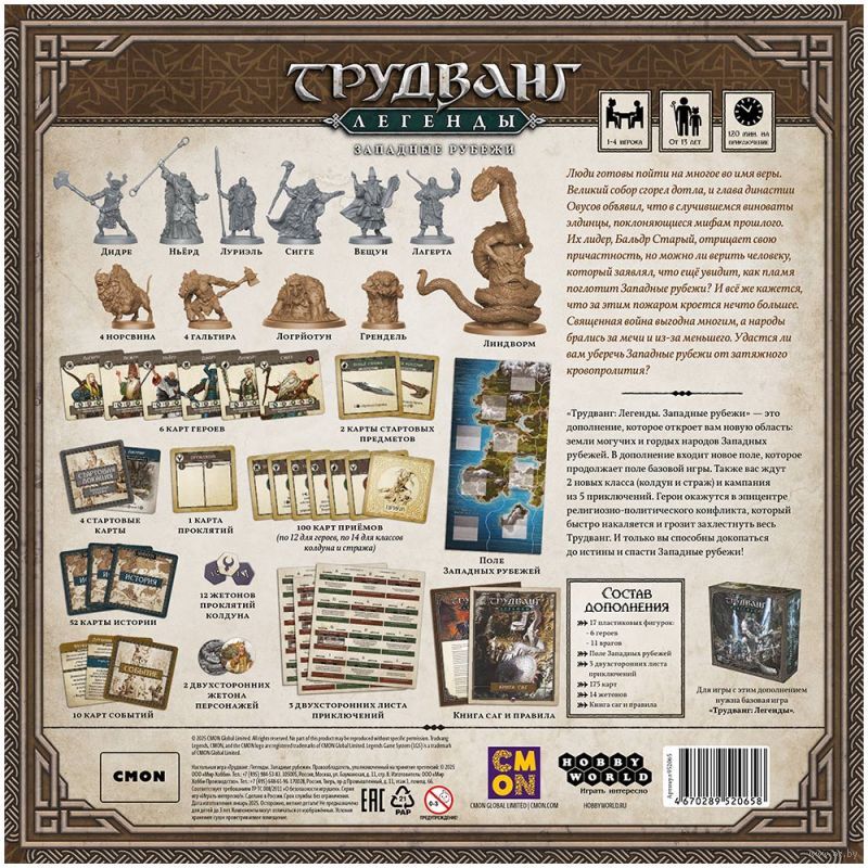 "Трудванг. Легенды. Западные рубежи" – это дополнение, которое откроет вам новую область: земли могучих и гордых народов Западных рубежей. В дополнение входит новое поле, которое продолжает поле базовой игры. Также вас ждут 2 новых класса (колдун и страж) и кампания из 5 приключений. Герои окажутся в эпицентре религиозно-политического конфликта, который быстро накаляется и грозит захлестнуть весь Трудванг. И только вы способны докопаться до истины и спасти Западные рубежи!