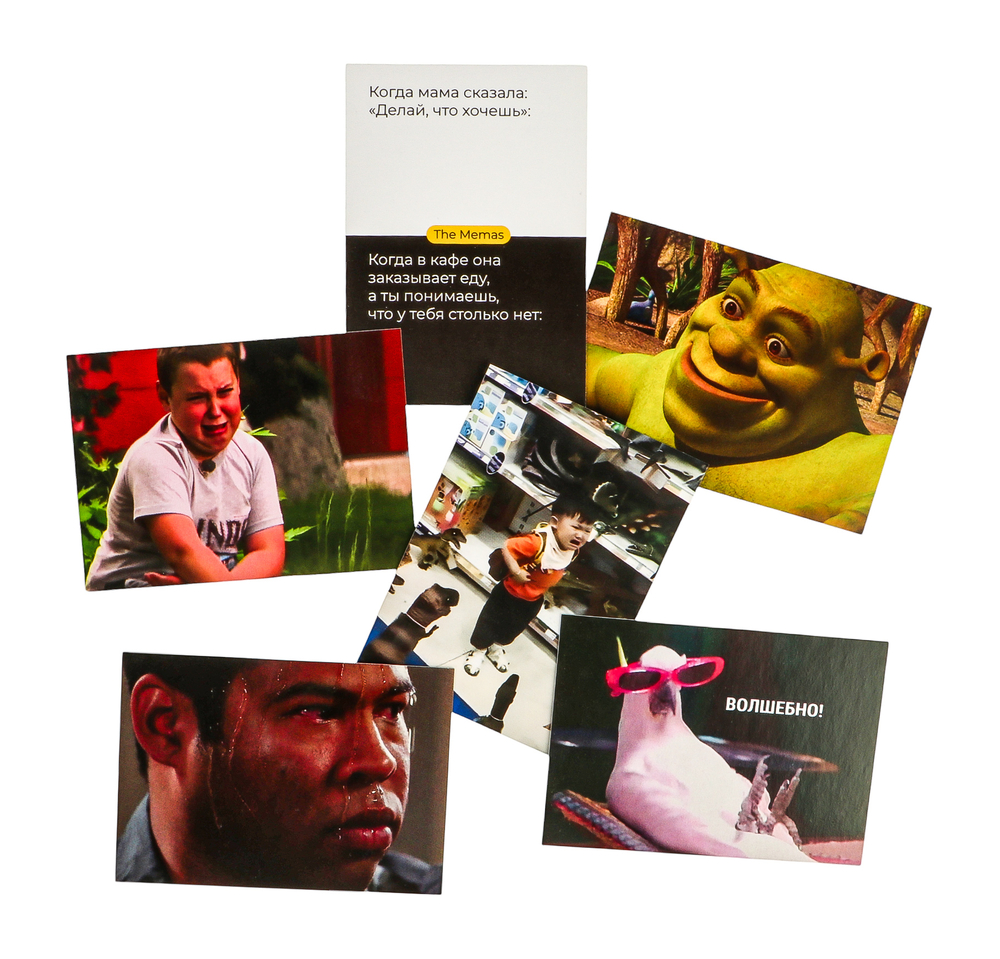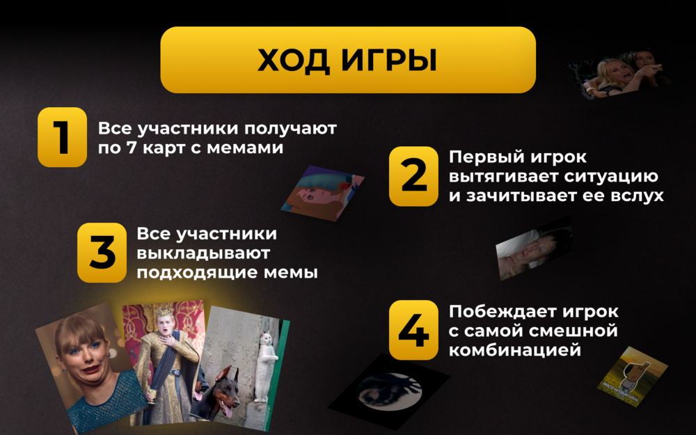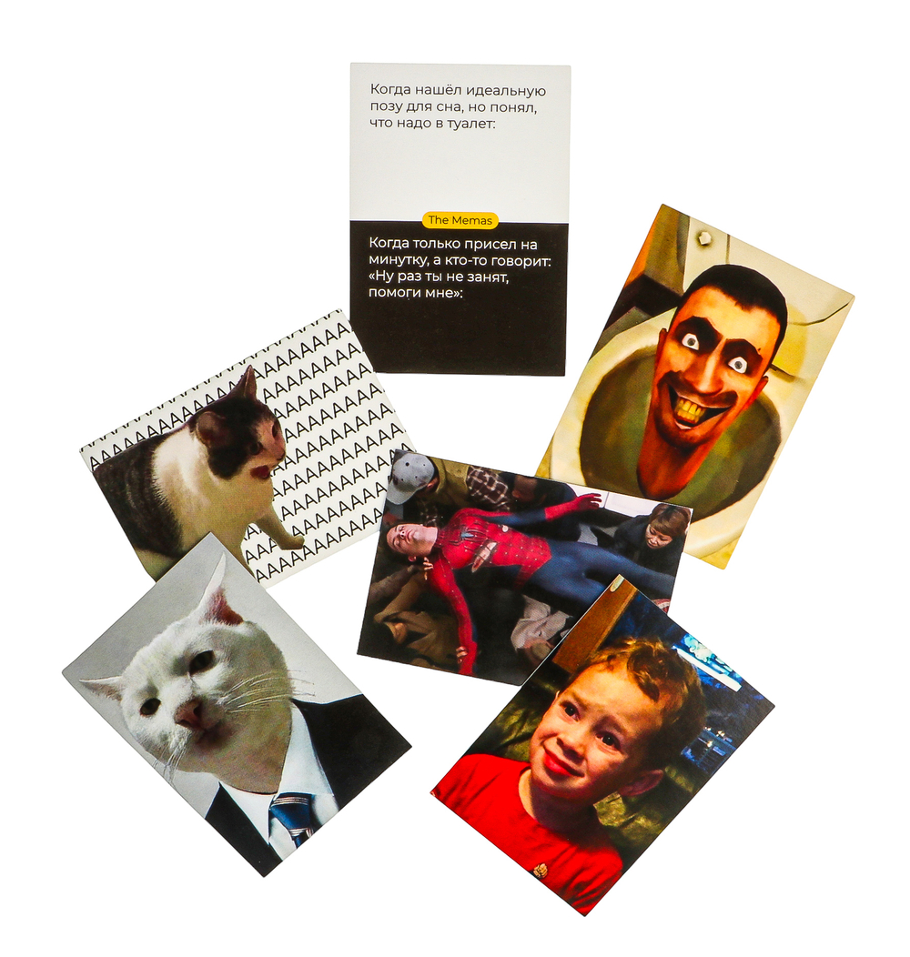 Суть проста: ведущий тянет карточку с ситуацией, а другие игроки подбирают к ней самый смешной мем. Побеждает тот, чье комбо заставит всех смеяться до слёз!