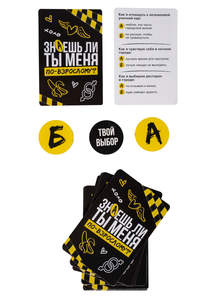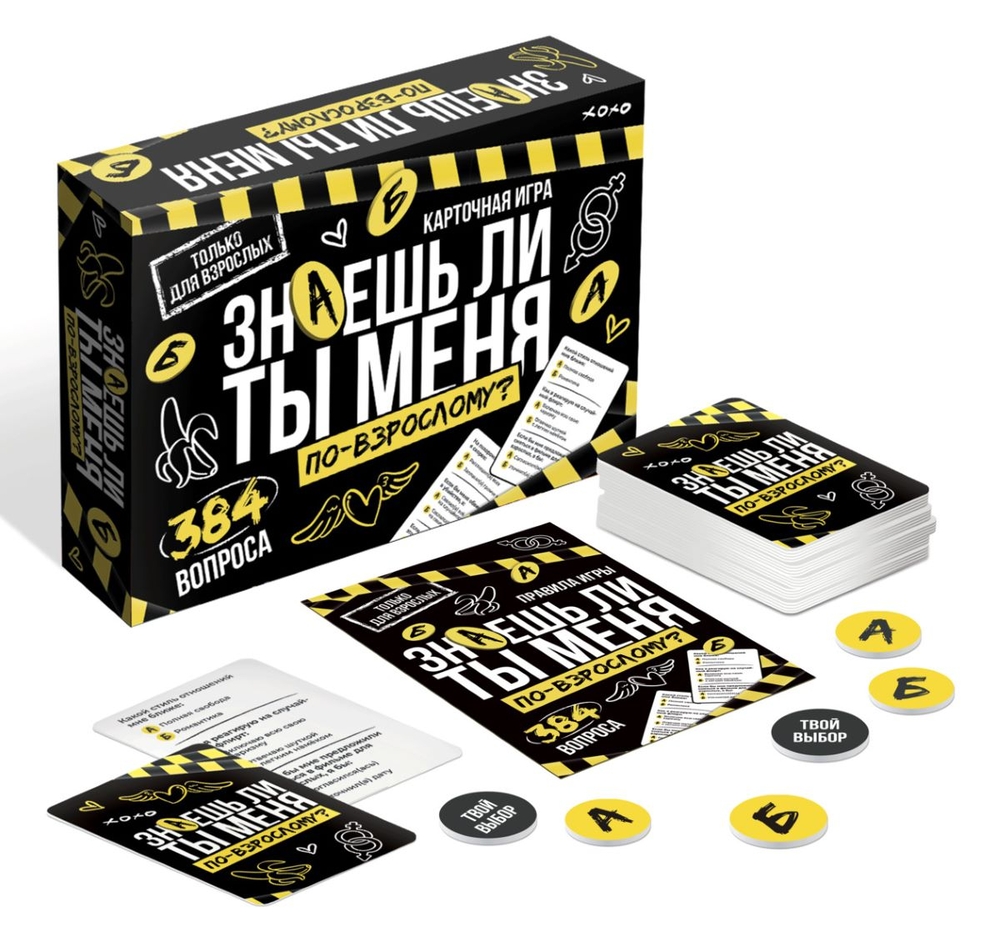 Настольная игра «Знаешь ли ты меня» По-взрослому? 18+ – это веселая игра для тех, кто готов узнать друг друга без масок. Собрались с друзьями? Отлично, ведь эта игра- шанс не только узнать неожиданные тайны, но и посмеяться до слез над пикантными подробностями!