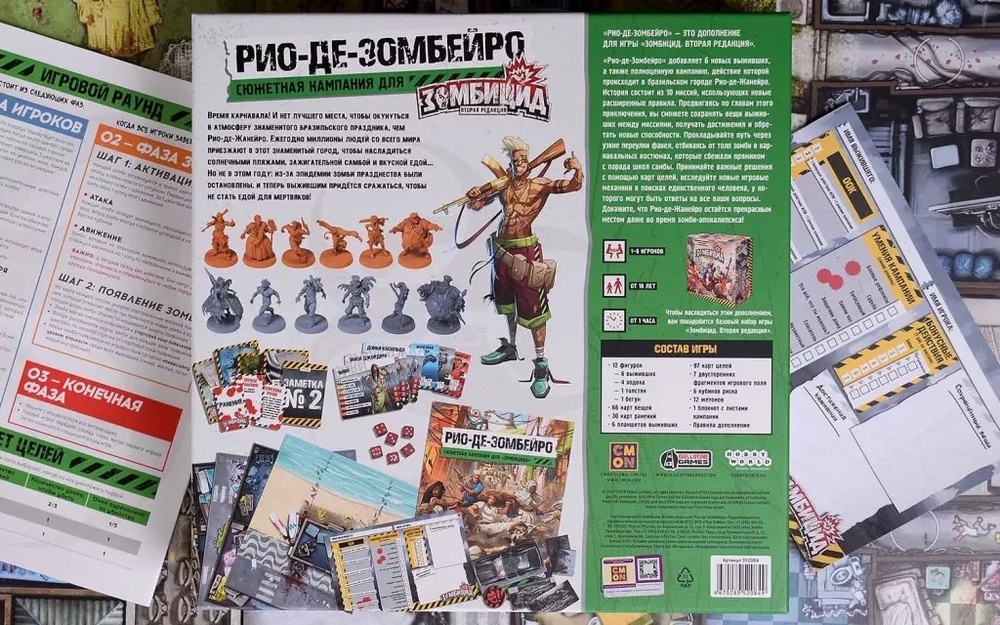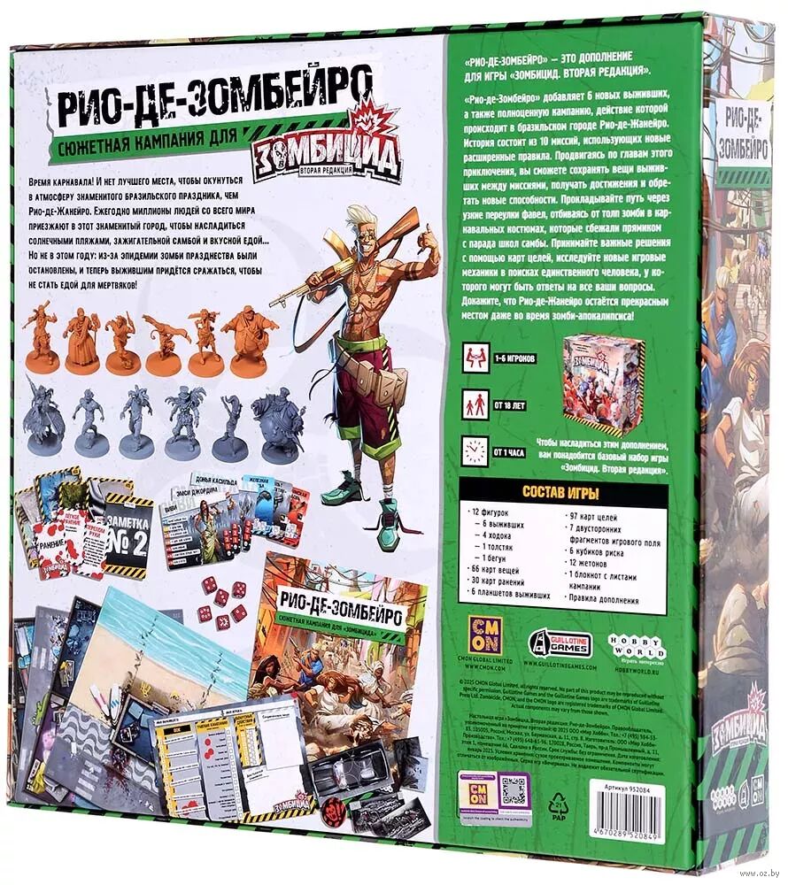 Перед вами новое дополнение для игры "Зомбицид. Вторая редакция", которое порадует ещё большим количеством увлекательного контента! Вы не только сможете пройти полноценную кампанию, состоящую из 10 миссий и привязанную к расширенным правилам, но также получите возможность сыграть одним из 6 новых выживших. Ваше приключение будет проходить в Бразилии, в Рио-де-Жанейро, в самый разгар традиционного карнавала.