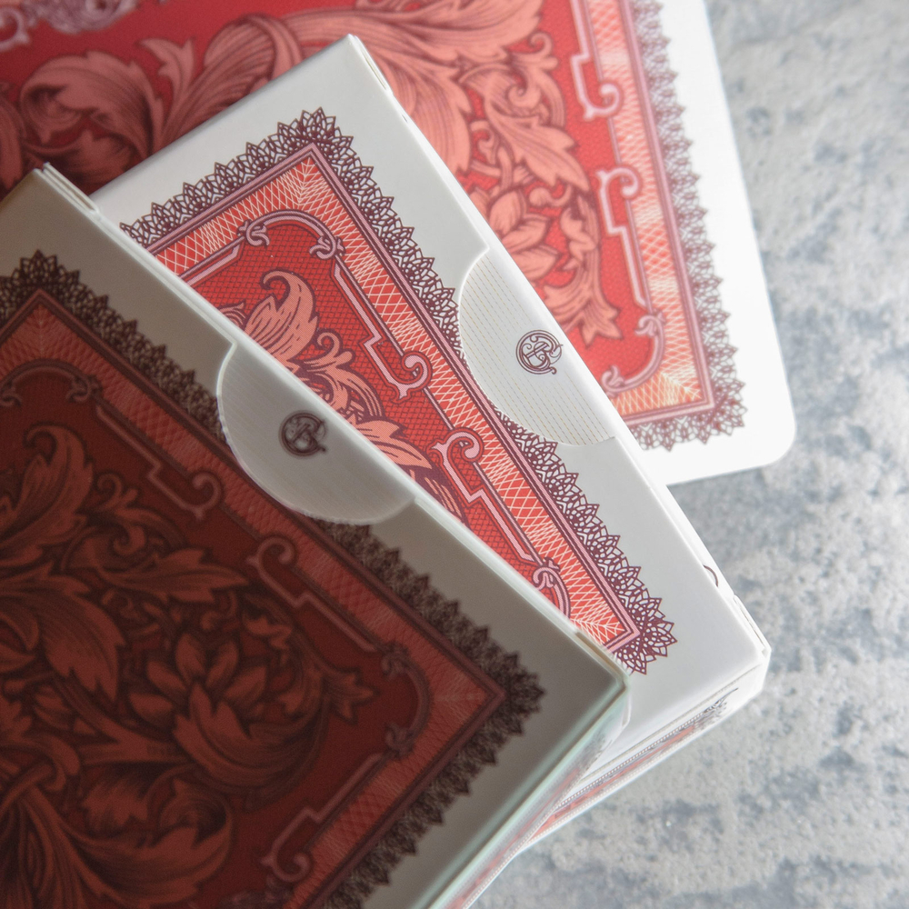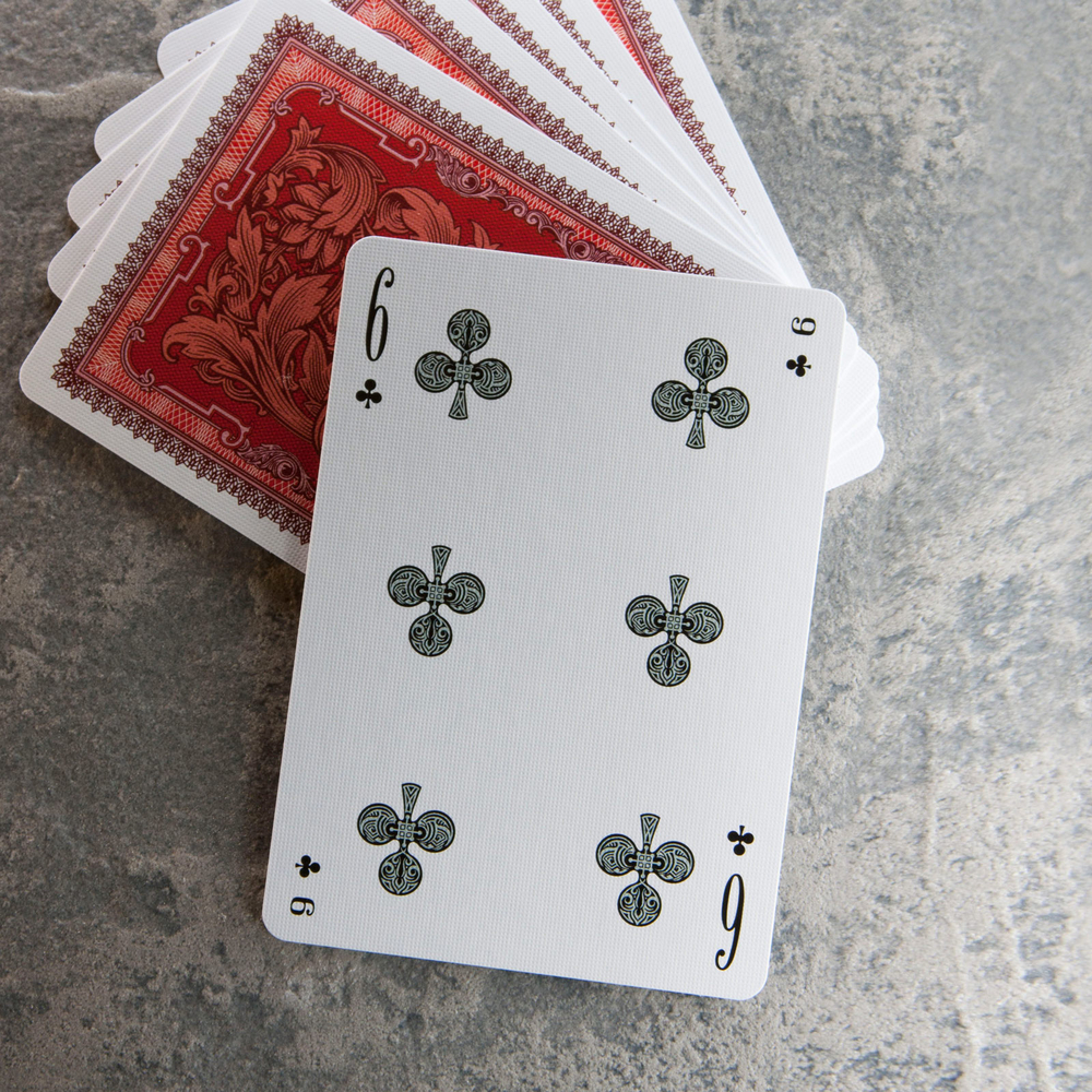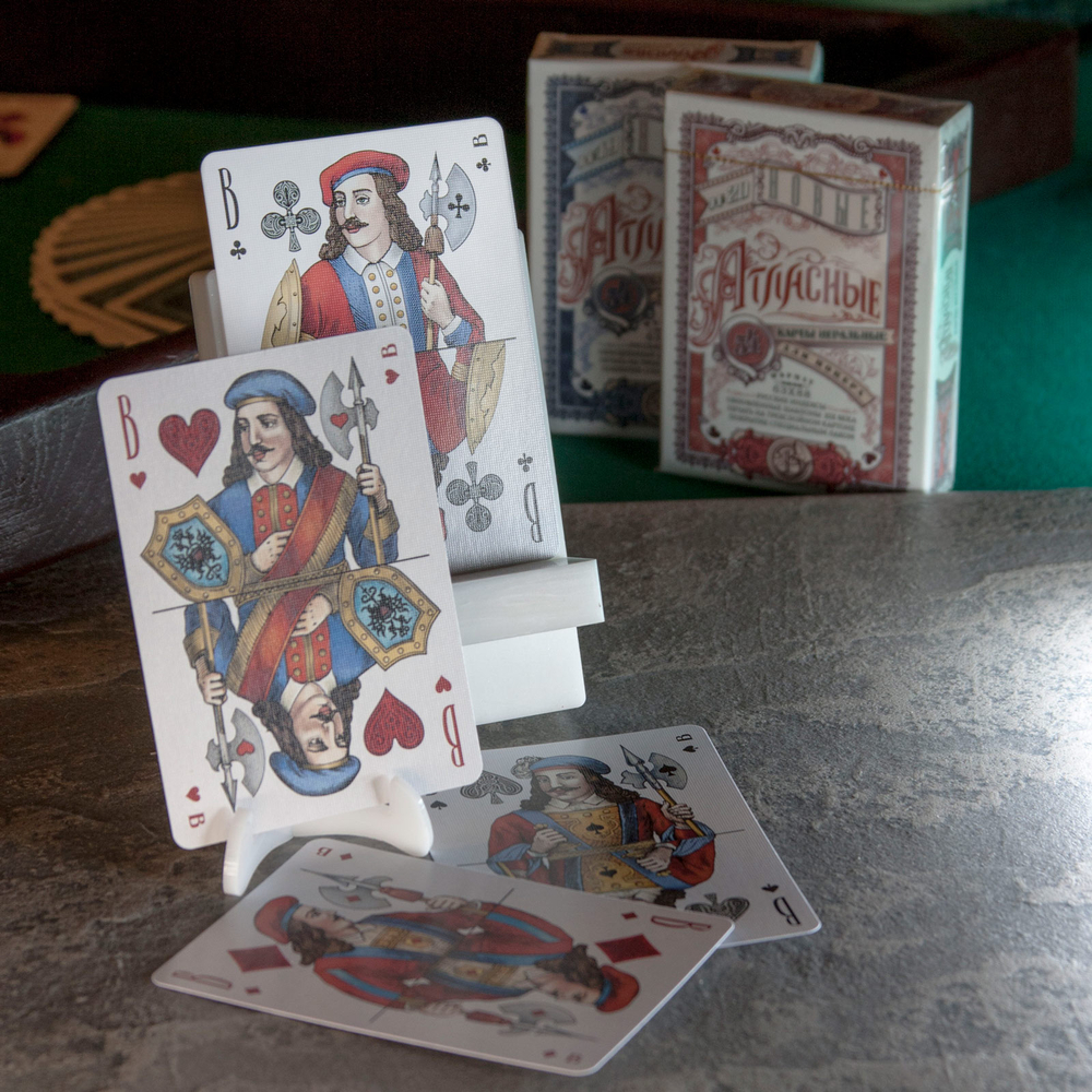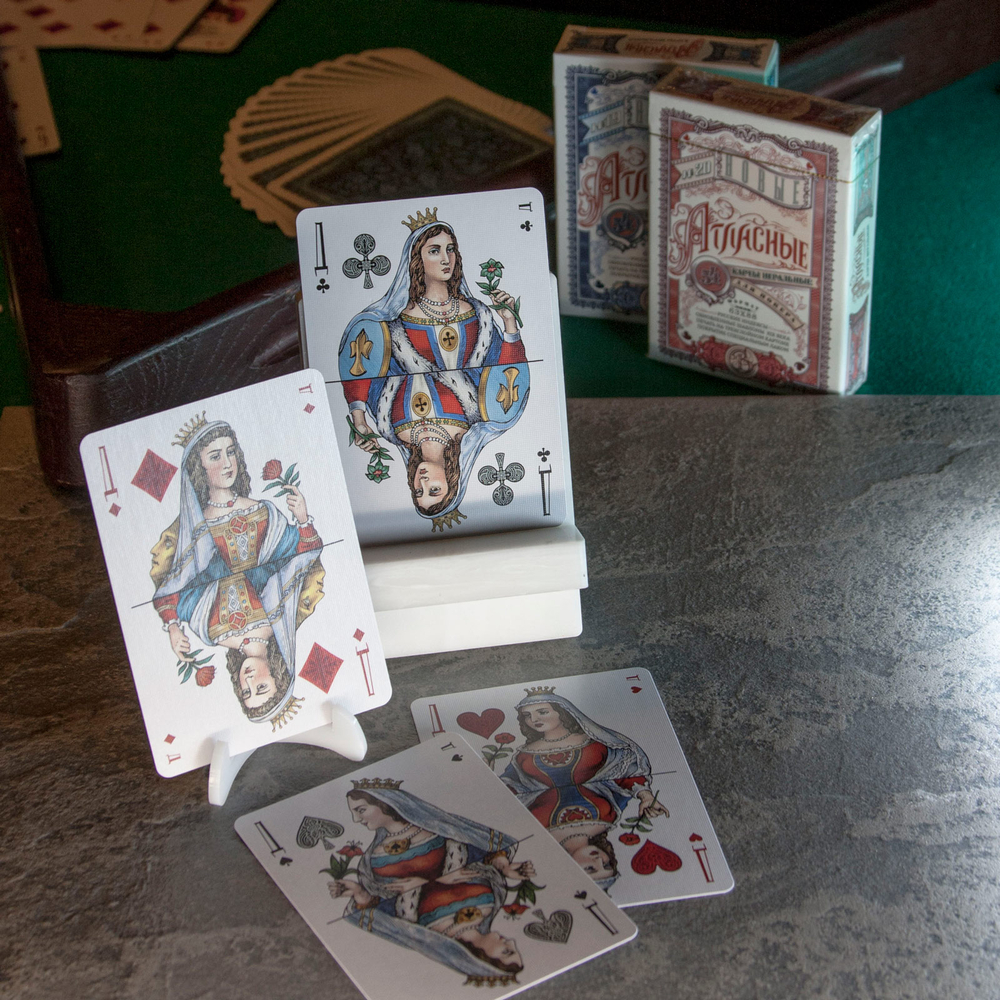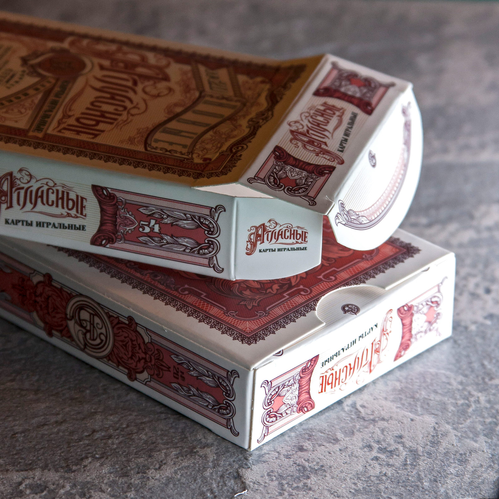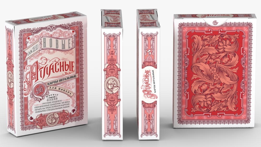 "Новые атласные" (красные) – колода игральных карт с классическими улучшенными иллюстрациями XIX века в покерном (63х88 мм) формате. Дизайн карт, бережно выполненный Виталием Синкевичем, сохранил всё обаяние классики. Это версия с красной рубашкой.