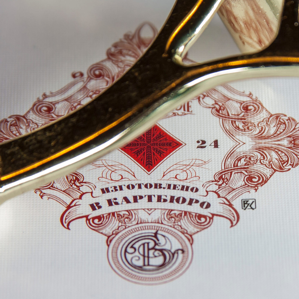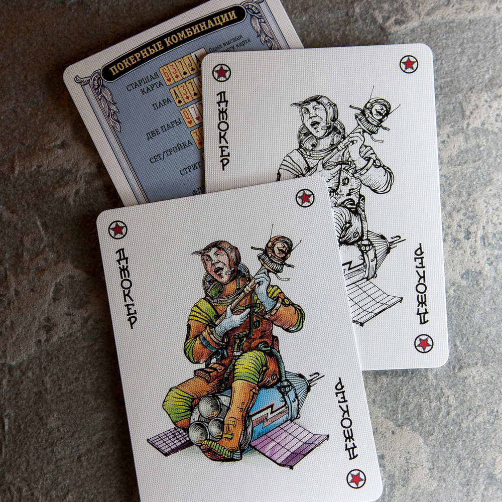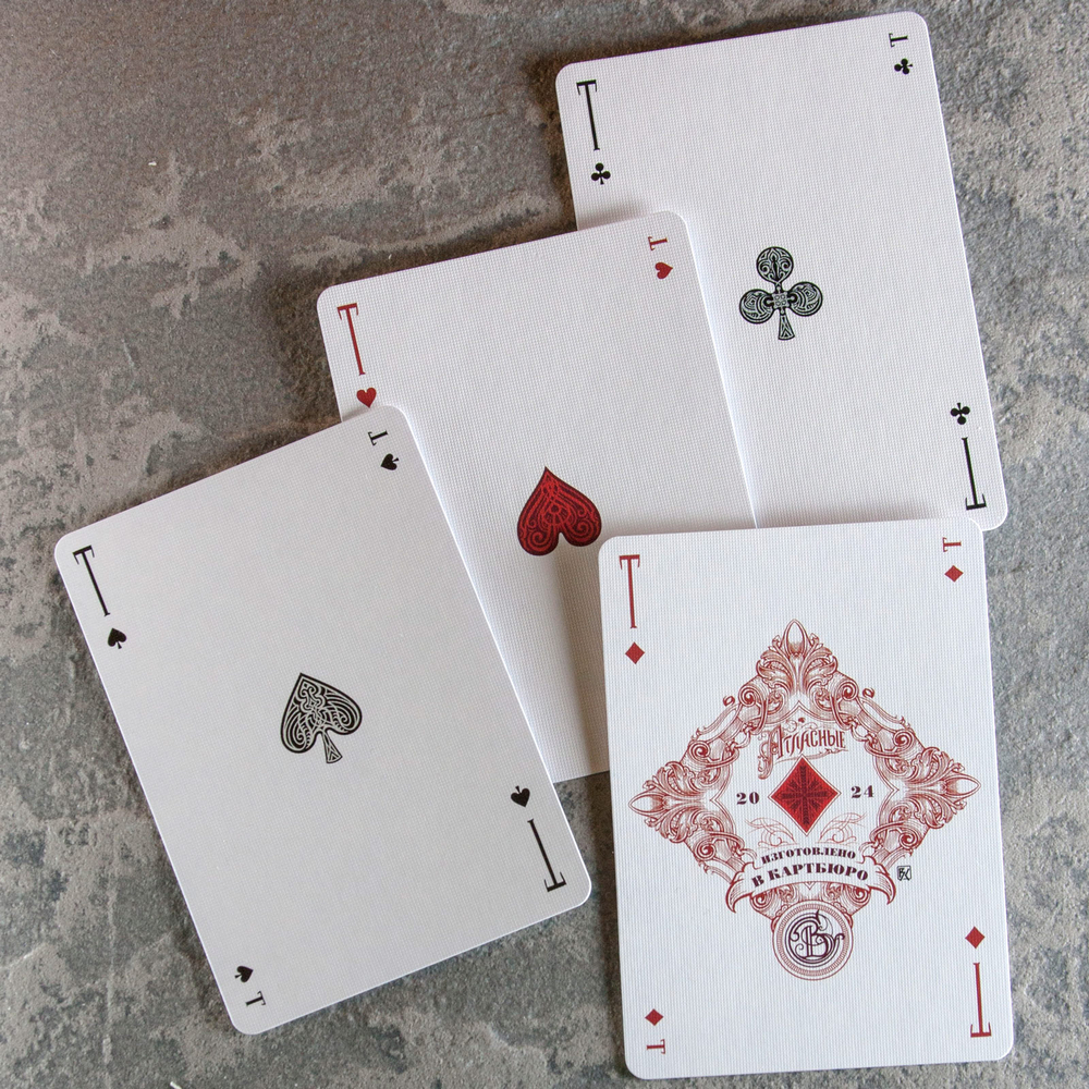 Колода "Новые атласные" (красные) от издательства "Картбюро Синкевича" сделана из специального карточного картона с синим средним слоем, полимерным покрытием и тиснением под лён.