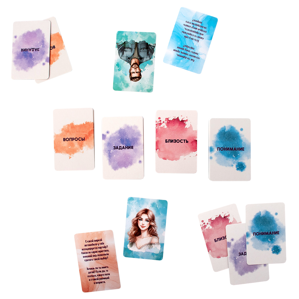 Каждый игрок выбирает себе карточку персонажа. Игроки по очереди тянут карточки из категорий "Вопросы", "Задания" и "Близость" и после ответа при помощи карточек "Понимание" анализируют ответы. После 2-4 карточек из каждой категории, игроки уже смогут почувствовать результат и нащупать точки роста.