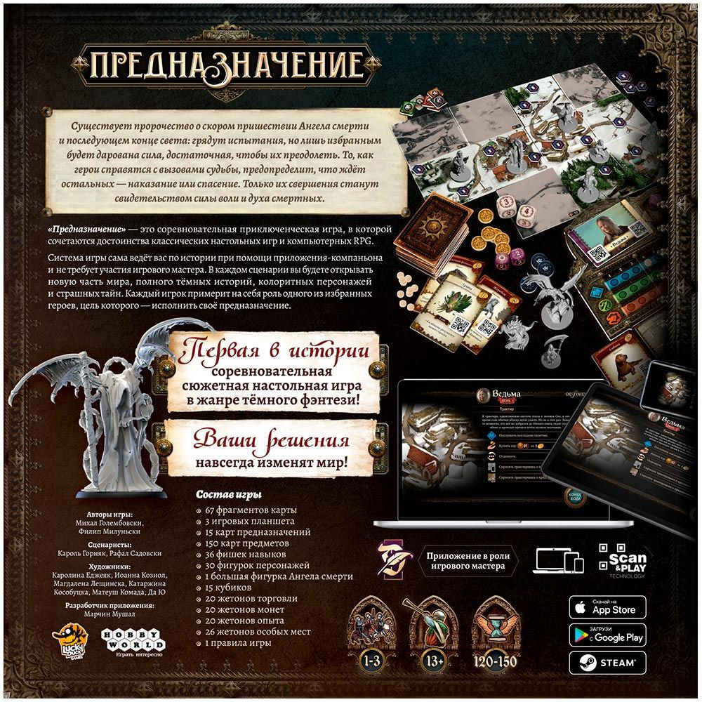 "Предназначение" – это соревновательная приключенческая игра, в которой сочетаются достоинства классических настольных игр и компьютерных RPG. Система игры сама ведёт вас по истории при помощи приложения-компаньона и не требует участия игрового мастера. В каждом сценарии вы будете открывать новую часть мира, полного тёмных историй, колоритных персонажей и страшных тайн. Каждый игрок примерит на себя роль одного из избранных героев, цель которого – исполнить своё предназначение.