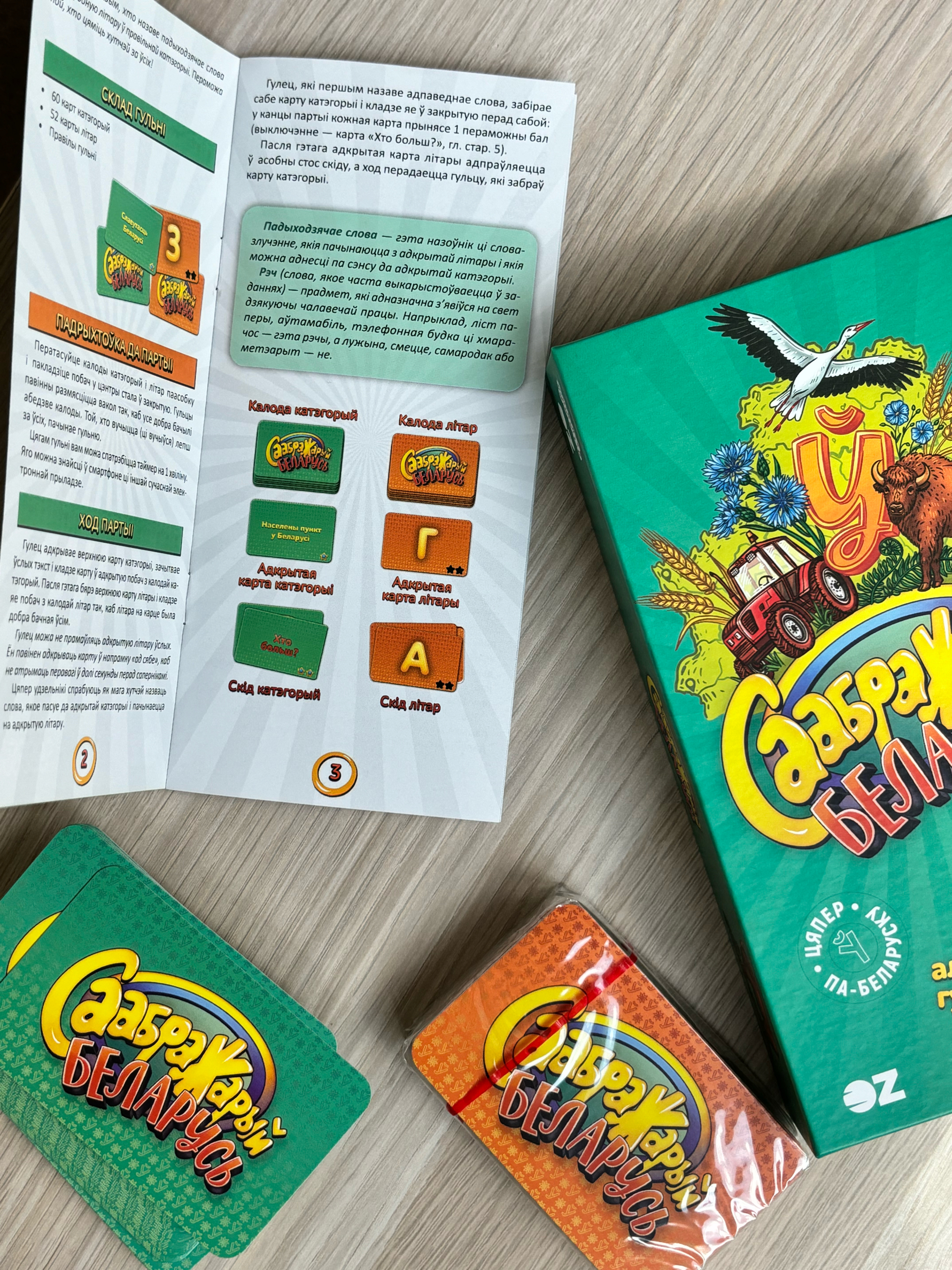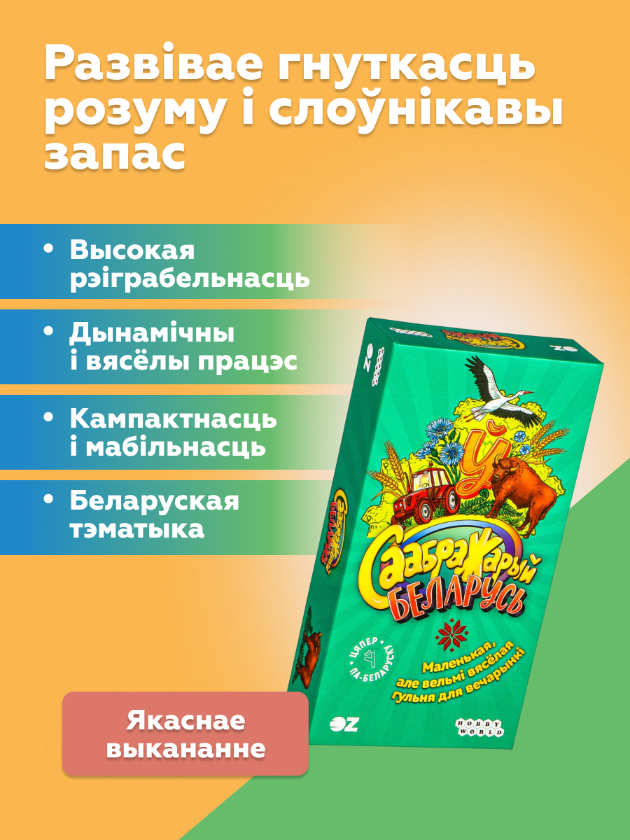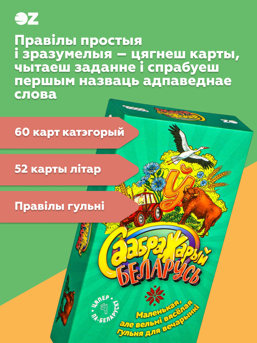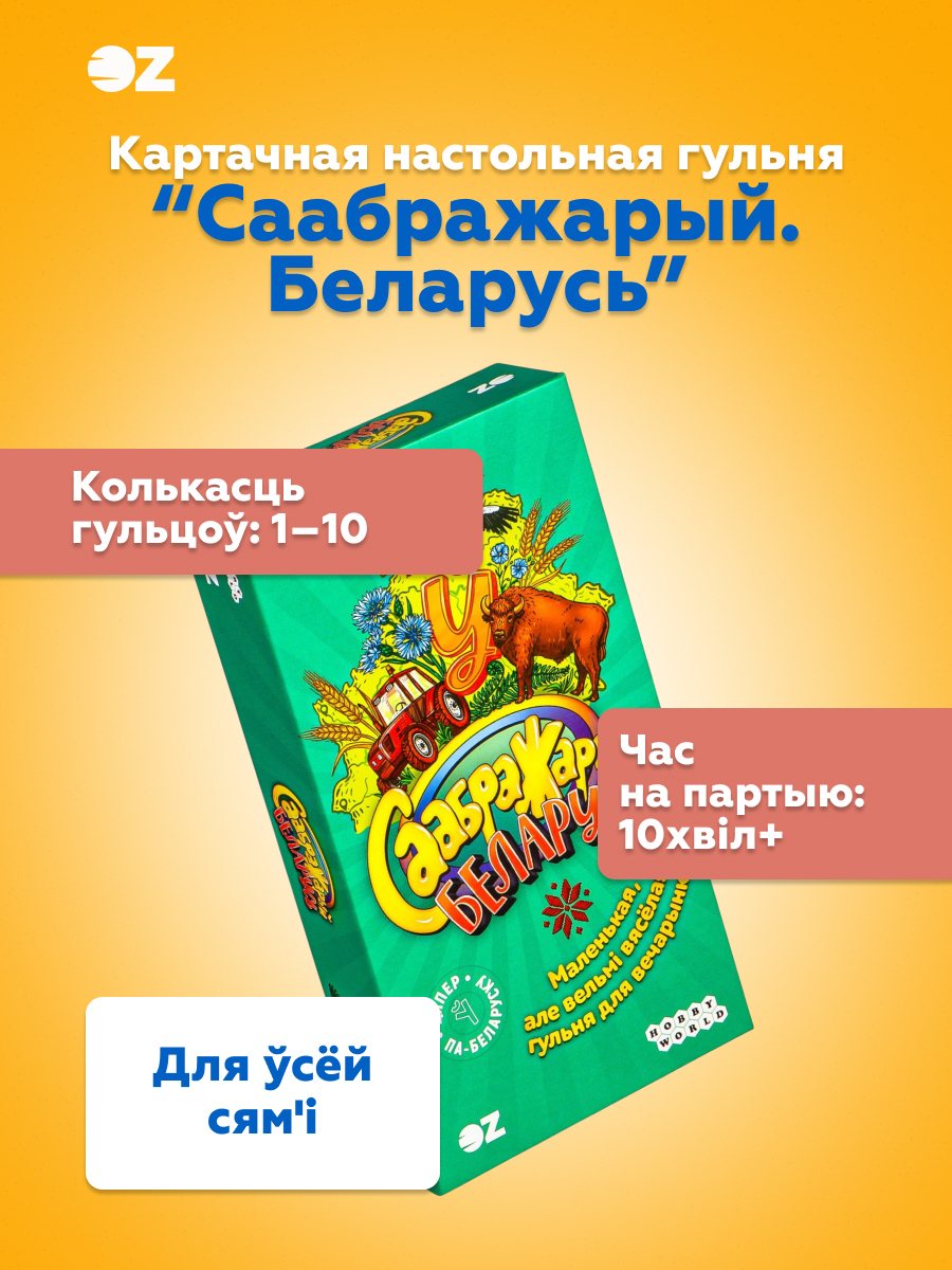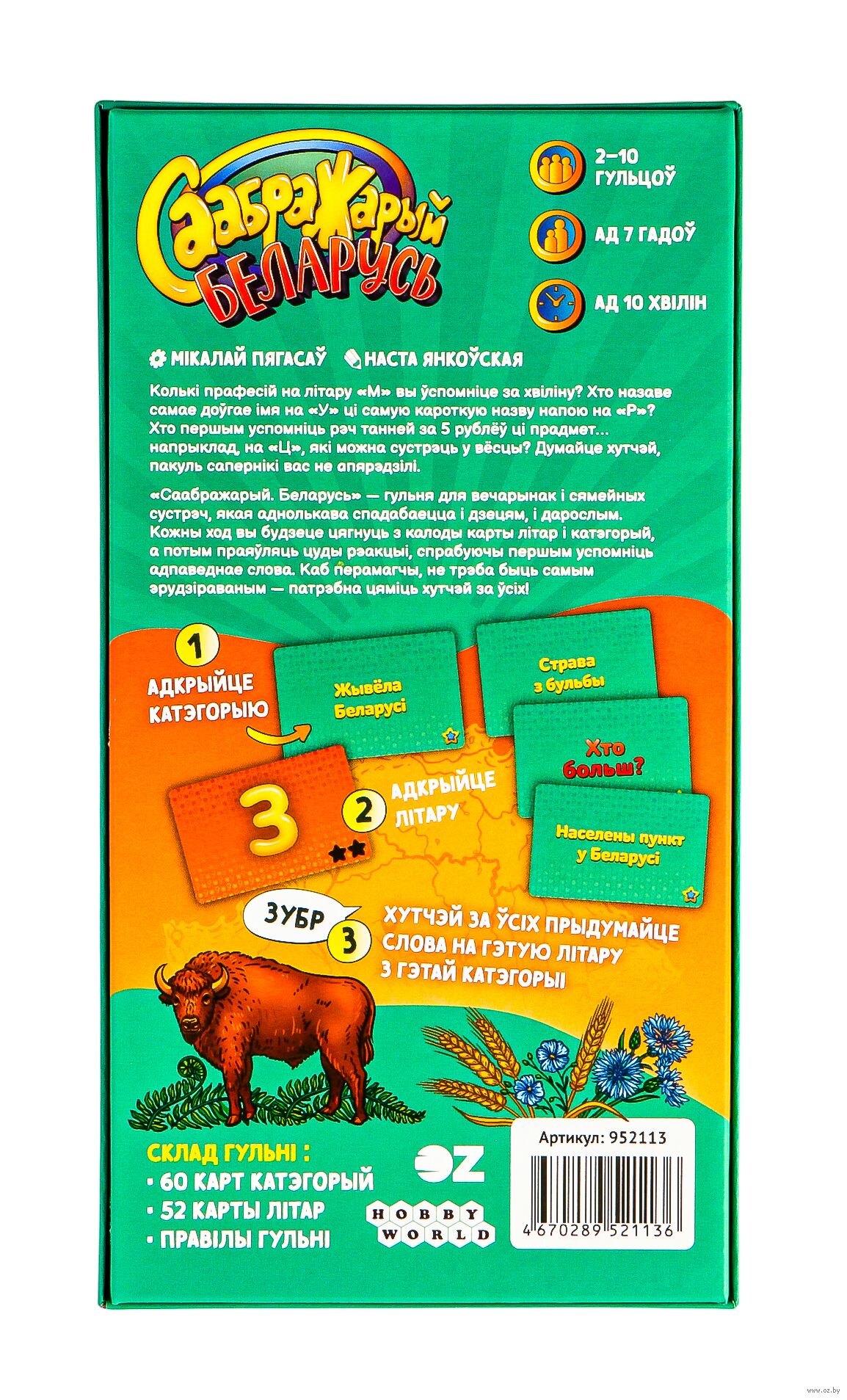 "Саабражарый. Беларусь" – гульня для вечарынак і сямейных забавак, якая аднолькава спадабаецца і дзецям, і дарослым. Кожны ход вы будзеце цягнуць з калоды карты літар і катэгорый, а потым праяўляць дзівосы рэакцыі, спрабуючы першым успомніць адпаведнае слова. Каб перамагчы, не трэба быць самым эрудзіраваным, – патрэбна цяміць хутчэй за ўсіх!