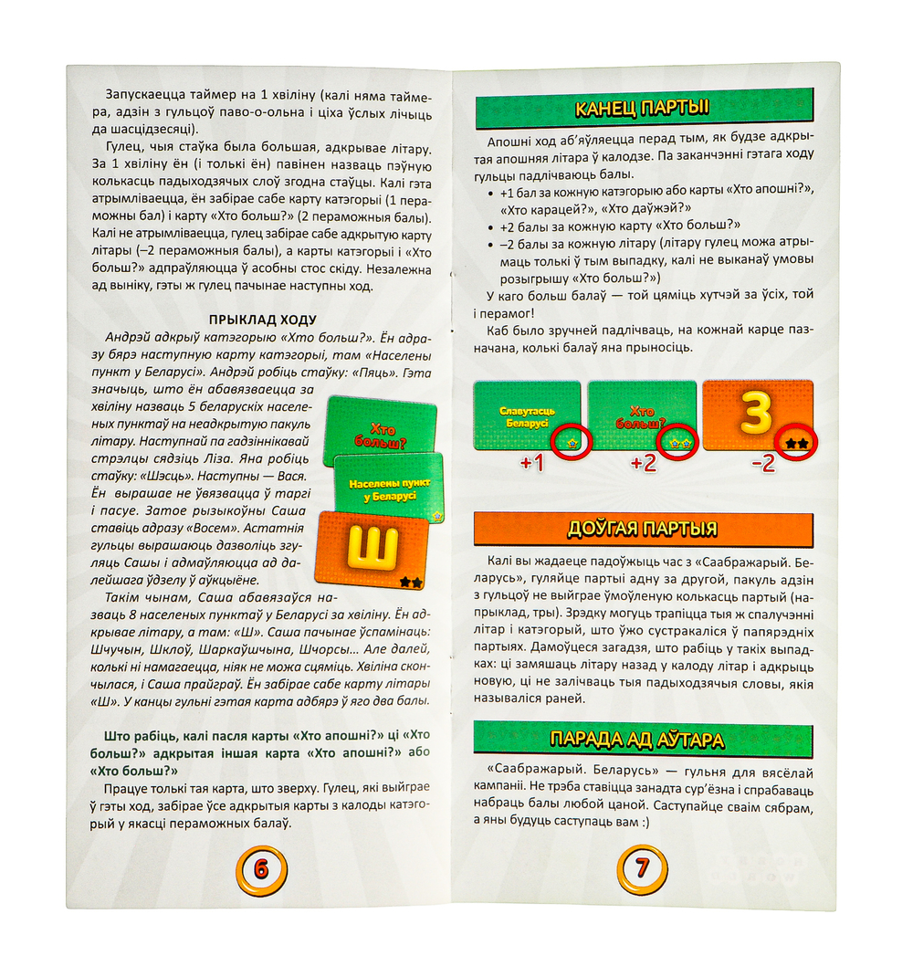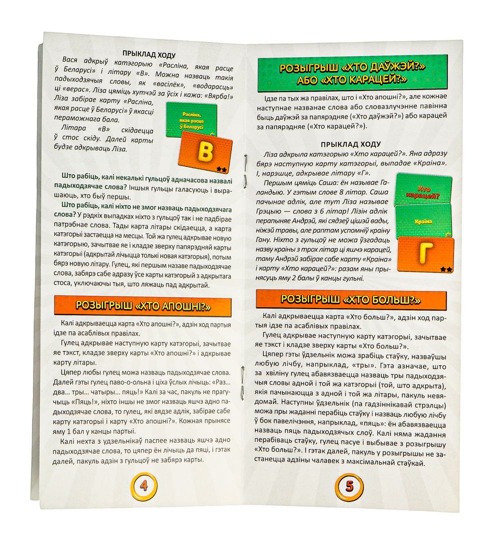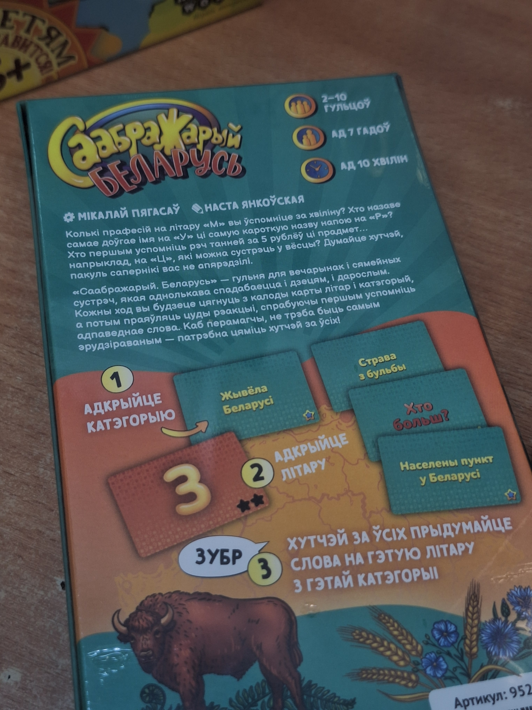 Цяпер гэта мая любімая гульня з усёй серыі! Заданні вясёлыя і разнастайныя. Праўда, марнуеш больш часу "на падумаць", чым у версіях на рускай мове. І ад гэтага гульня набірае свае абароты Карткі шчыльныя і яскравыя. Іх прыемна трымаць у руках. А пасля гульні ёсць асобныя пакуначкі, у якія можна схаваць карткі Вялікі дзякуй за навінку!
