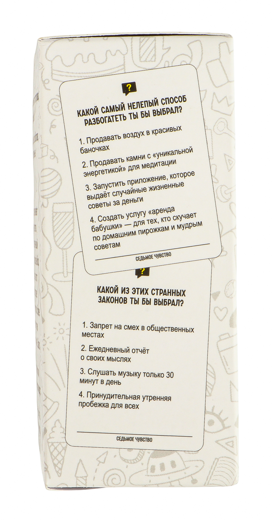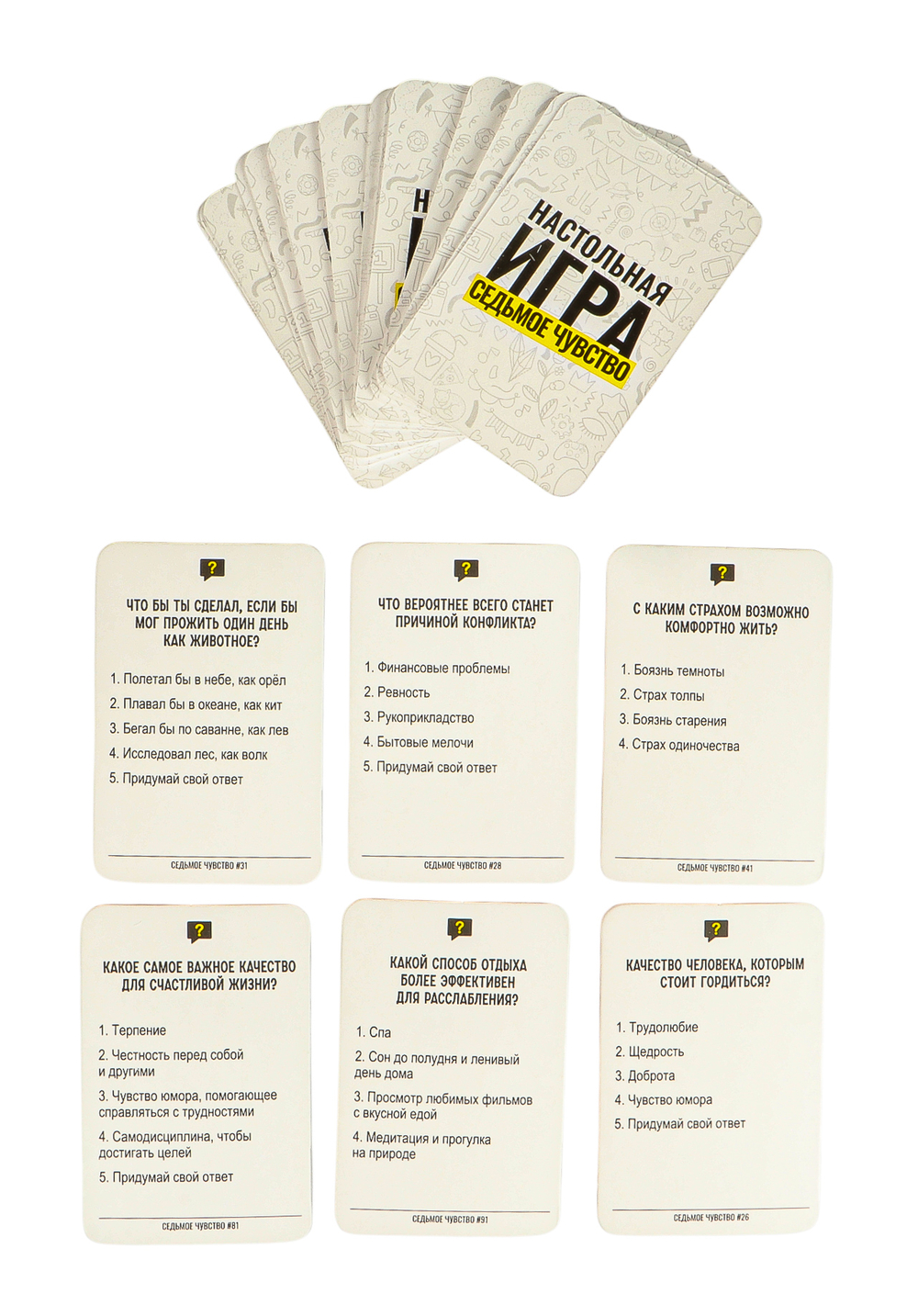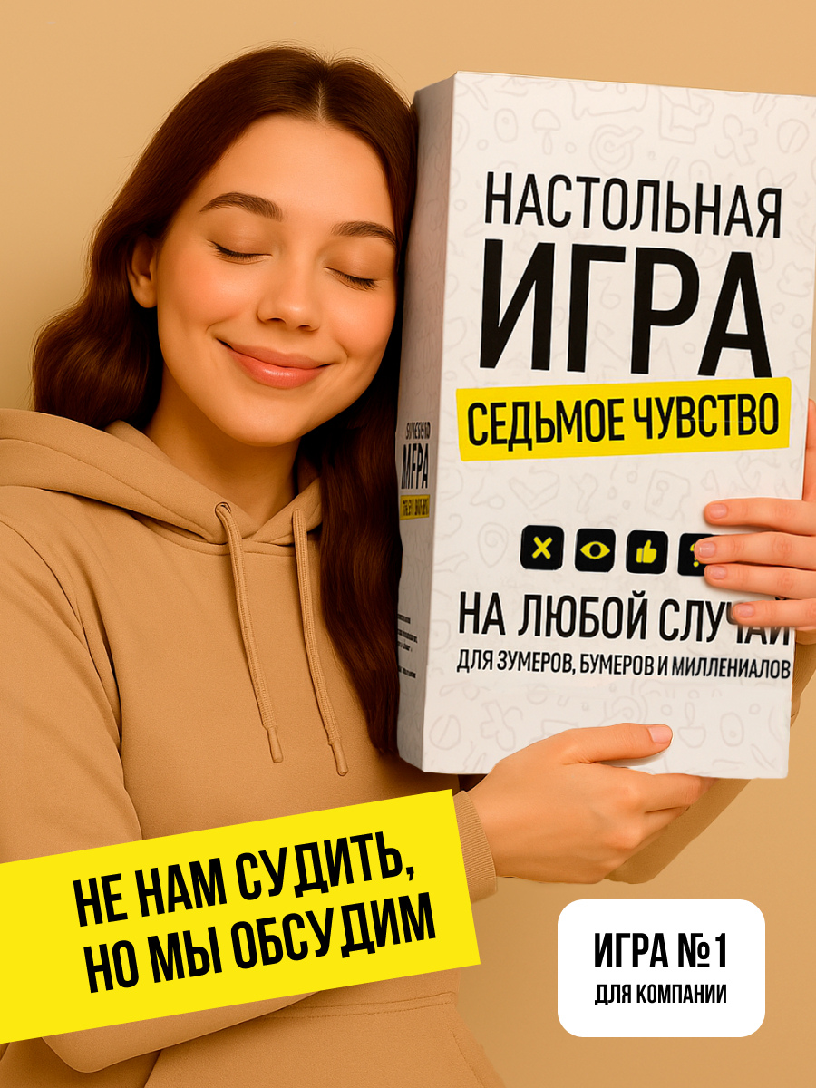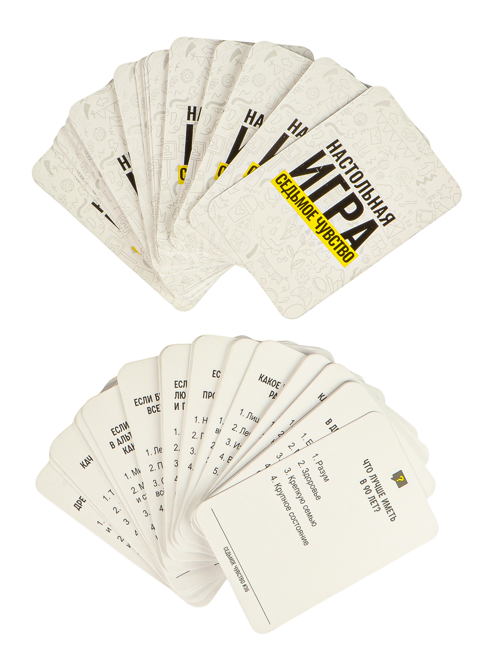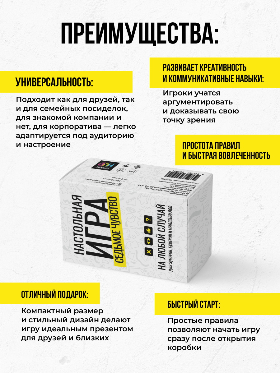 "Седьмое чувство" – универсальная настольная игра, которая подойдёт для всей семьи, весёлой компании друзей или даже для вечера вдвоём. Это игра на обсуждение, в которой побеждает тот, кто лучше аргументирует свой выбор и сможет убедить остальных.