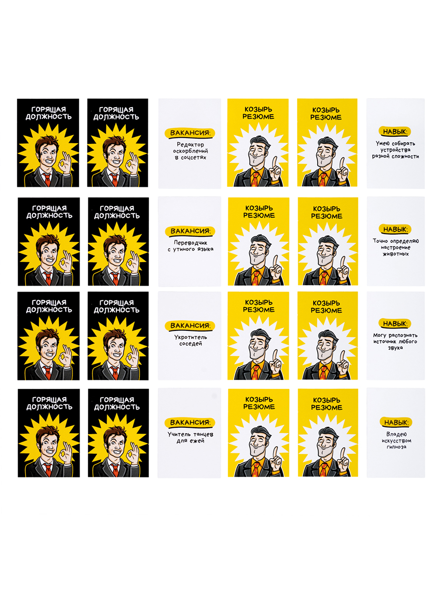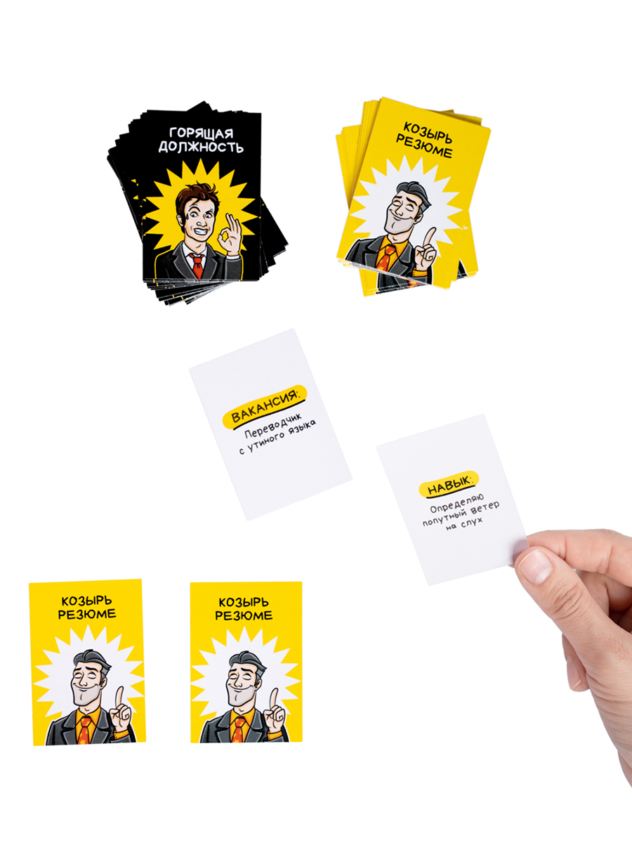 Настольная игра "Просто найми меня!" для взрослых – это безумная игра для тех, кто умеет продать даже воздух! Твоя задача – нагло и убедительно доказать, что именно ты – мечта любого HR! Лучшая самопрезентация позволит получить работу. Каждый соискатель пытается убедить работодателя, что он идеальный кандидат на открытую вакансию.