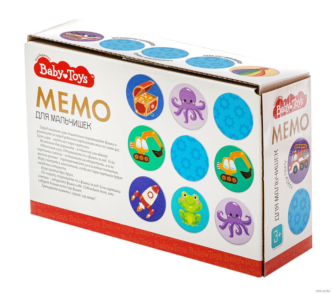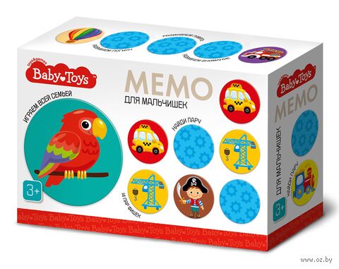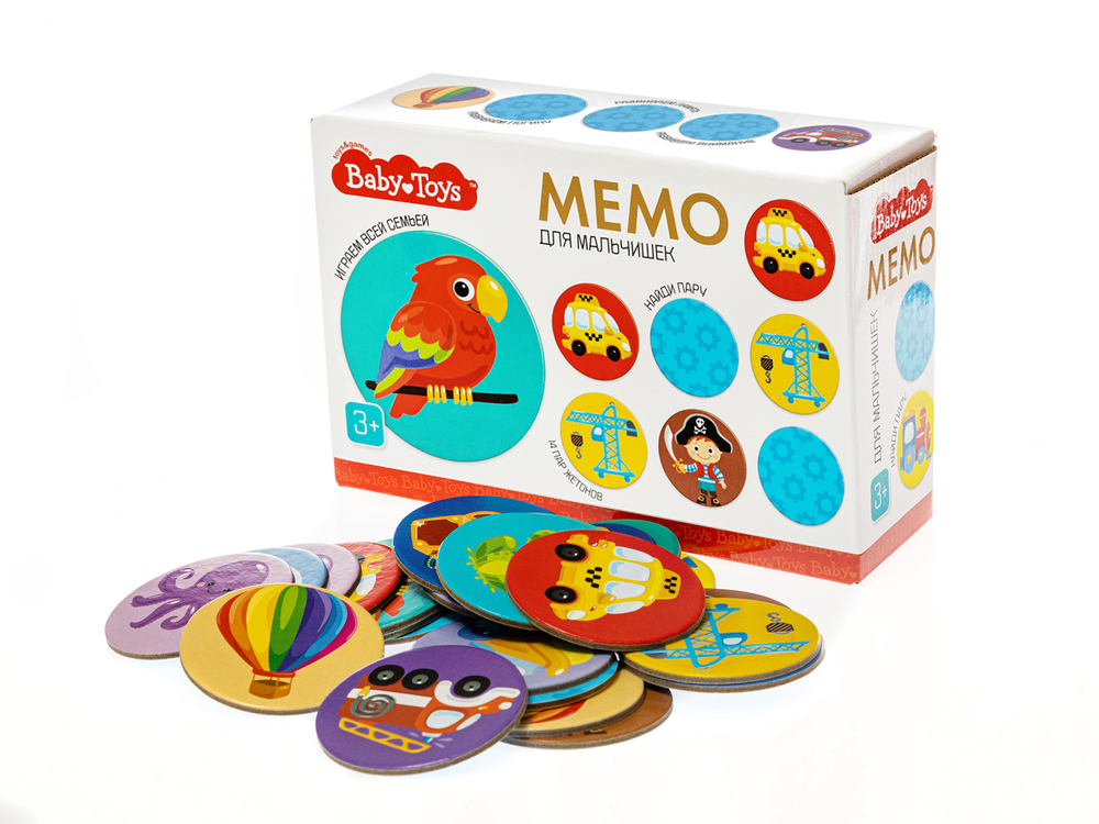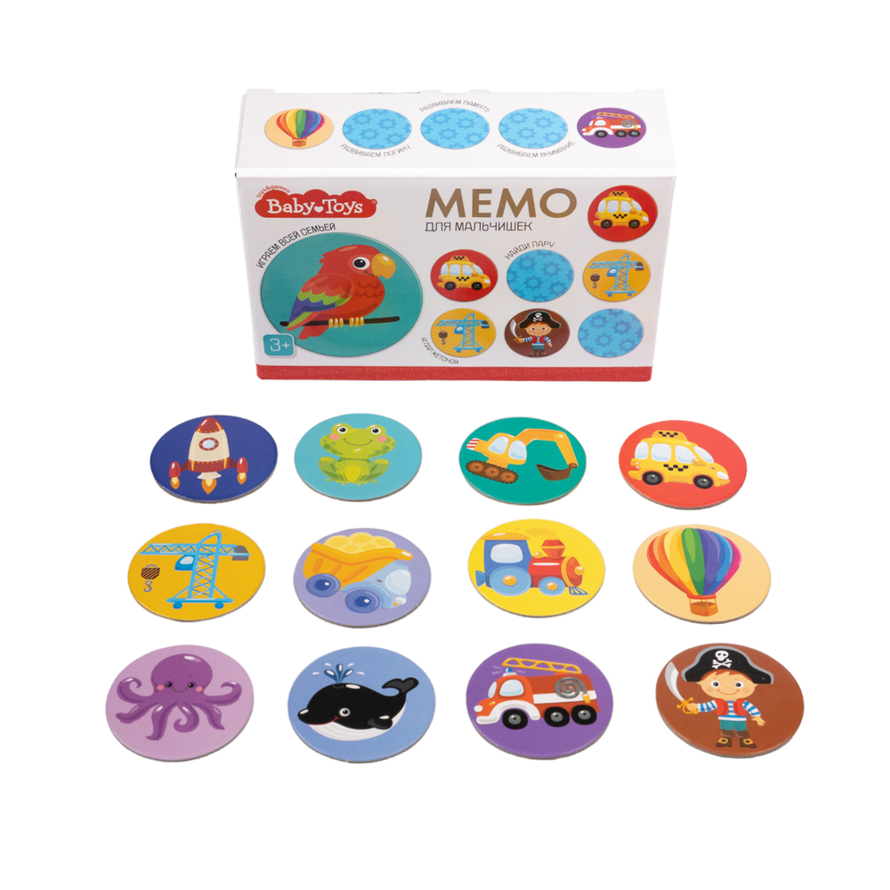 Тренируйте память с увлекательной игрой с механикой "найди пару" – Мемо. Для мальчишек из серии развивающих игр для самых маленьких BabyToys. Ищите пары одинаковых картинок среди 28 картонных фишек и весело проводите время всей семьёй!