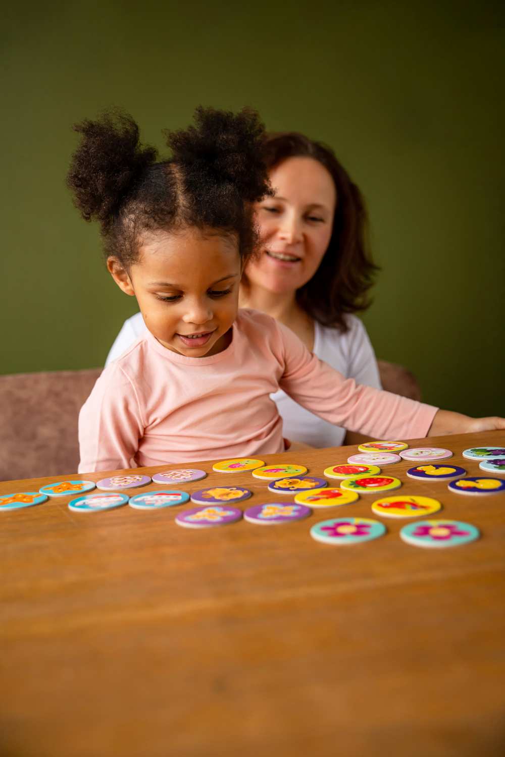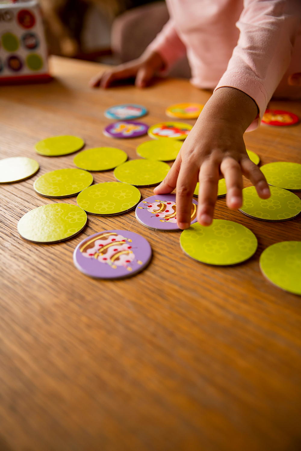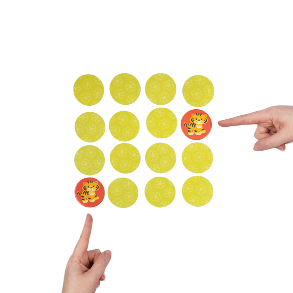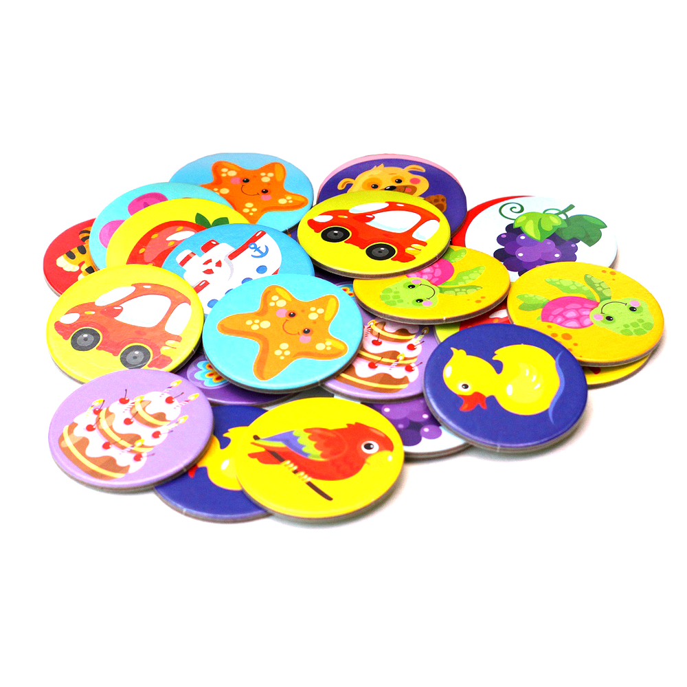 Перед началом игры тщательно перемешайте фишки и разложите их перед ребёнком картинками вниз по схеме 4х7. Цель игры – найти все пары картинок. Возможны два варианта игры – в одиночку или вдвоём.