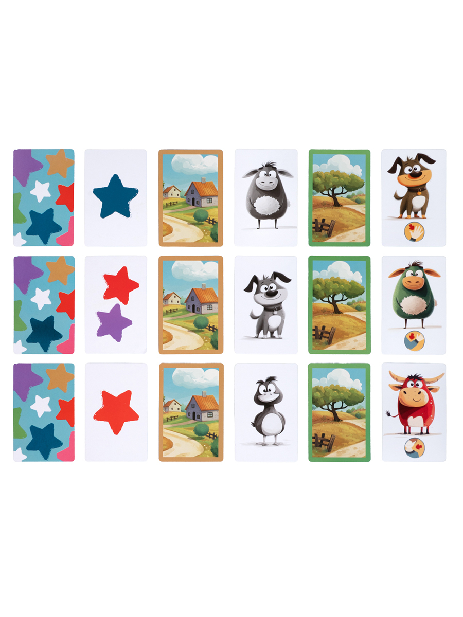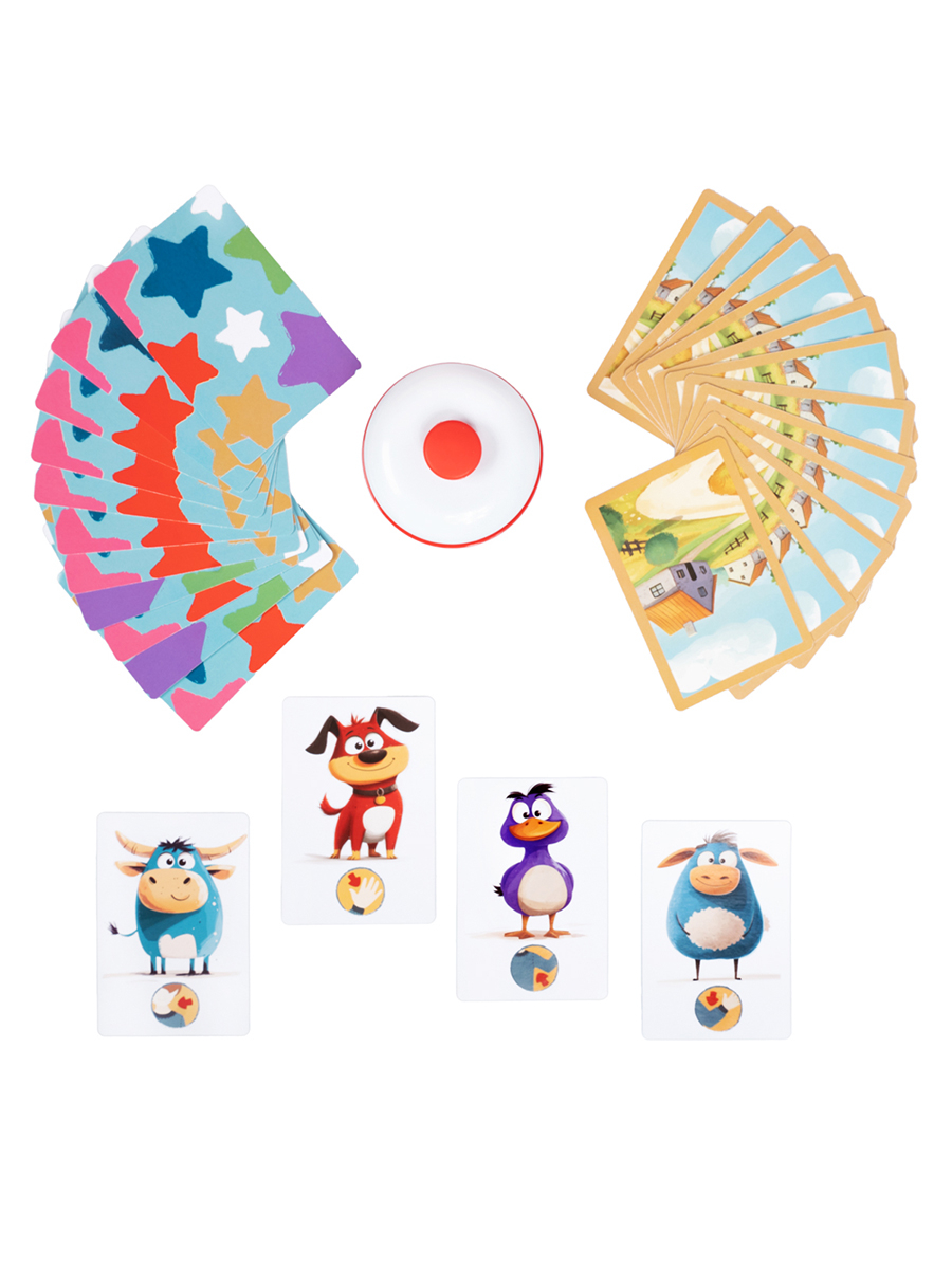 Поставьте звонок на середину стола, разложите карточки, с одной стороны колода "звезды", с другой стороны от звонка колода "ферма". Карточки "луг" разложите по столу изображениями цветных животных вверх. Они всем видны, и до них легко дотянутся каждому.