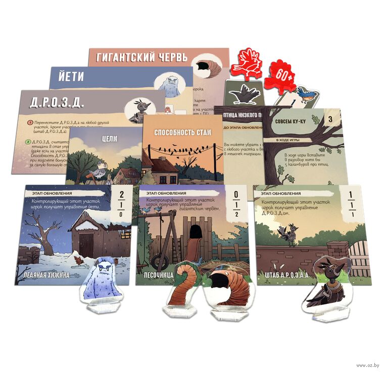 Дополнение для игры "Пернатые" содержит разнообразные уникальные компоненты: карты способностей, добавляющие асимметрии, особые обитатели фермы и дополнительные карты целей.