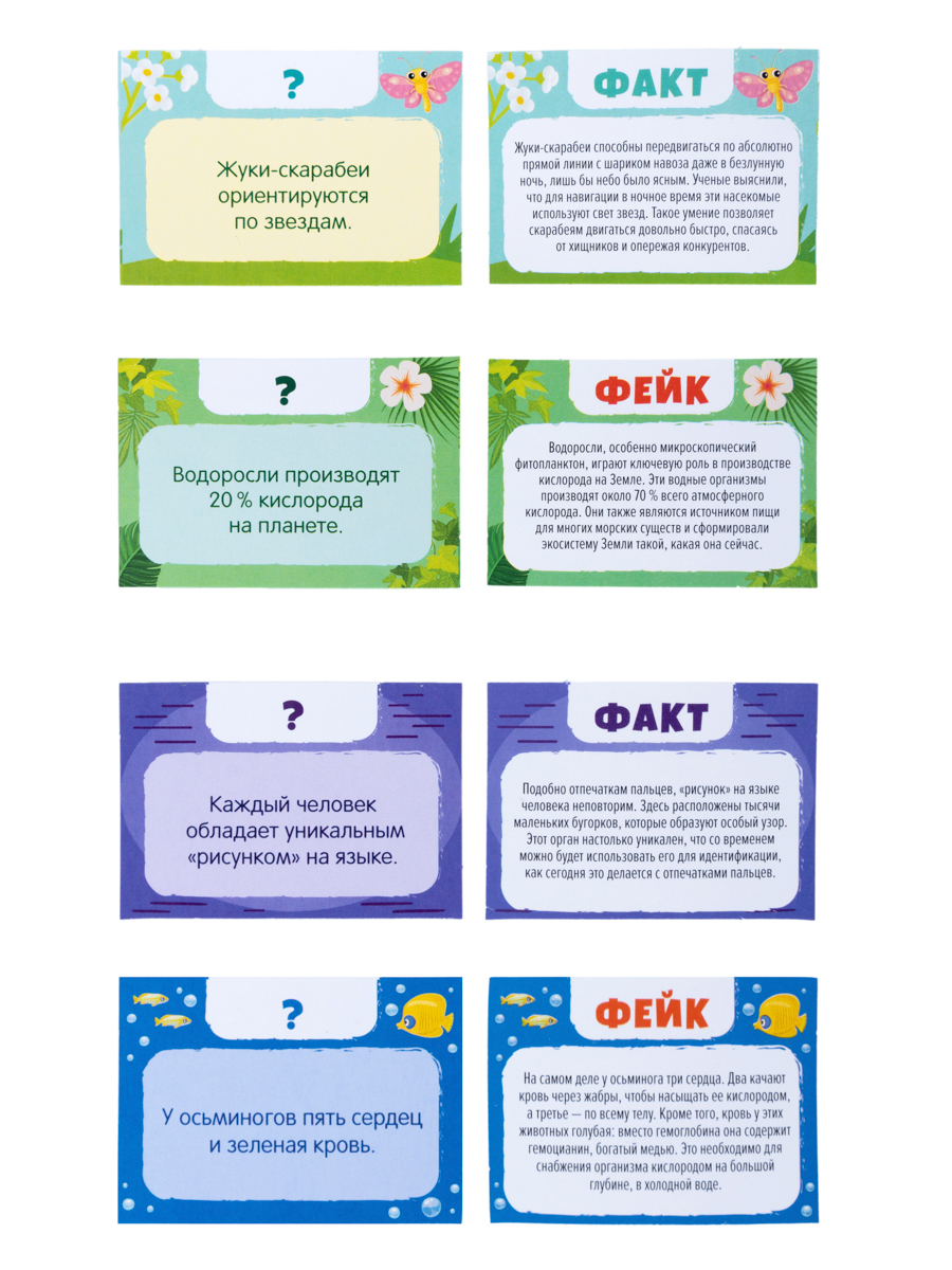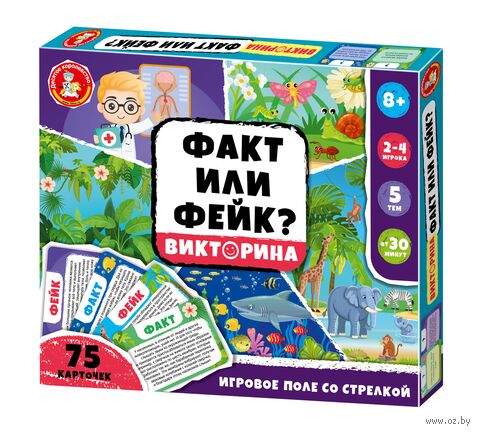 Настольная игра викторина "Факт или Фейк?" – это отличный способ весело провести время с друзьями или семьей, подготовьтесь к захватывающему сражению умов, где вам предстоит отличать правду от вымысла, опираясь на свои знания и интуицию. Проверьте уровень знаний сразу в 5 разных областях: Организм человека, Насекомые, Водные животные, Пресмыкающиеся (птицы, звери) и Растения.