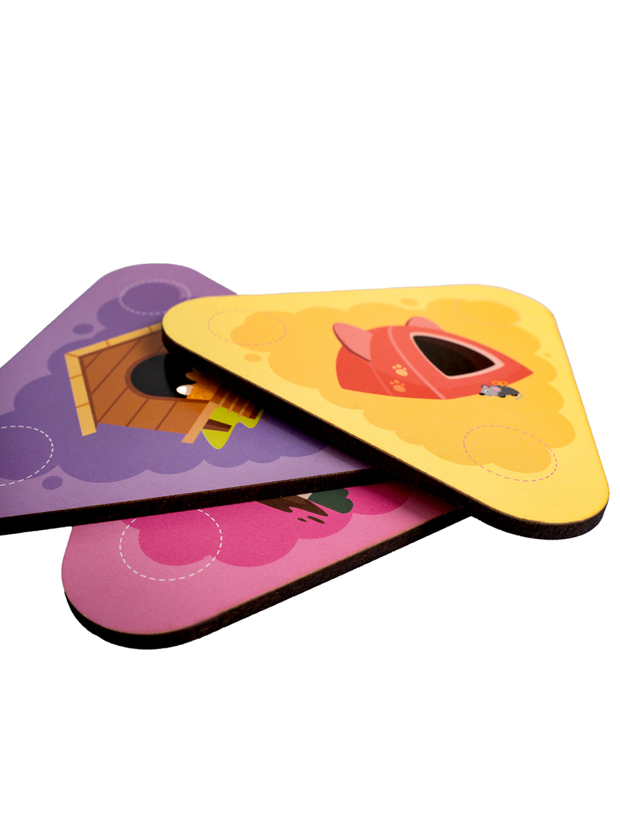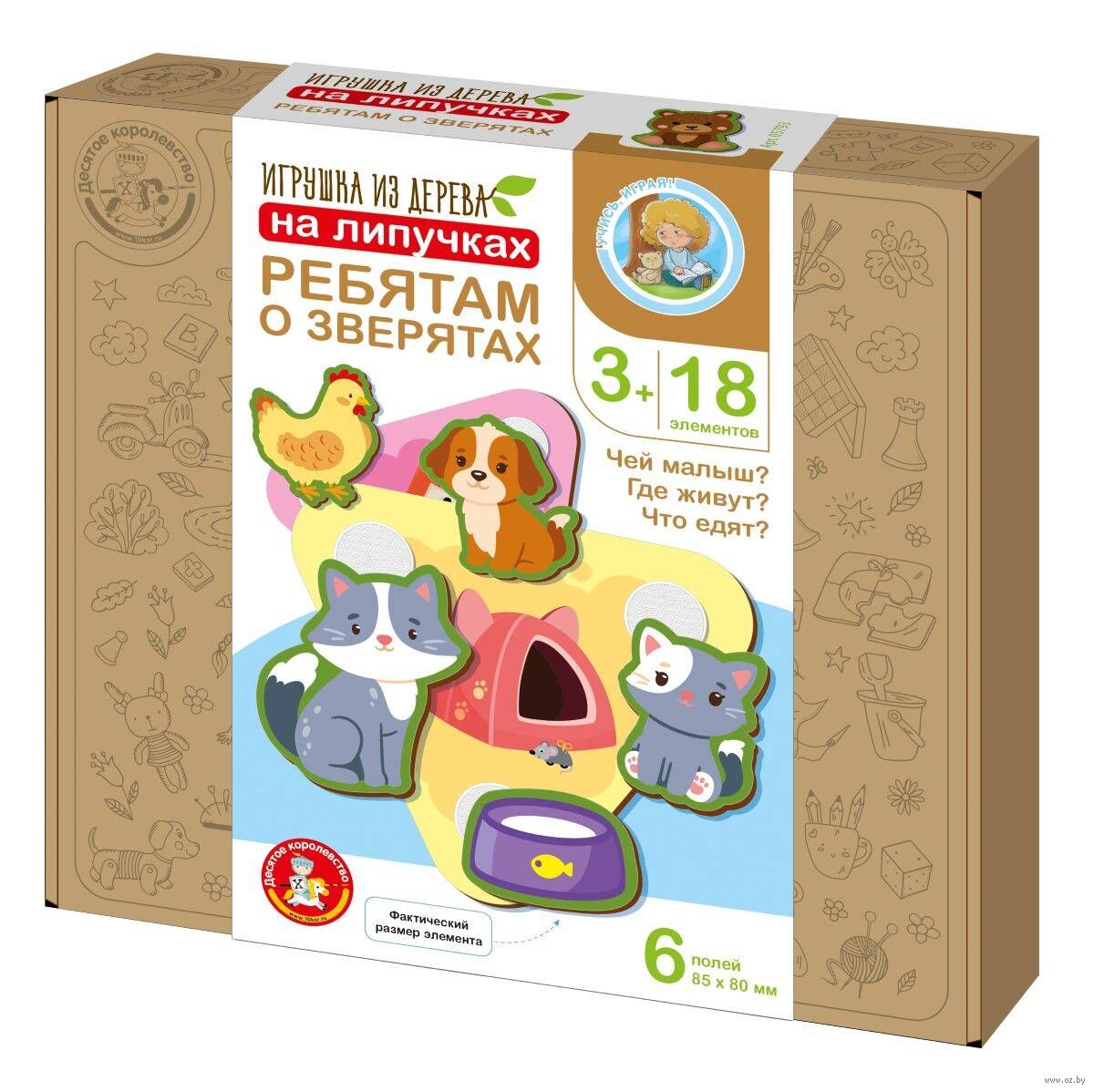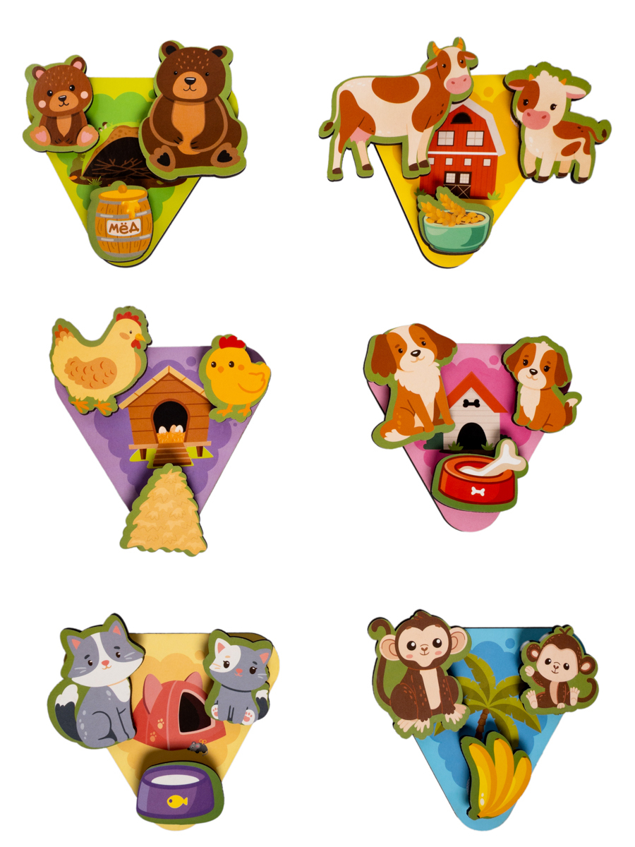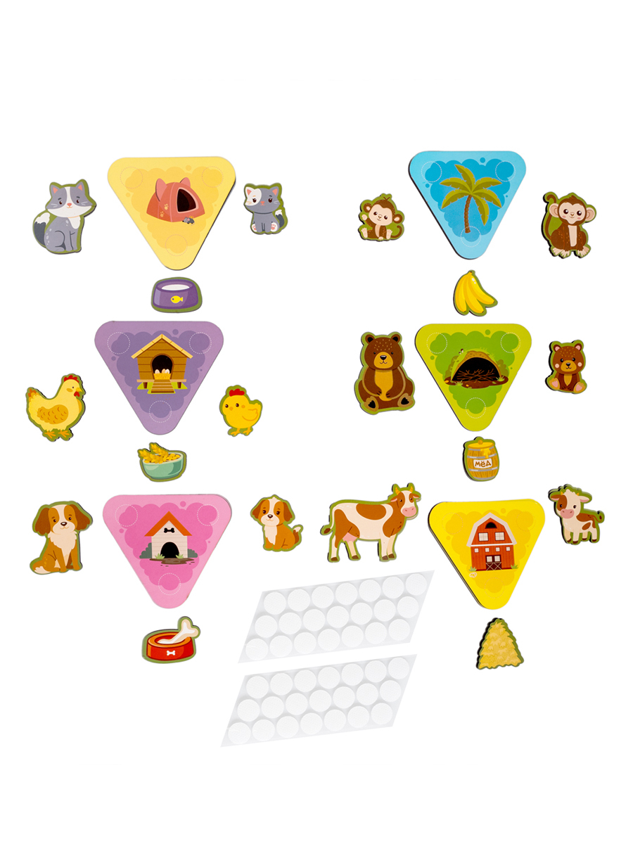 Все элементы животных и лакомства крепятся к игровым полям с помощью липучек "велькро". Ребенок должен найти, какие объекты прикрепить к определенной карточке, и точно соединить липучки, чтобы фигурка крепко держалась на картинке.