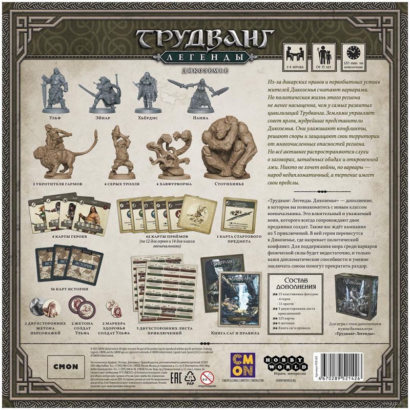 "Трудванг: Легенды. Дикоземье" – дополнение, в котором вы познакомитесь с новым классом военачальника. Это влиятельный и уважаемый воин, которого всегда сопровождают двое преданных солдат. Также вас ждёт кампания из 5 приключений. В ней герои перенесутся в Дикоземье, где назревает политический конфликт. Для поддержания мира среди варваров физической силы будет недостаточно, и только ваши дипломатические способности и умение заключать союзы помогут прекратить раздор.