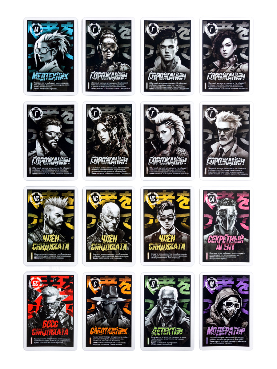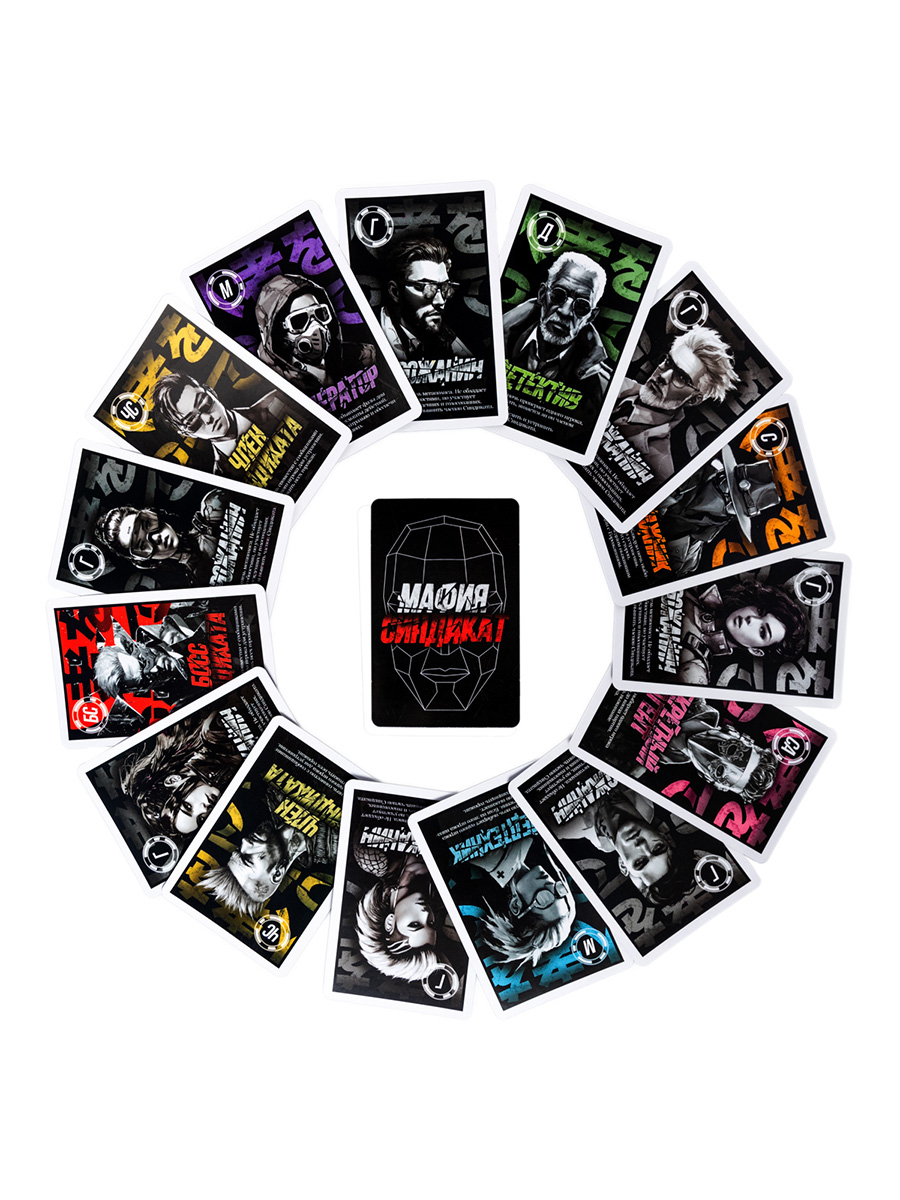 Карточки – 16 шт. (8 х 12 см.) В комплект игры входят следующие карты: модератор (ведущий), босс синдиката (мафия), участник группировки (мафия), медтехник, детектив, секретный агент, саботажник, горожанин.