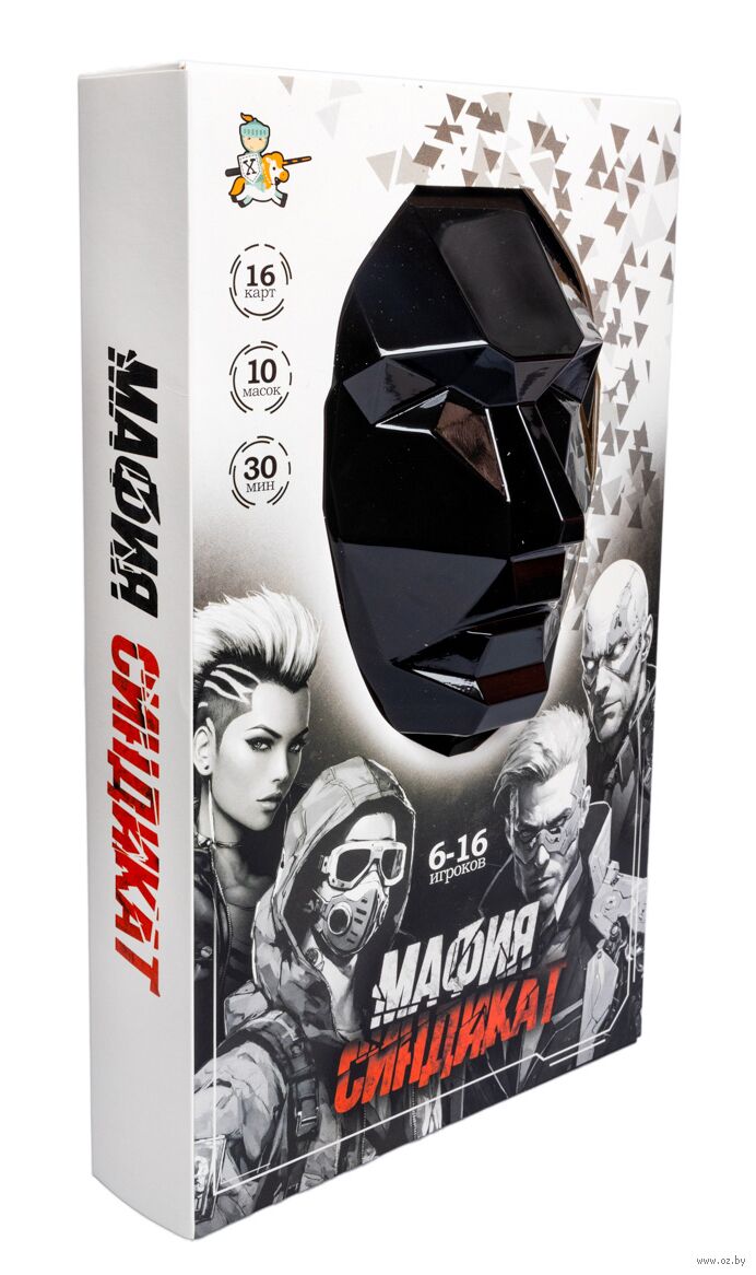 Настольная игра "Мафия Синдикат с масками" – это профессиональный набор, который включает в себя красочные карты с ролями и 10 пластиковых полигональных масок, создающих дополнительный колорит и атмосферу.