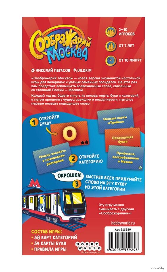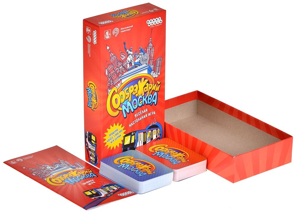 "Соображарий: Москва" – новая версия знаменитой настольной игры для вечеринок и уютных семейных посиделок. На этот раз вам предстоит вспоминать всевозможные слова, связанные со столицей России – Москвой. Каждый ход вы будете тянуть из колоды карты букв и категорий, а потом проявлять чудеса смекалки и находчивости, пытаясь первым назвать подходящее слово.