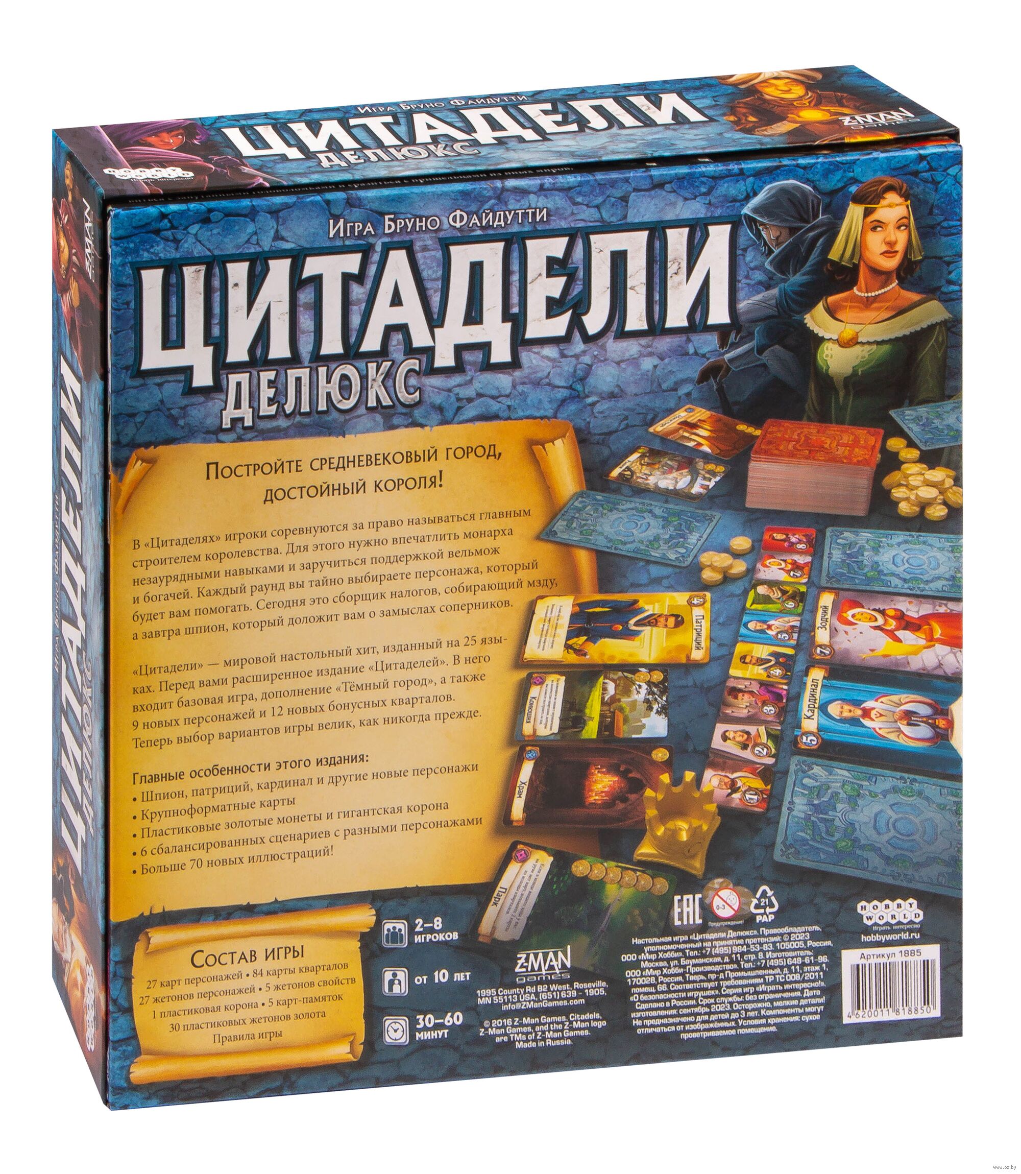 "Цитадели" – мировой настольный хит, изданный на 25 языках. Перед вами расширенное издание "Цитаделей". В него входит базовая игра, дополнение "Тёмный город", а также 9 новых персонажей и 12 новых бонусных кварталов. Теперь выбор вариантов игры велик, как никогда прежде.