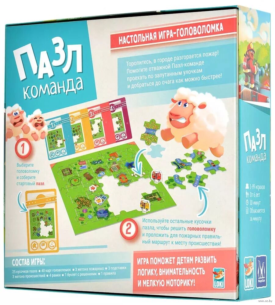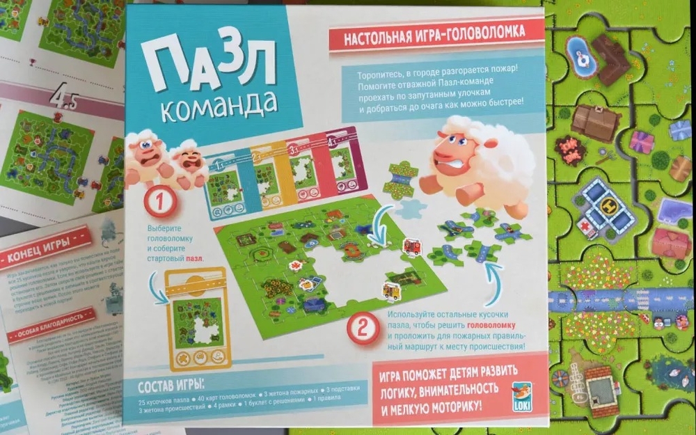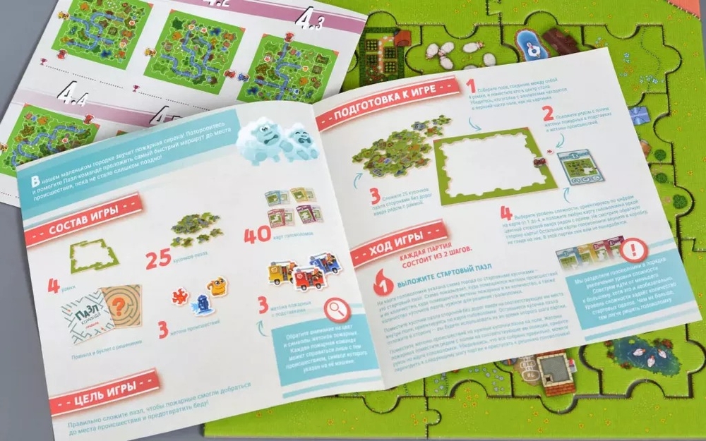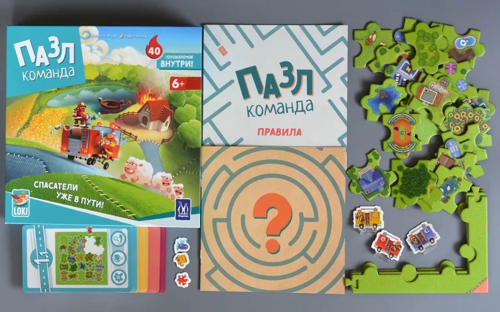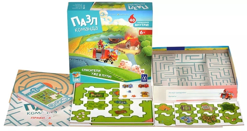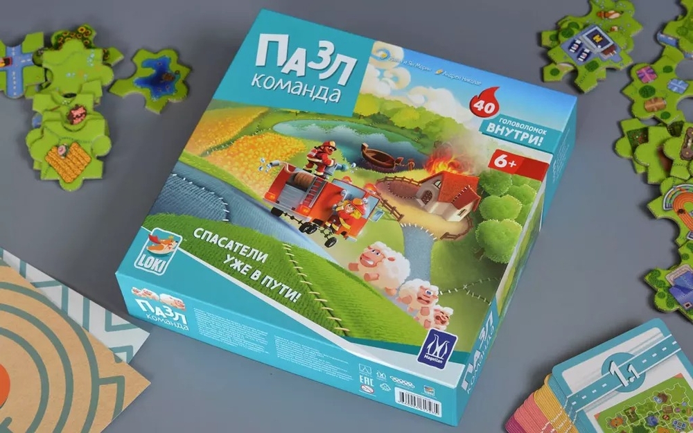 "Пазл-команда" – это настольная игра для детей, в которой игрокам предстоит решать головоломки, правильно складывая детали пазла. Им необходимо проложить маршрут пожарной машины до места происшествия, но чем дальше будут решаться головоломки, тем сложнее это будет сделать. Это кооперативная игра, так что решать головоломку могут неограниченное число игроков! А это значит, что помимо логического и пространственного мышления, игра благотворно влияет и на навыки общения юных игроков, ведь нельзя работать в команде, не обсуждая свои мысли!