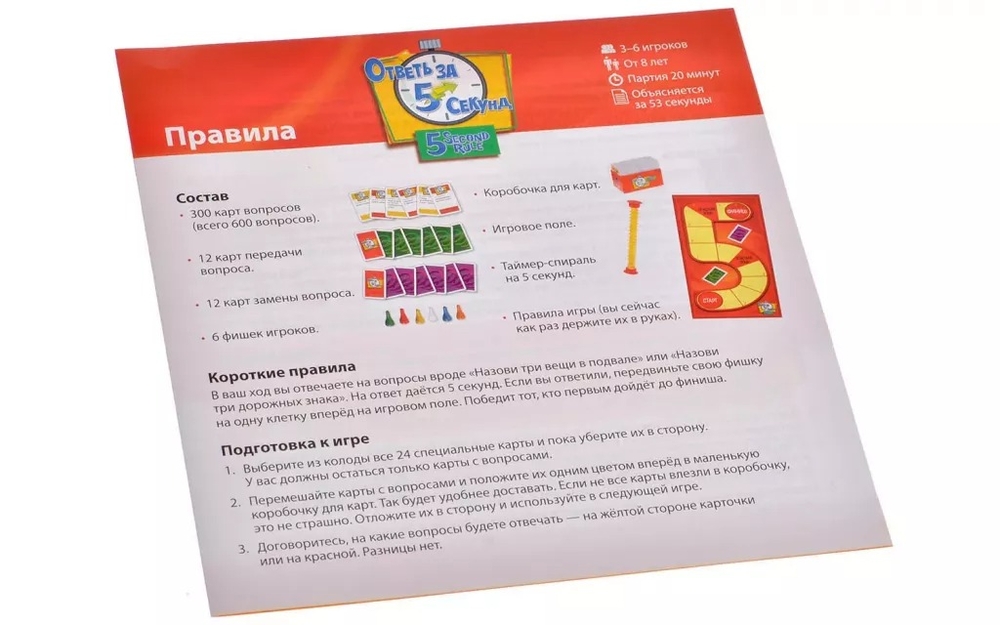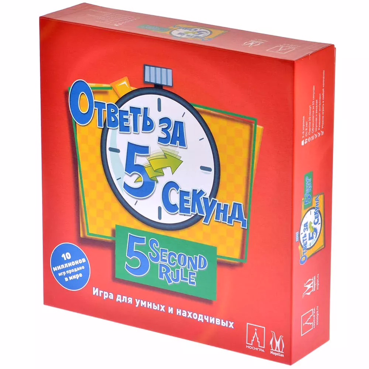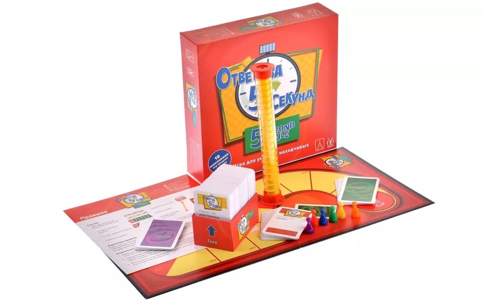 "Ответь за 5 секунд" – это быстрая и забавная викторина для весёлой компании. Правила крайне просты – нужно ответить на вопрос из карточки, и справиться с этим, как нетрудно догадаться из названия, за пять секунд. Для удобного контроля времени в комплекте с игрой вы найдёте забавный таймер-спираль с железными шариками внутри.