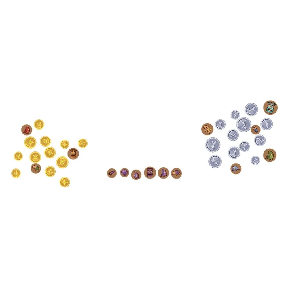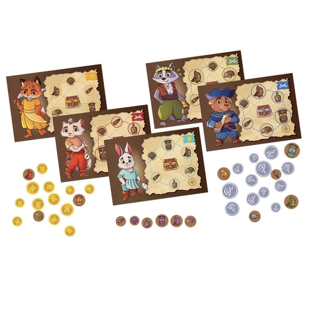 Каждый игрок выбирает планшет своего героя, он же по совместительству станет вашей картой сокровищ, на которой указаны нужные вам ориентиры. Переверните жетоны ориентиров лицевой стороной вниз и перемешайте их. Кар-р-рамба, самое время начинать поиски!