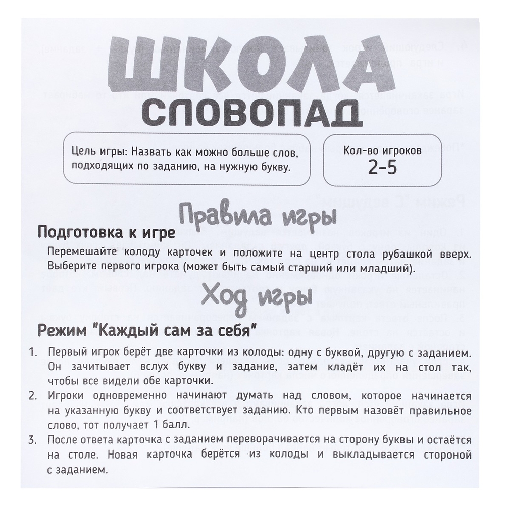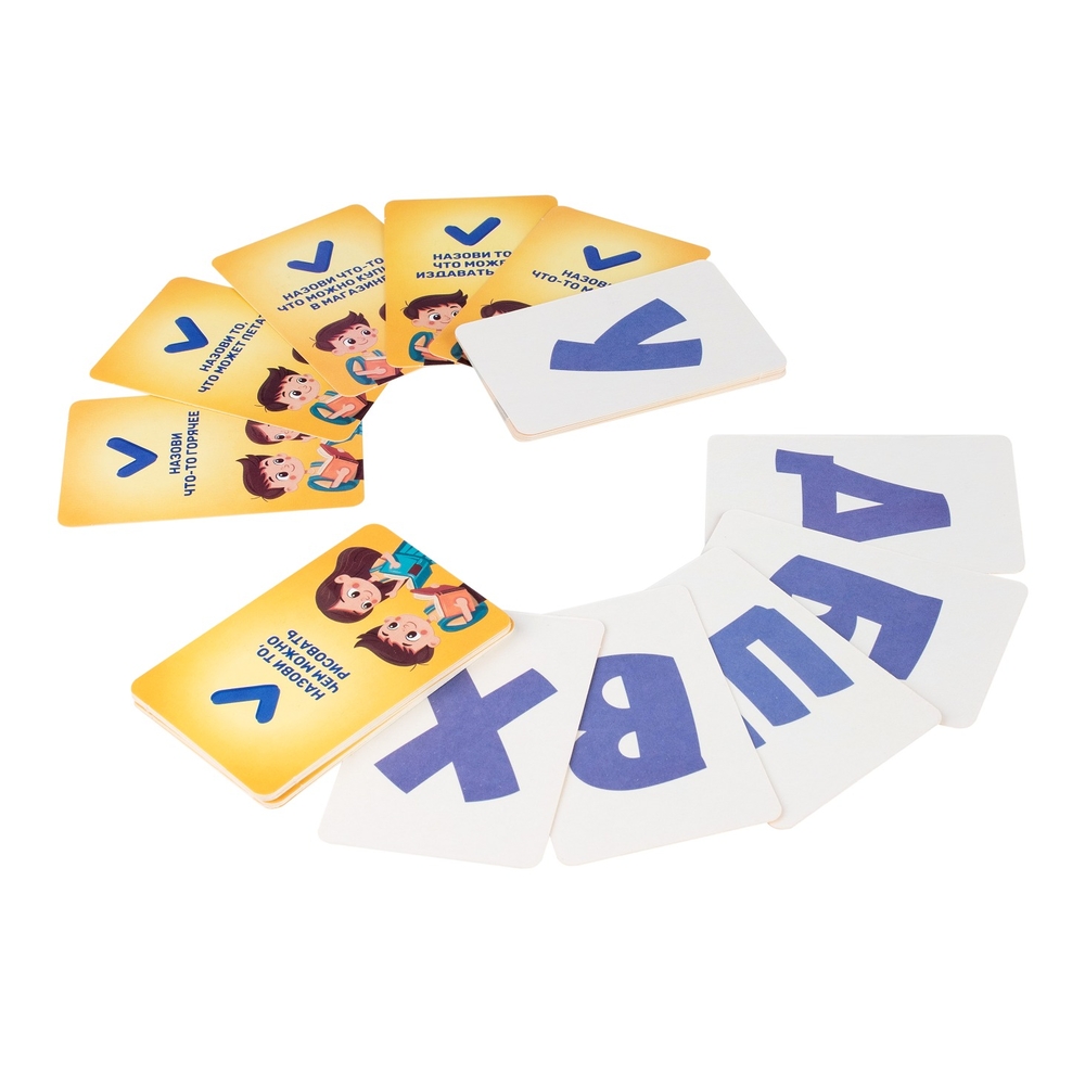 Ход игры: игрок тянет две карточки: букву и задание. Участники соревнуются, чтобы первыми назвать слово, которое: начинается на указанную букву. Соответствует заданию (например, на "К" и "Животное" → "Кошка"). Победитель раунда получает 1 балл.