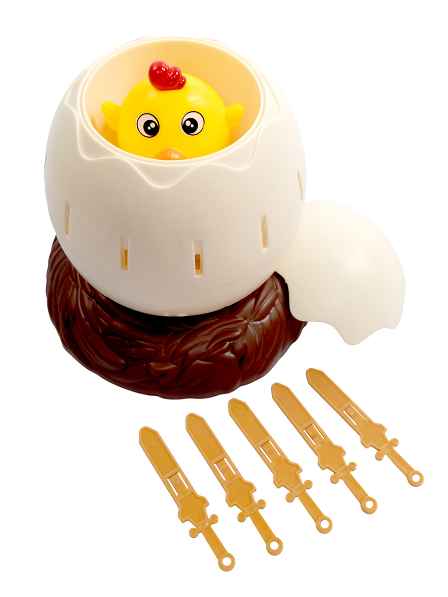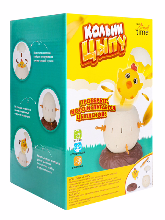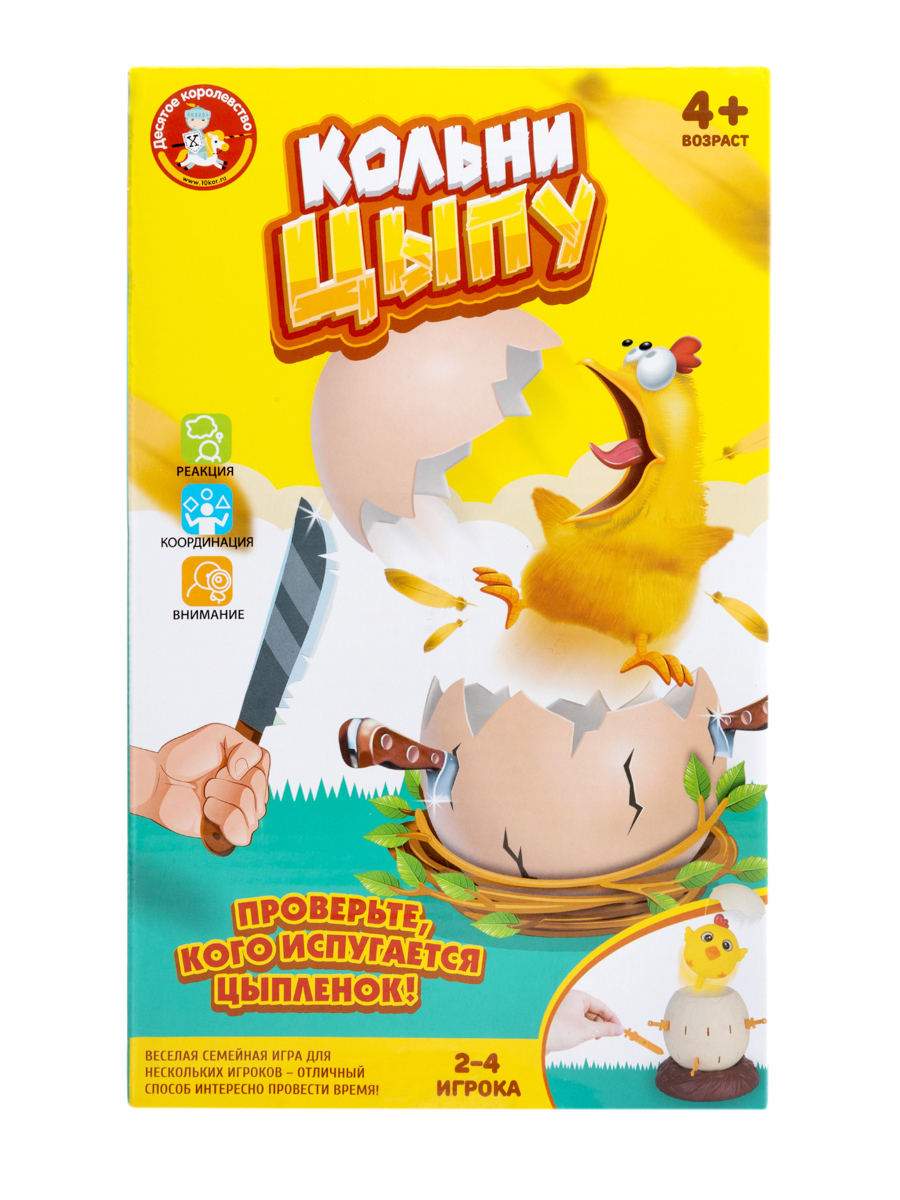 Настольная игра для детей "Кольни цыпу" – это игра на быстроту реакции и внимание для 2-4 игроков. Задача – первым кольнуть цыпленка, чтобы он выскочил из яйца.