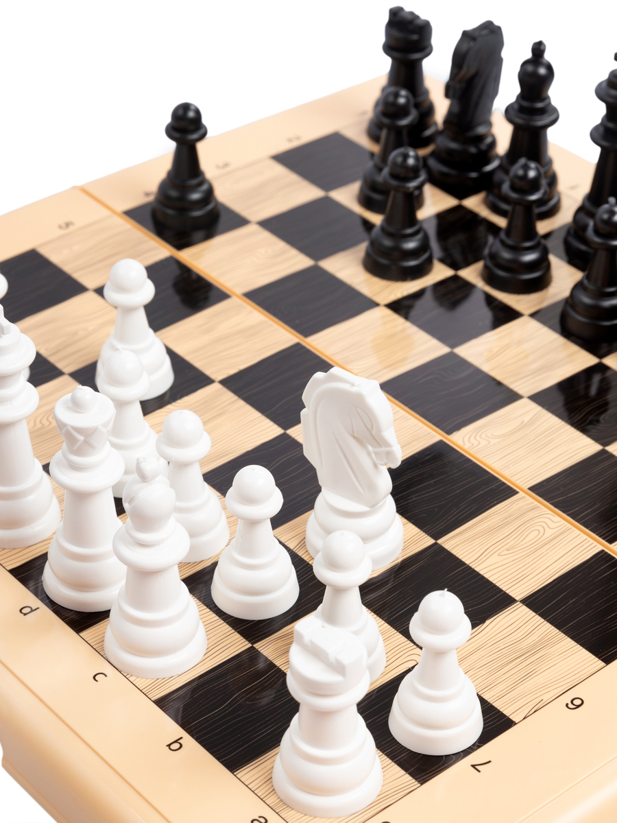 Набор "Шахматы" в бежевой пластиковой коробке благодаря небольшому весу удобно брать с собой и осваивать азы игры в любом месте.