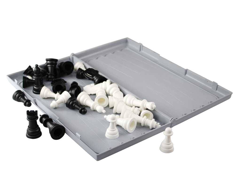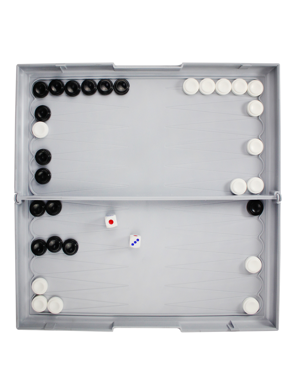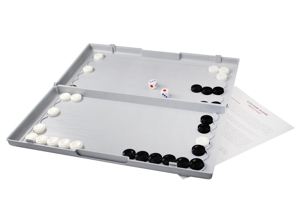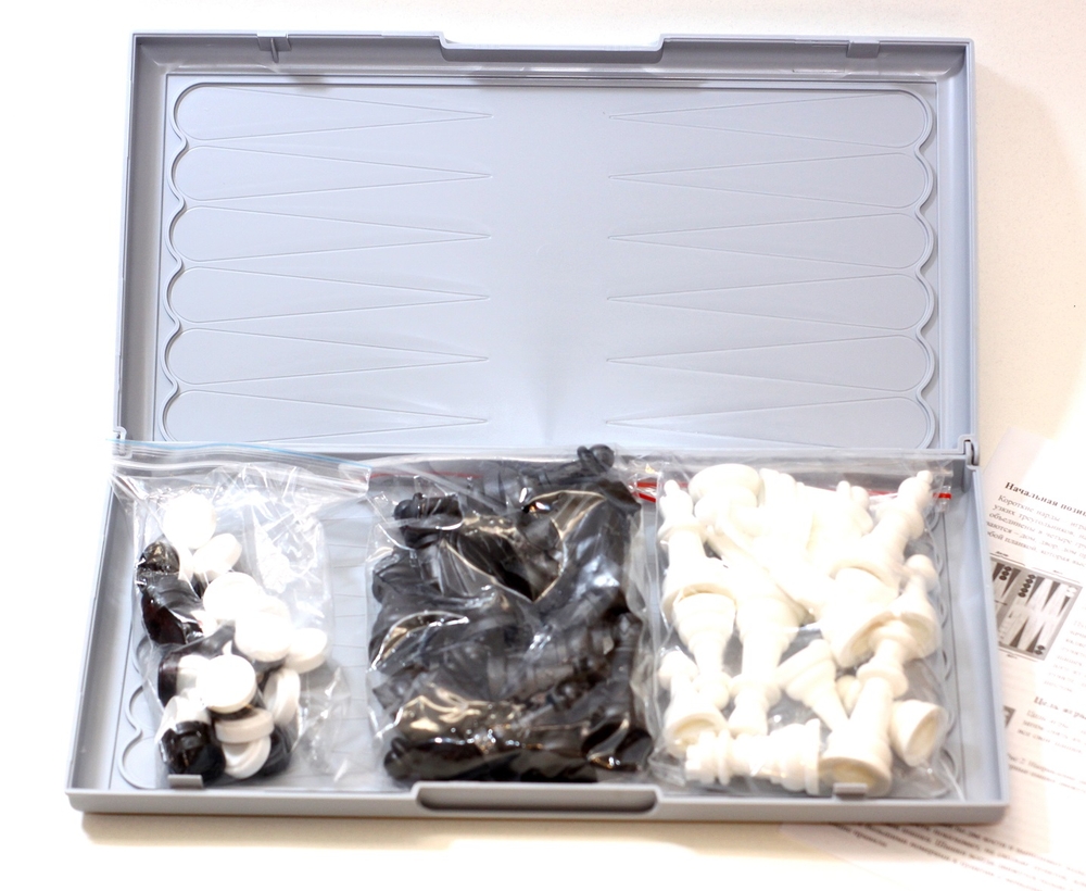Набор состоит из двухстороннего игрового поля: одна сторона поля предназначена для игры в шахматы и шашки, вторая – для игры в нарды. Края у игрового поля скруглены, и оно легко складывается пополам.