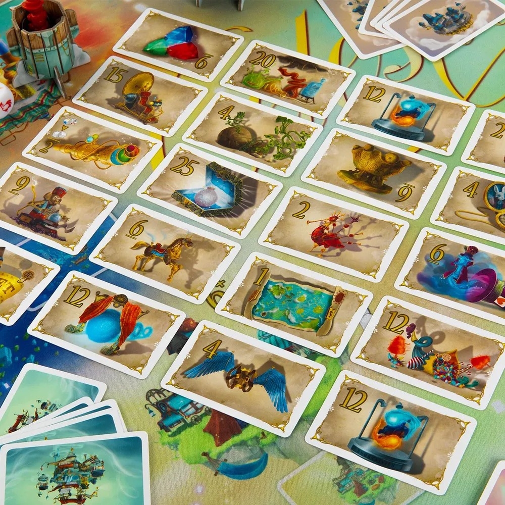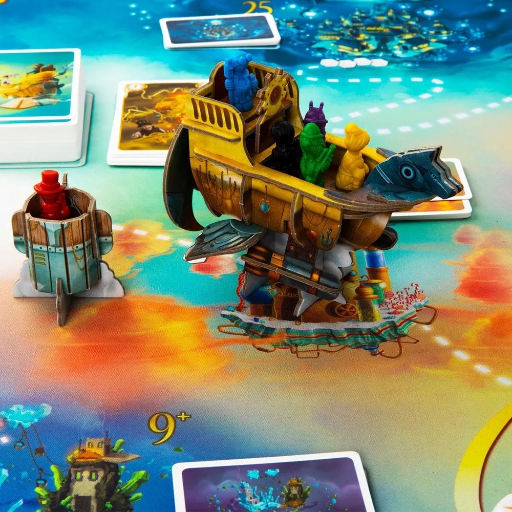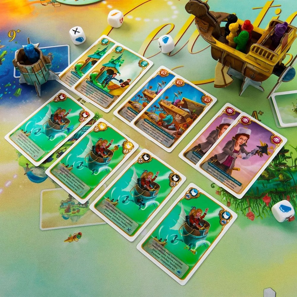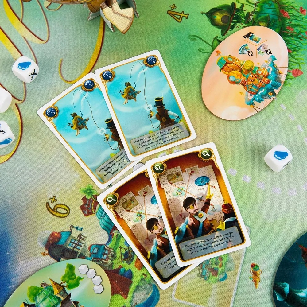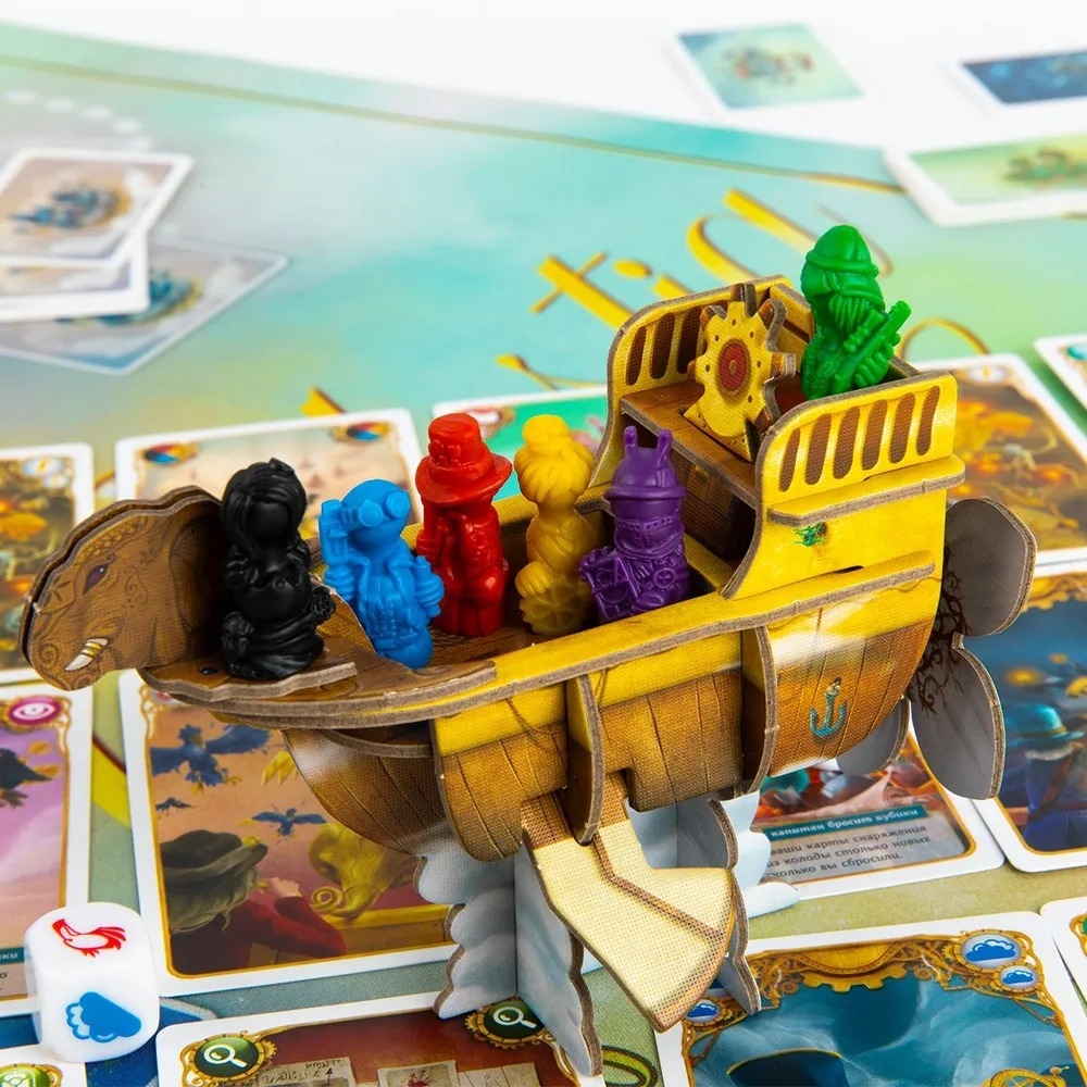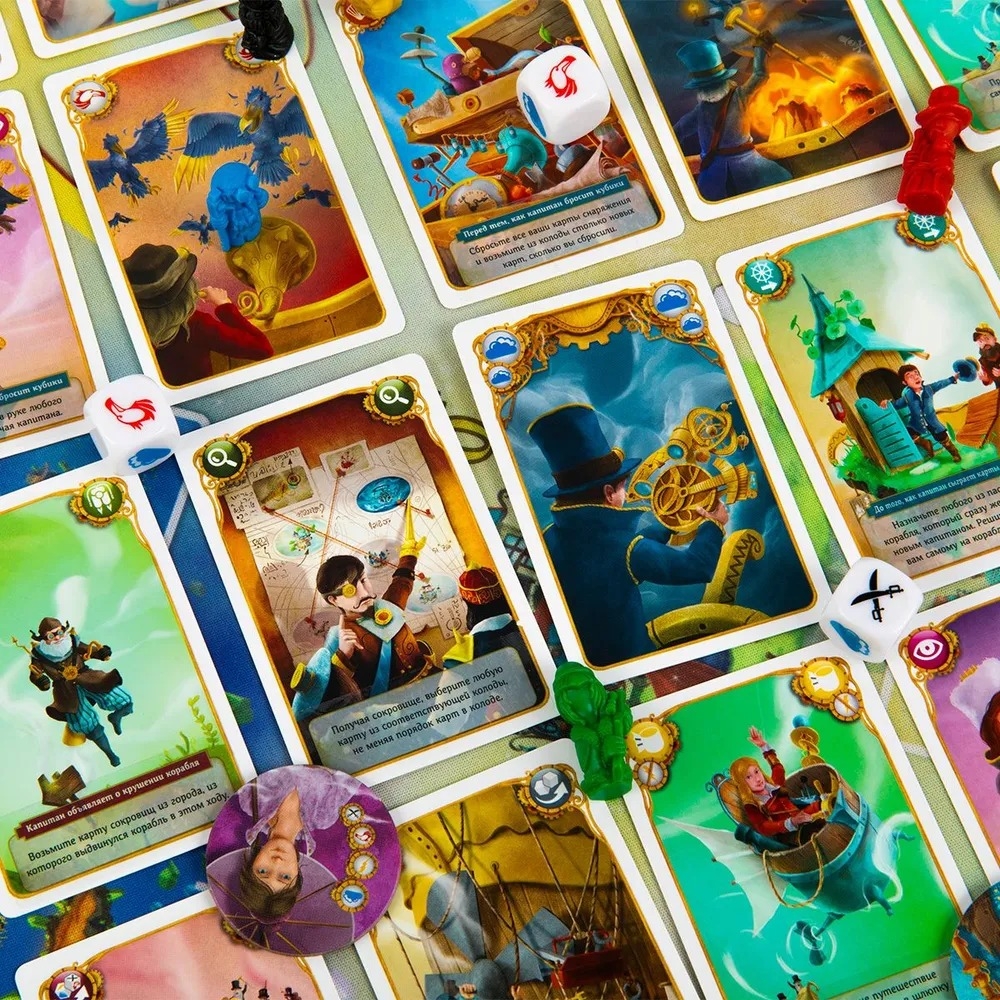 Подготовьте карты сокровищ, разложите города и поставьте корабль на старт! Каждый раунд – это новое испытание: капитан бросает кубики, определяя препятствия, а пассажиры решают, лететь дальше или сойти. Если капитан преодолеет все трудности, корабль двинется к следующему городу, и сокровища станут ещё ценнее. Если нет – крушение вернёт всех на старт! Используйте карты снаряжения, турбо-ускорения и специальные способности, чтобы перехитрить соперников. Дополнения добавляют новые возможности: например, карты "Рука помощи" спасут корабль от крушения, а шлюпка позволит отправиться в самостоятельное путешествие.