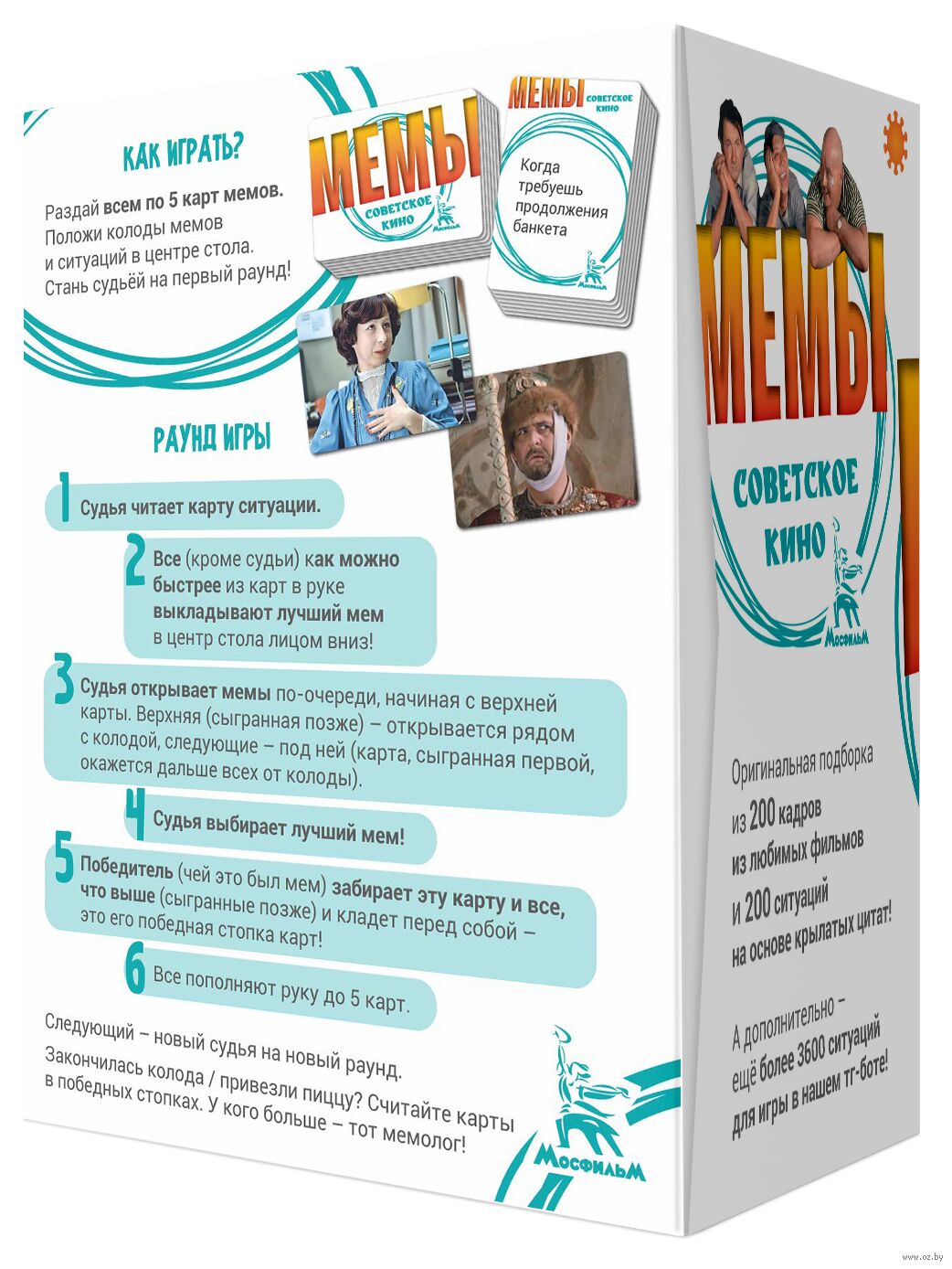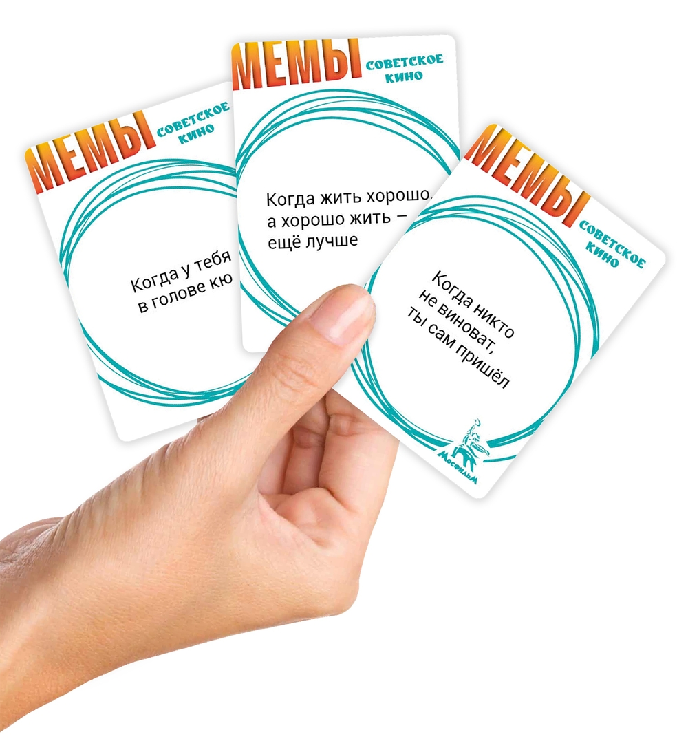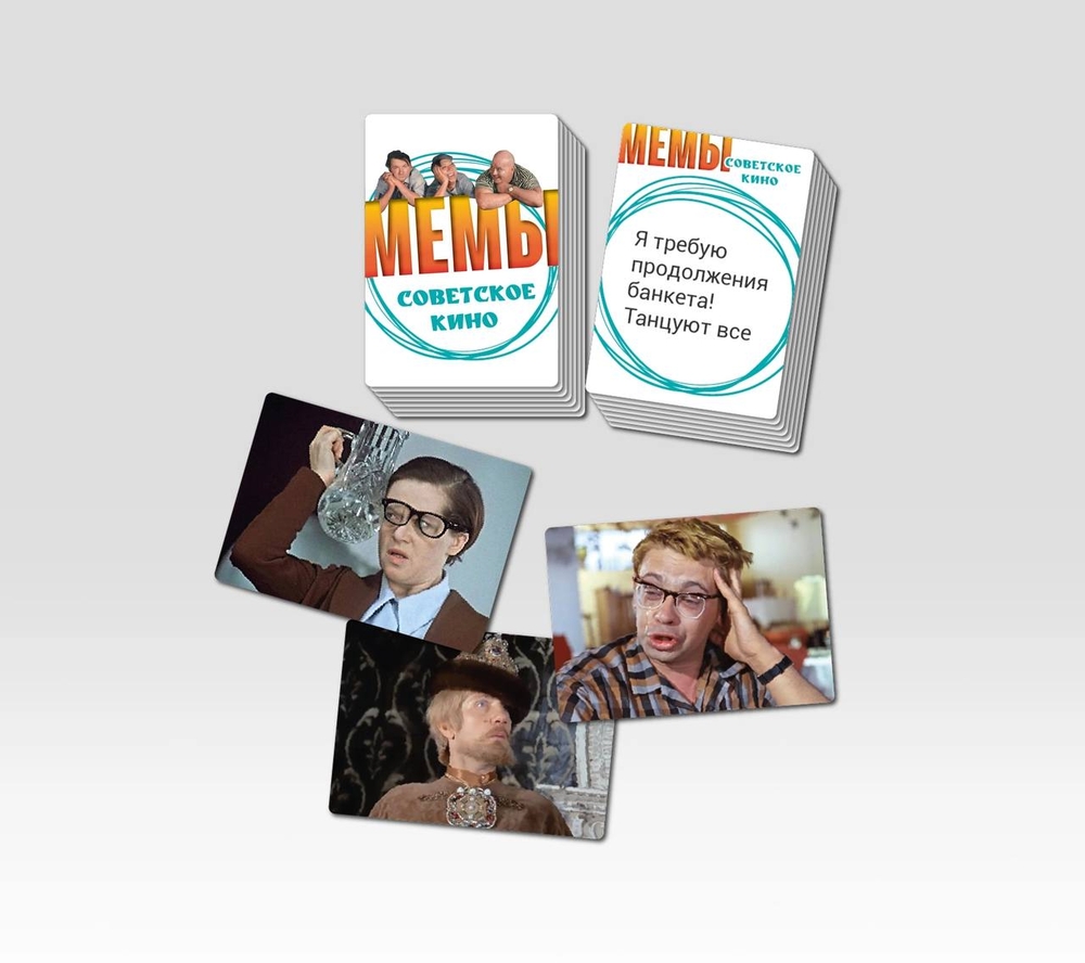 Правила не изменились: игроки зачитывают ситуацию, выкладывают к ней мемы и выбирают самый смешной вариант. А наполнение – ситуации и карты с мемами – вызывает и любопытство, и ностальгию. Сегодня мы играем в советский кинематограф, вечный источник любимых мемов и цитат.