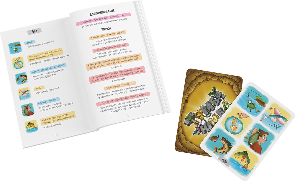 Два типа карточек (сине-зелёные для существительных и коричневые для глаголов и признаков) знакомят с разными словами и ситуациями, где они используются.
