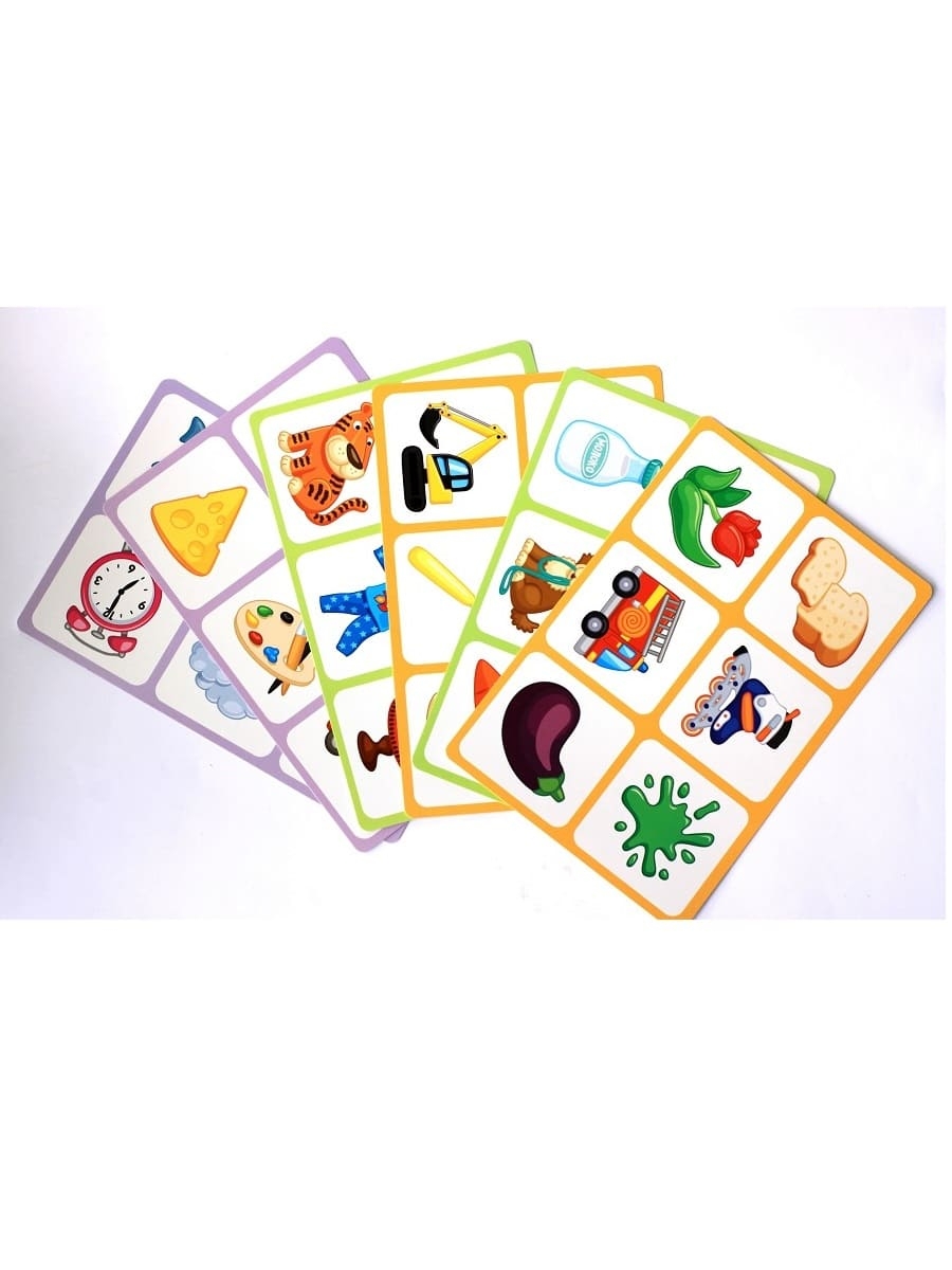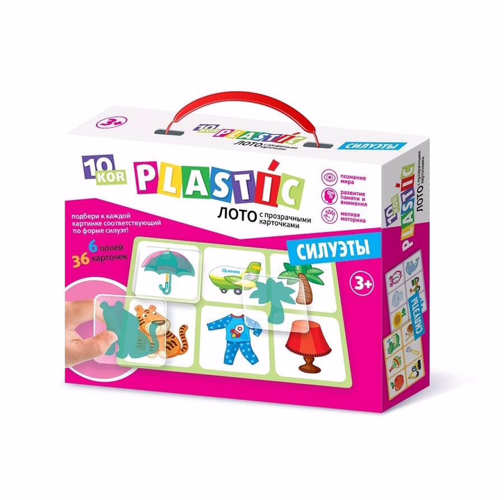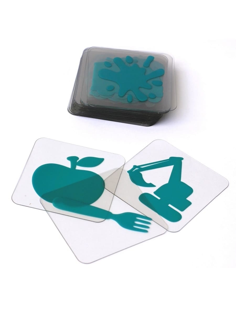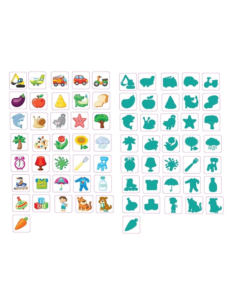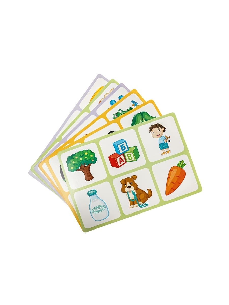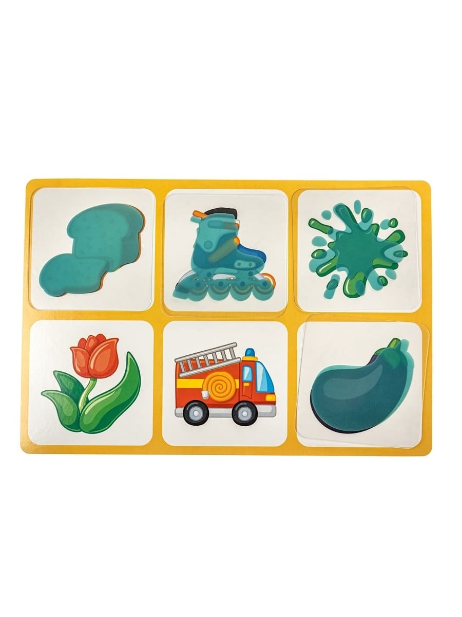 Каждый игрок получает игровое поле – картонную карточку с 6 яркими картинками. К каждой картинке подходит соответствующая прозрачная карточка, на которую нанесён синий силуэт объекта с картинки.