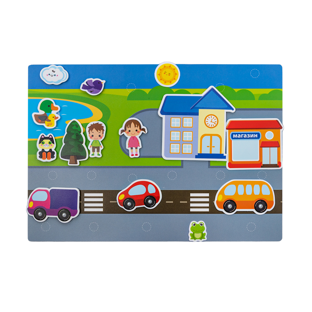 С развивающей игрой Пластик на липучках "Городок" дети в игровой форме познакомятся с объектами, окружающими их в городе.