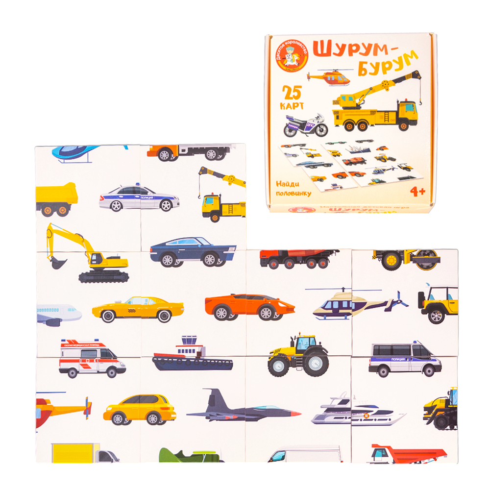 Настольная игра для детей "Шурум-Бурум. Найди половинку" (транспорт) – это занимательная игра для мальчиков. Она поможет с пользой провести время, собирая из карточек яркие изображения автомобилей, самолетов, кораблей и строительной техники. Удобная коробочка не занимает много места и позволяет брать игру в дорогу или в гости.