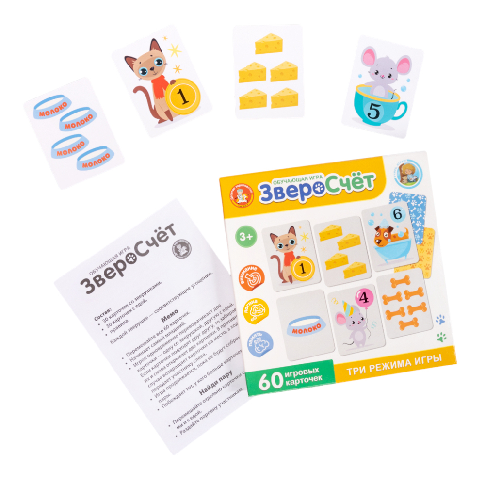 С помощью обучающей игры для детей "ЗвероСчёт" ваш малыш в увлекательной форме освоит счет. В наборе карточки с изображением симпатичных зверушек и их еды.
