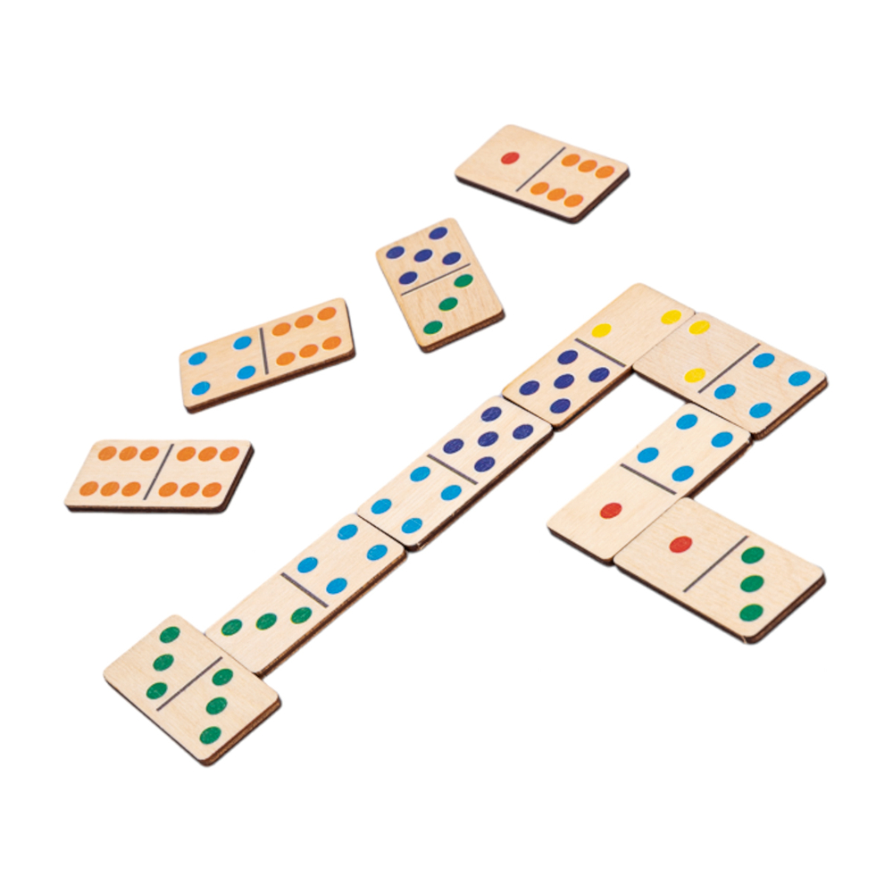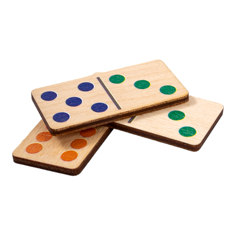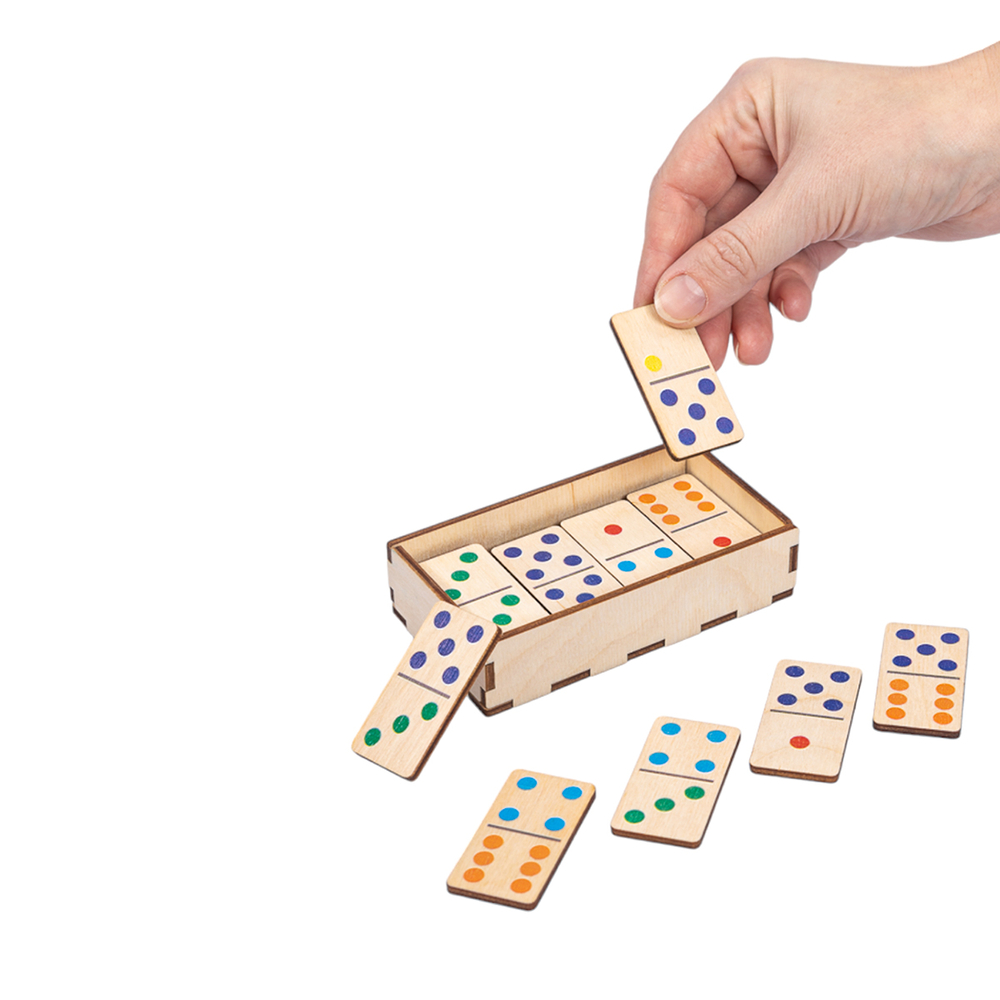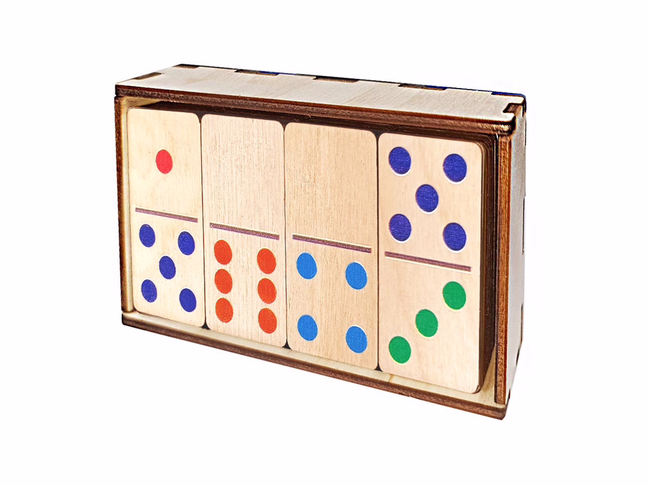 Фишки домино выполнены из экологически чистой березовой фанеры и хранятся в коробочке из древесного материала.
