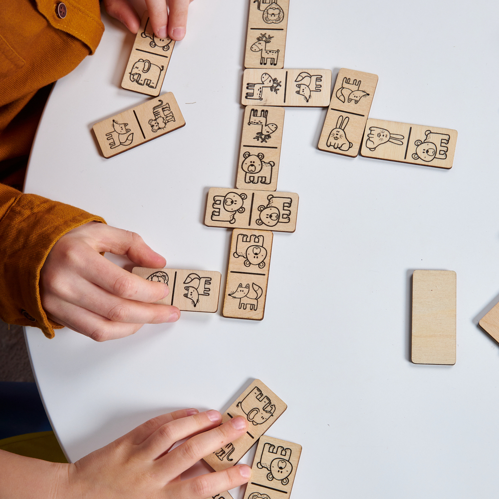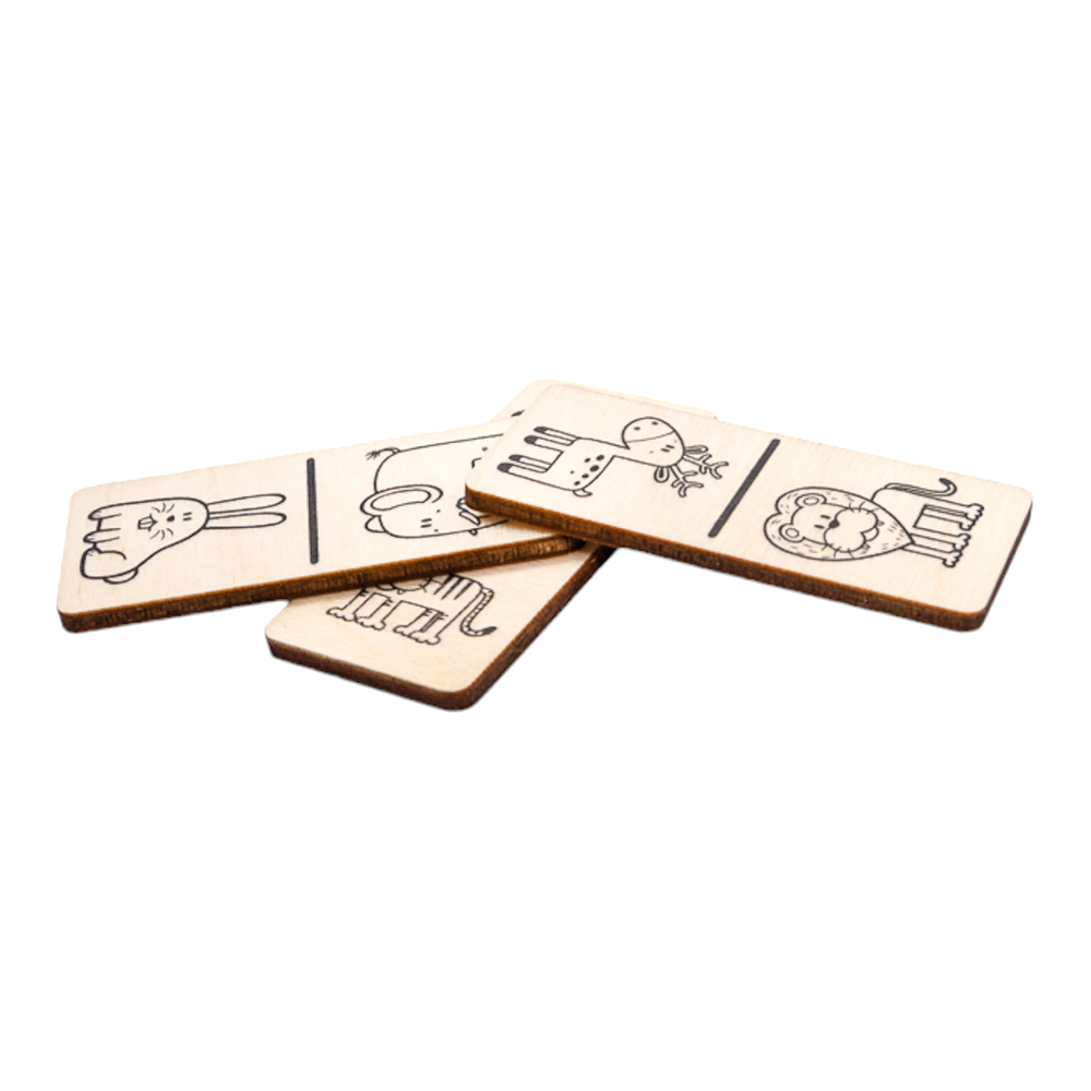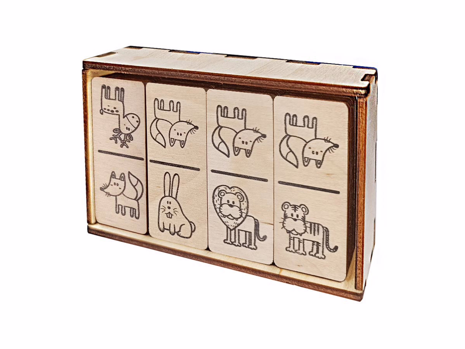 Фишки домино выполнены из экологически чистой березовой фанеры и хранятся в коробочке из древесного материала.