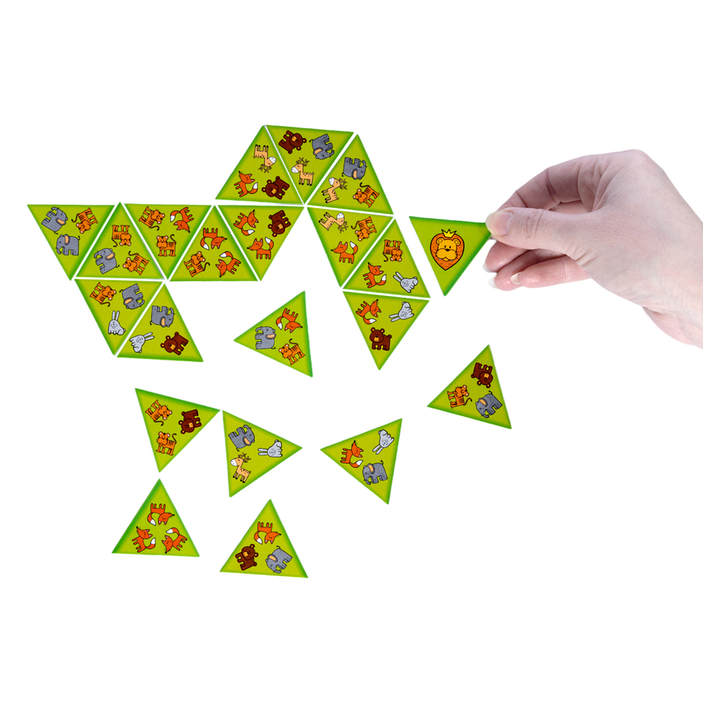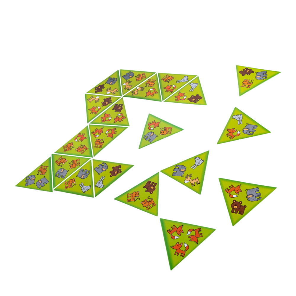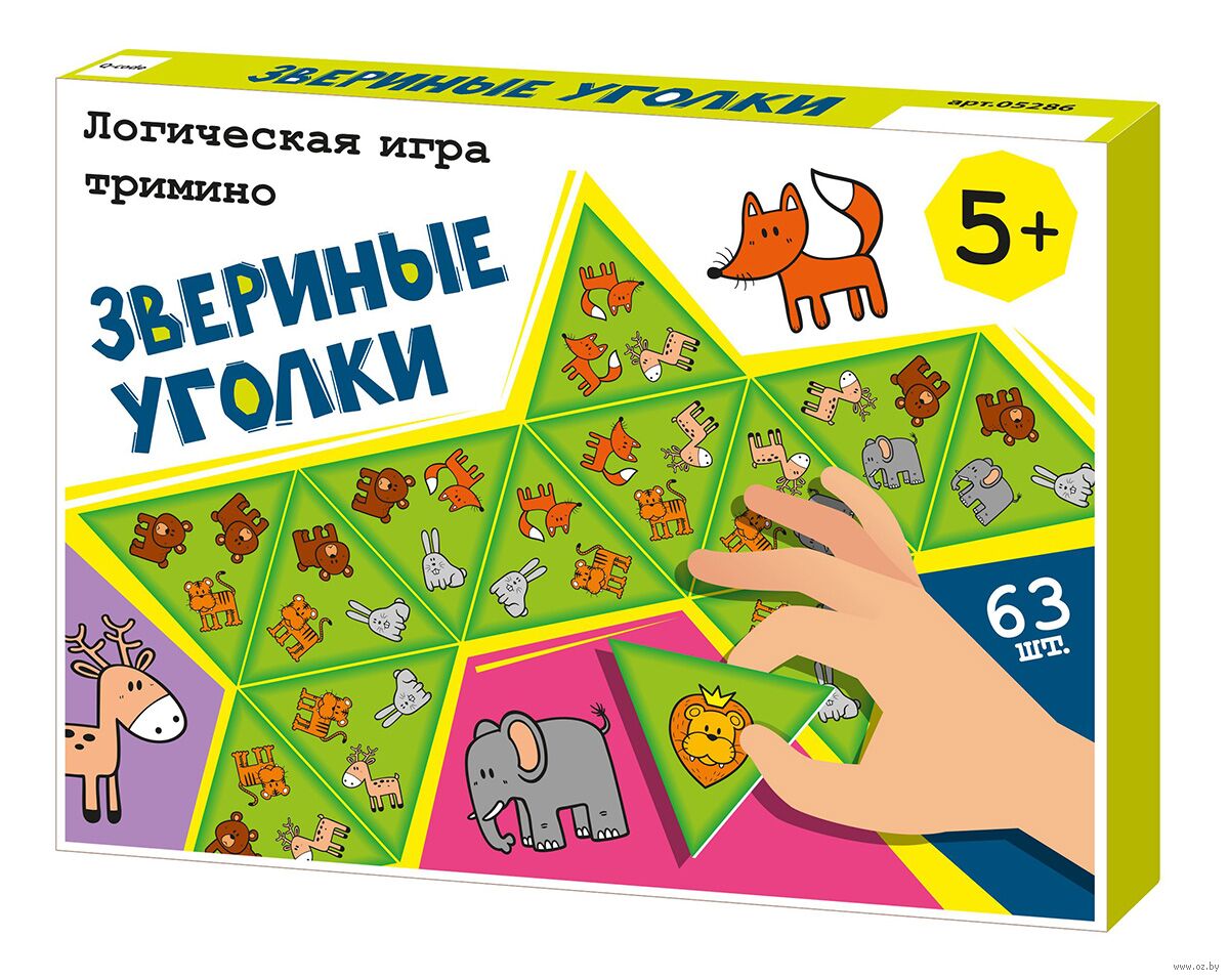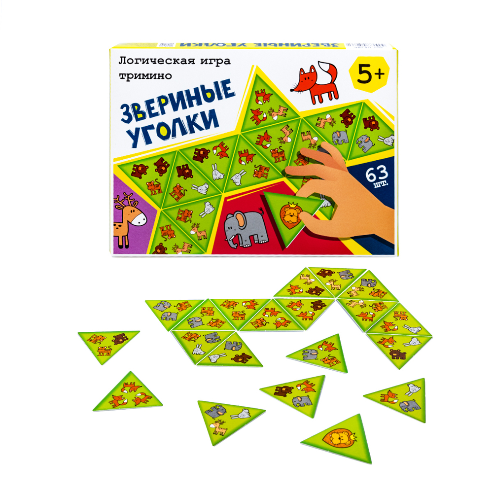 Логическая настольная игра для детей "Звериные уголки" – это захватывающее приключение для самых внимательных и сообразительных. Тримино – аналог домино с фишками треугольной формы. В наборе есть карточки с изображением разноцветных геометрических фигур.