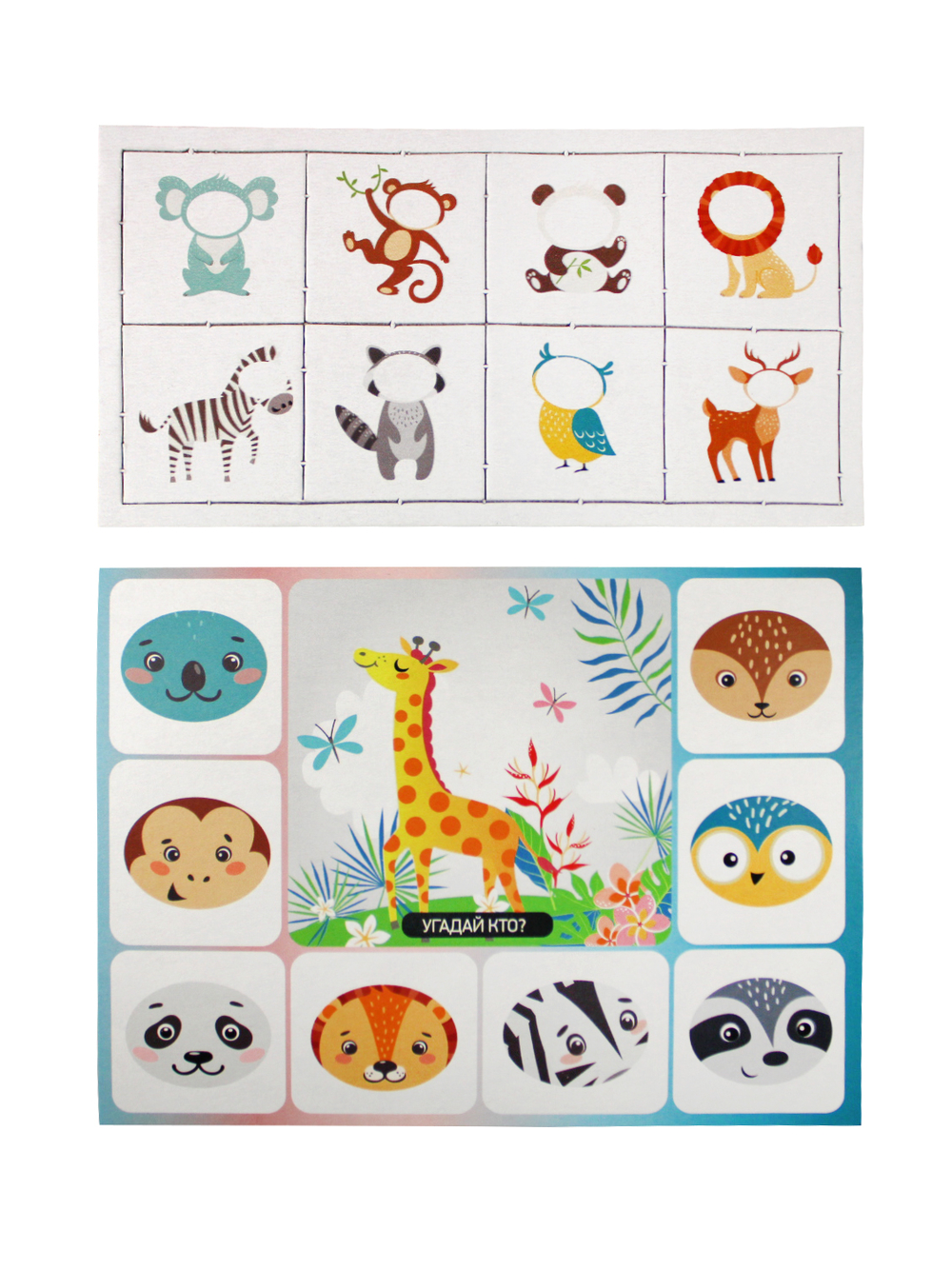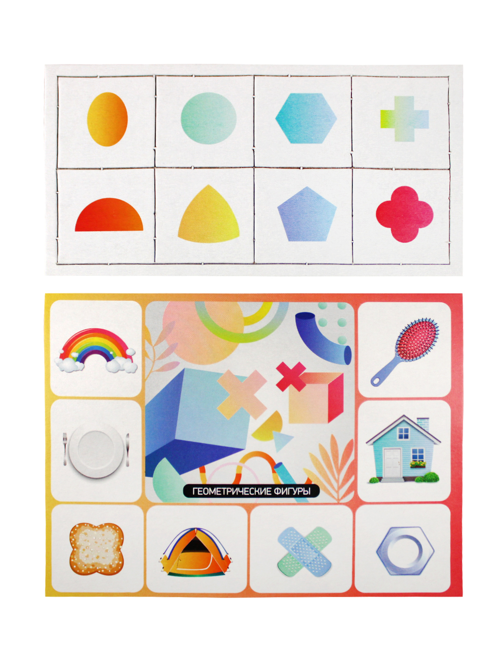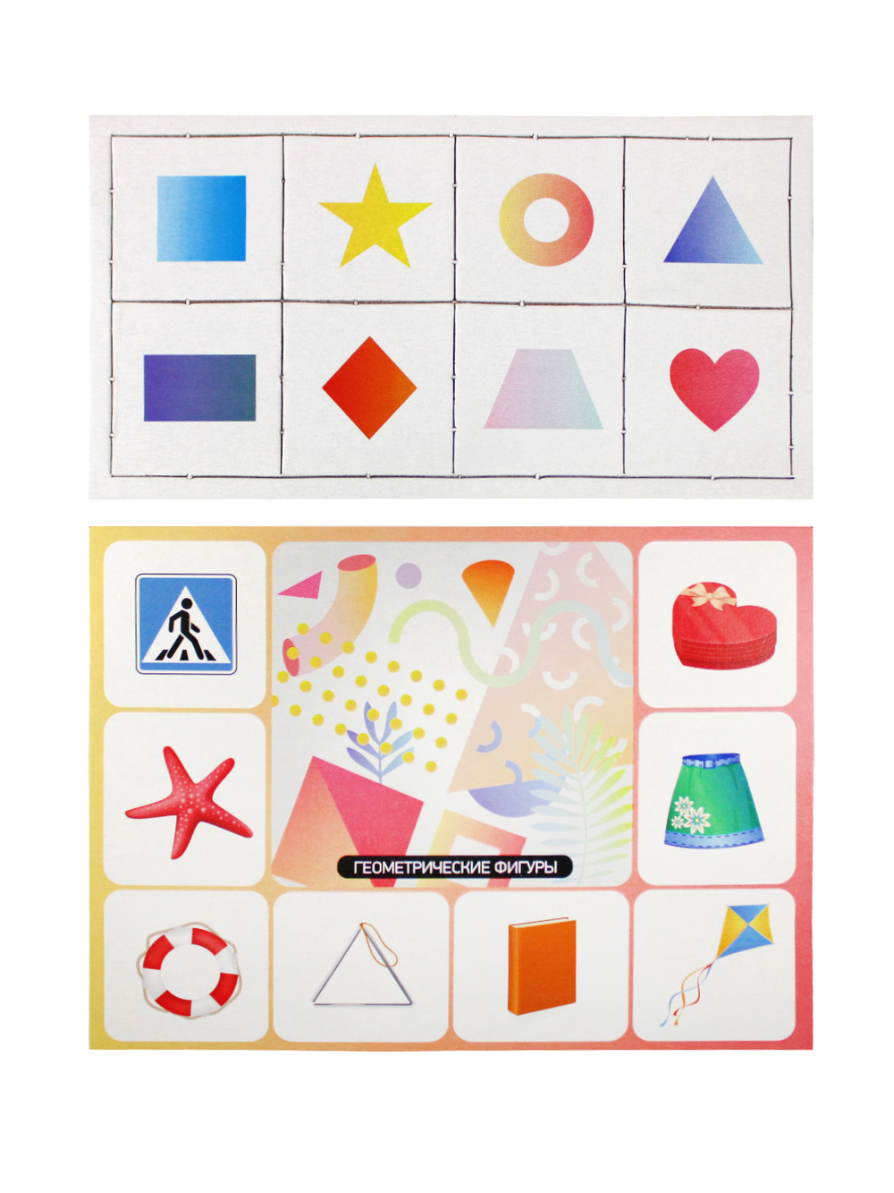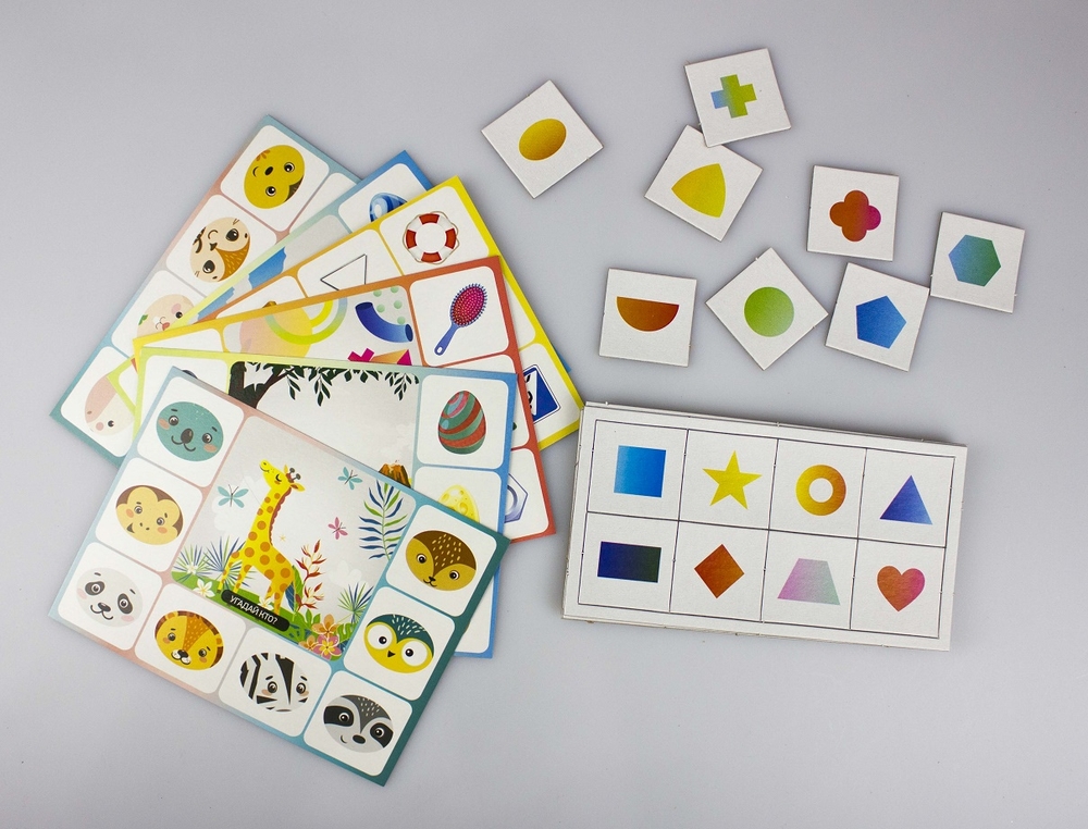 Лото состоит из 6 больших тематических картонных карточек и 48 маленьких, на каждой из которых изображены геометрические фигуры, животные и разные предметы. Увлекательная игра научит детей различать большинство геометрических фигур не только по форме, но и по цвету. Во время игры ребёнок вспомнит названия тех животных, которых уже знал, и познакомится с новыми.