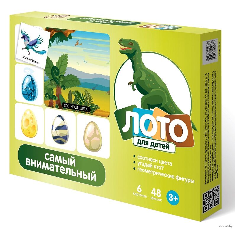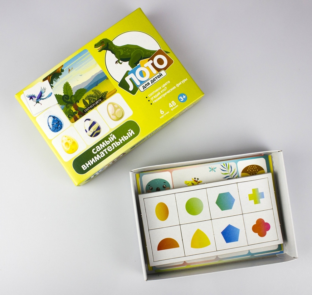 Картонное развивающее детское лото "Самый внимательный" включает в себя три задания: "Соотнеси цвета", "Угадай, кто" и "Геометрические фигуры".