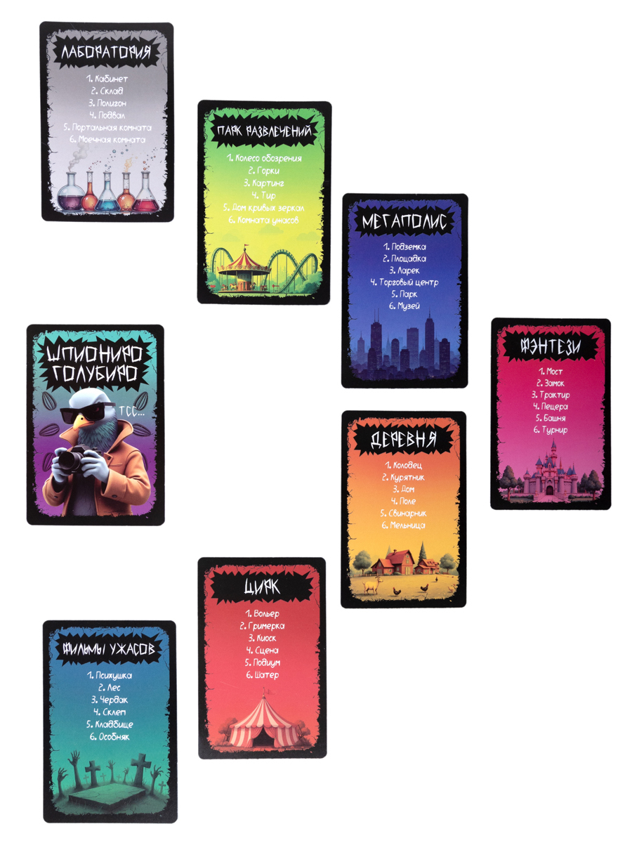 Возьмите лист бумаги и ручку, чтобы записывать баллы и решите сколько раундов будет длится игра. Разложите карточки по темам, должно получится 11 колод по 5 карт. Переверните колоды рубашкой вверх, поменяйте местами и выберите одну наугад. Ведущий смотрит какая выпала тема и сообщает остальным, пересчитывает всех игроков включая себя, оставляет в колоде на одну карту меньше и добавляет в нее карточку голубиного шпиона, перемешивает. Раздаем каждому игроку по одной карте которую видит только ее владелец. Ведущий бросает кубик, чтобы выбрать локацию для раунда на ваших карточках. Засекаем время на таймере 6-7 минут в зависимости от количества игроков.