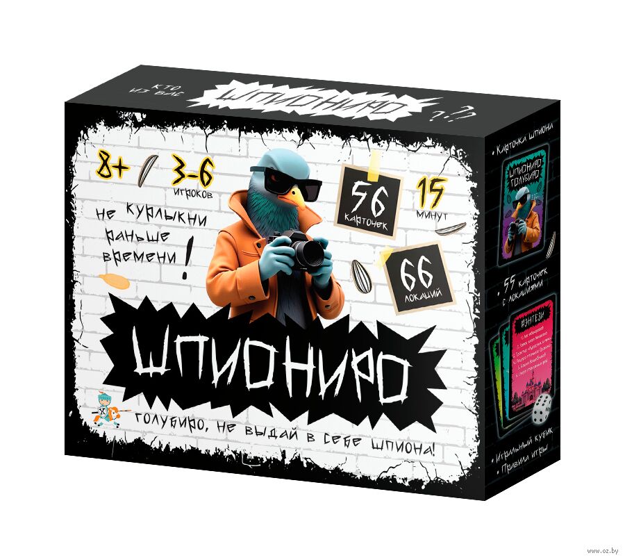 Добро пожаловать в мир "Шпиониро", где интриги плетутся под самым носом, а секреты хранятся под крылом! Эта настольная игра, в которой кубик бросает вызов, а 66 локаций таят в себе ключи к победе, превратит вас в настоящего голубиного шпиона, достойного звания лучшего среди пернатых агентов. Готовы ли вы принять вызов Шпиониро Голубиро и доказать свою смекалку?