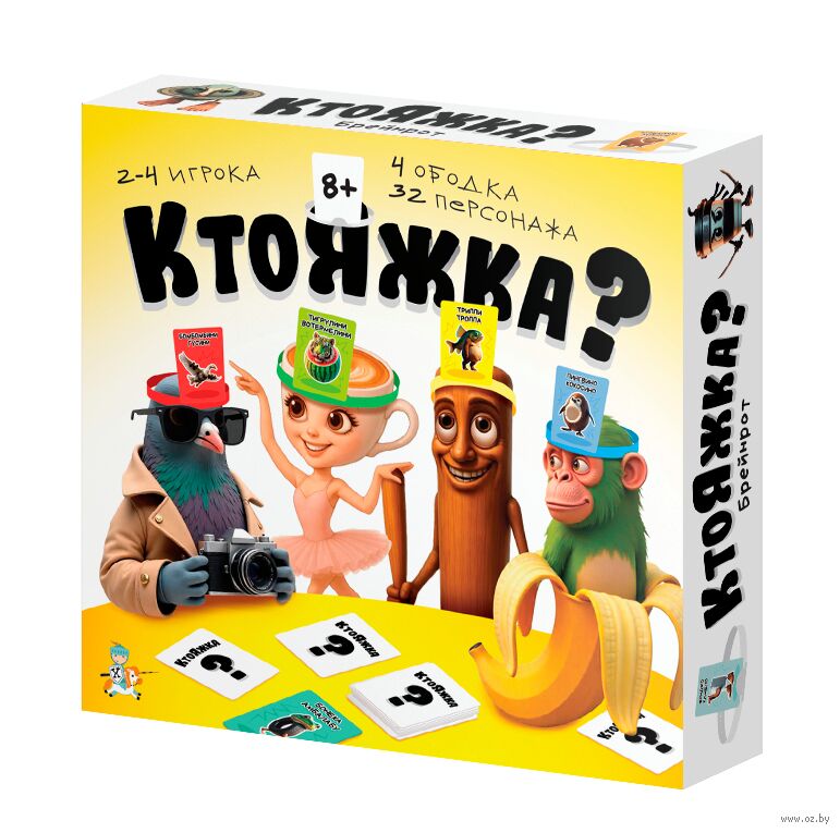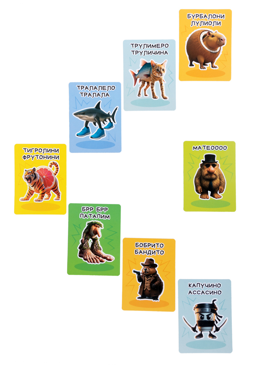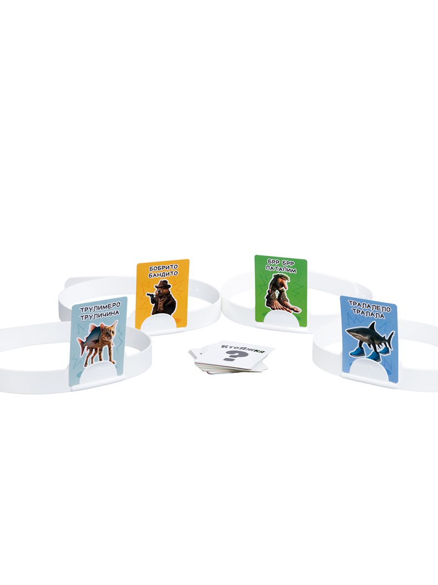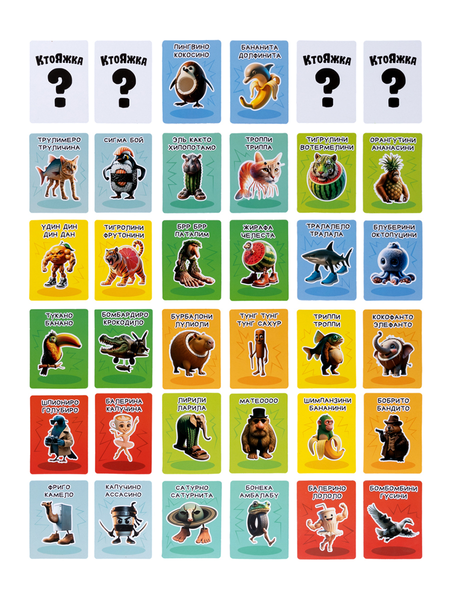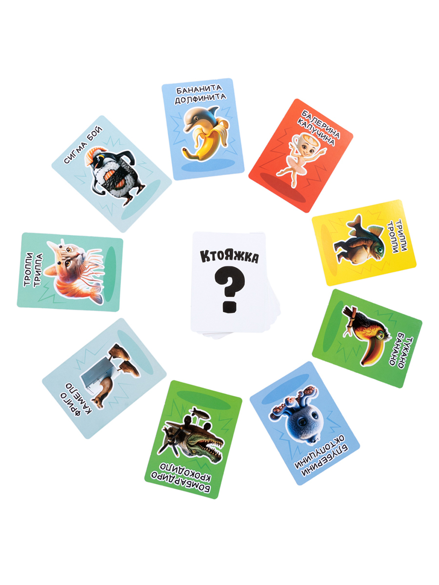 Погрузитесь в мир безудержного веселья с настольной игрой "Ктояжка" Брейнрот. Этот набор вдохновлен узнаваемыми итальянскими животными мемами, которые подарят вам массу удовольствия и смеха. Подготовьтесь к тому, что ваш друг может стать бобрито-бандито, а вы – балерина-капучина и придется выяснить, кем же вы являетесь, задавая наводящие вопросы другим игрокам.