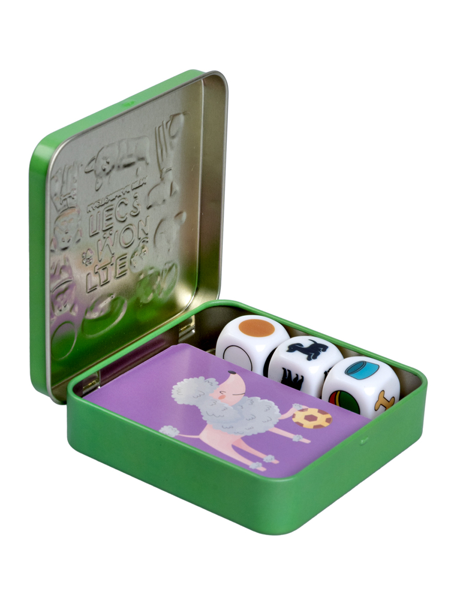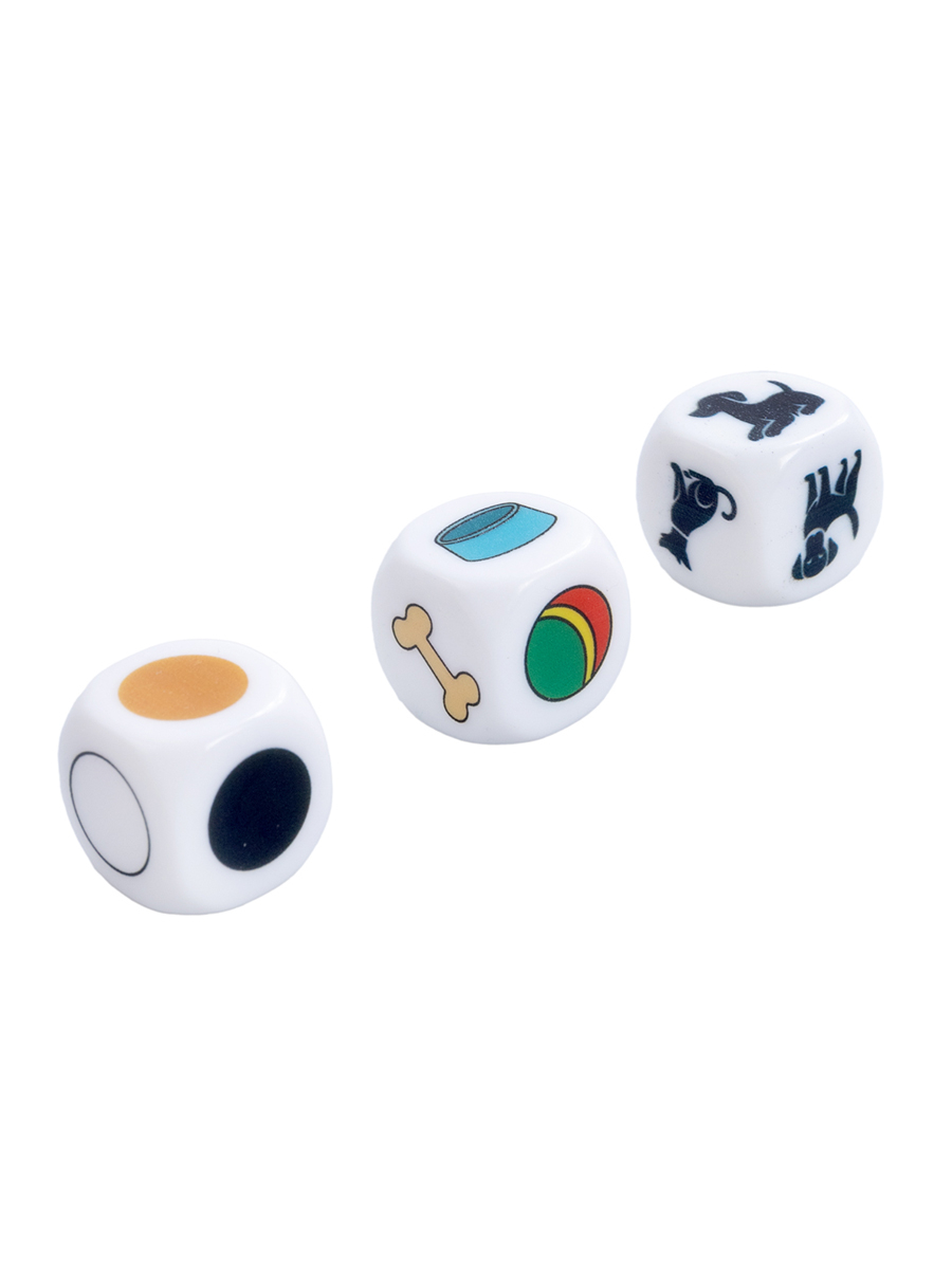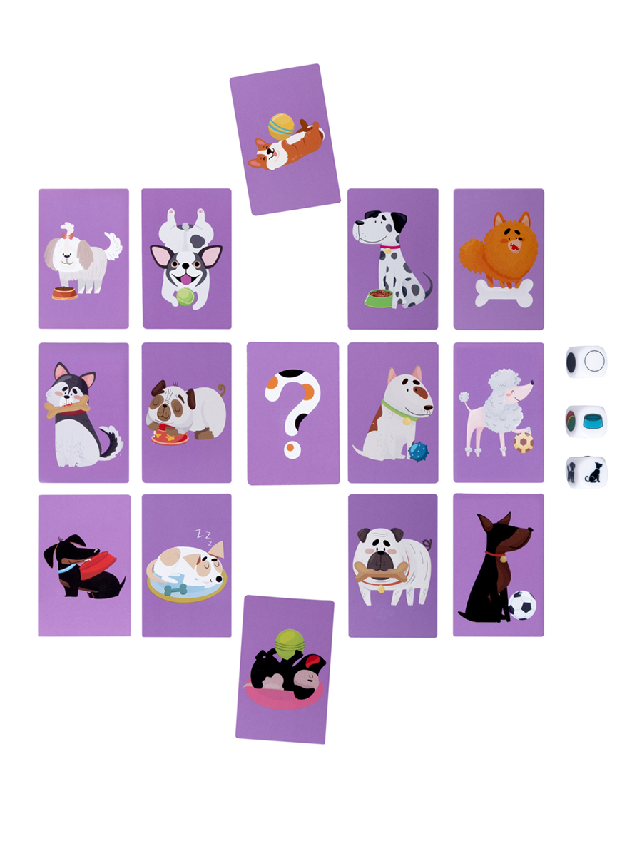 Перемешайте все карточки и разложите их на столе таким образом, чтобы образовался квадрат 7х4, в центре которого будет находиться карта-выручалка в виде вопроса. Участники по очереди кидают кубики. Результат броска определяет свойства, по которым игрокам нужно узнать собачку. Тот игрок, который узнал своего персонажа первым, накрывает карточку ладонью, проверяет, совпали ли символы, и забирает карту себе.